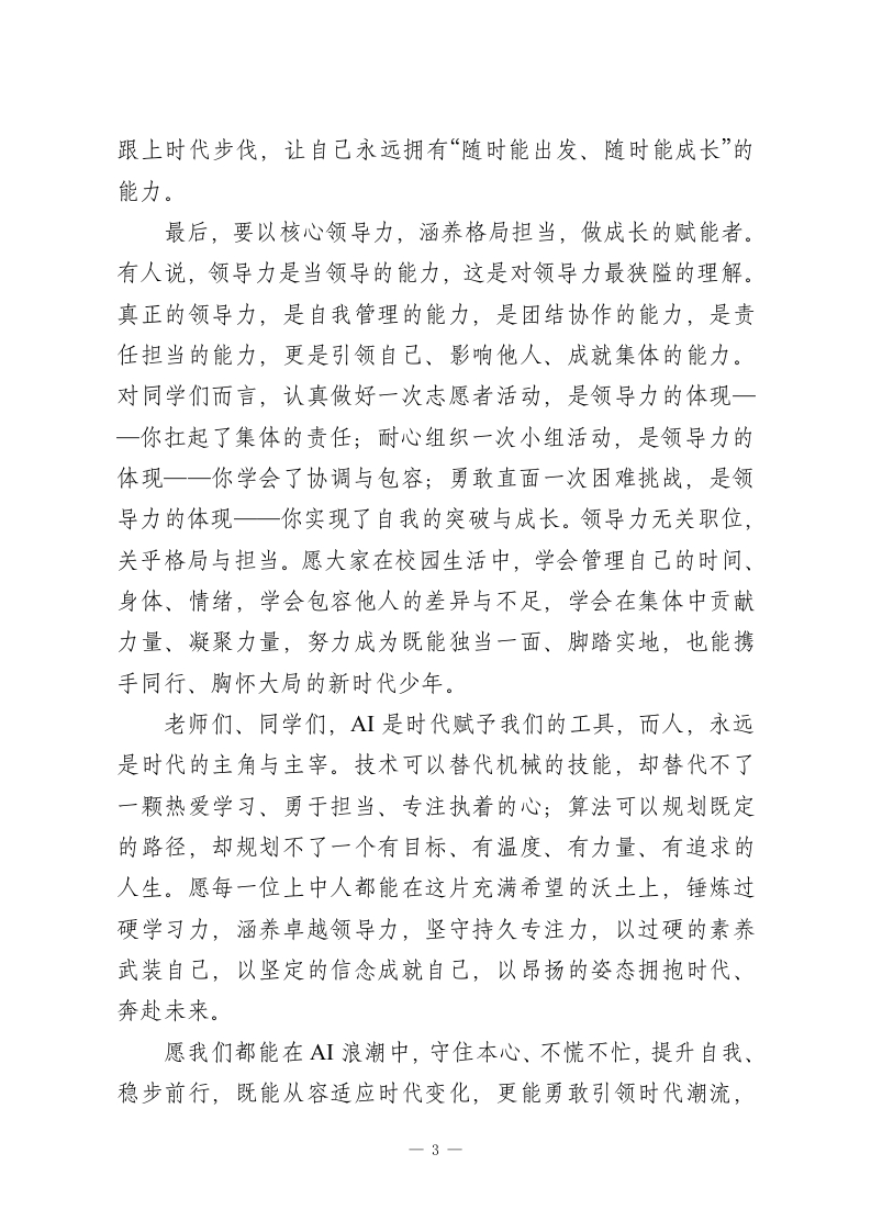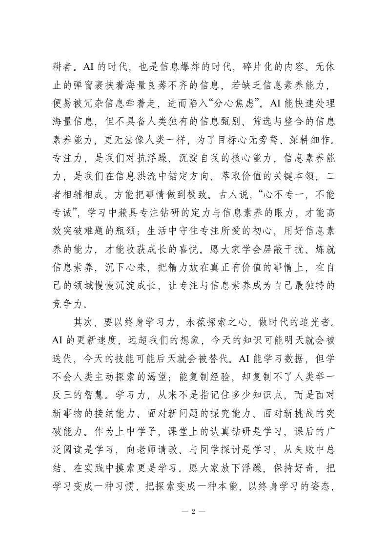 XX中学校长在升旗仪式上的讲话:以三力铸底色,于AI时代立潮头亲爱的老师们、同学们:大家早上好!一年来,全体上中人踔厉奋发、勇毅前行,圆满完成各项既定目标任务。我们的校园愈发雅致,卫生常洁常新,教室布置井然有序,图书馆如期开放,办学质量更是实现稳步攀升。2025年高考,我校再创辉煌,4名学子圆梦清华北大,600分以上达284人,位列全省第二;特控线上线1153人,本科上线1497人,一串串亮眼的数字,见证着上中学子的拼搏与荣光。学科竞赛赛场,我校学子崭露头角,摘得全国赛事2金3银,尽显扎实的学科素养;体育竞技舞台,我校健儿奋勇争先,女子足球队勇夺全省冠军、跻身全国第八,篮球队斩获全省亚军,绽放昂扬的青春风采。正是每一位上中人的锐意进取、默默奉献,凝心聚力、躬身耕耘,才铸就了今日上中的欣欣向荣、蓬勃发展。在此,我谨向每一位奋力拼搏、坚守初心的奋斗者,致以最崇高的敬意!身处一个AI技术飞速迭代,算法重构着生活,智能改变着未来的时代。我们该如何在未来社会站稳脚跟、绽放价值?今天,我想和大家聊聊三个关键词:学习力、领导力、专注力,这是A虹无法替代的素养,更是我们穿越时代浪潮、立足未来的底气。首先,要以持久专注力,炼就过硬信息素养,做领域的深1
