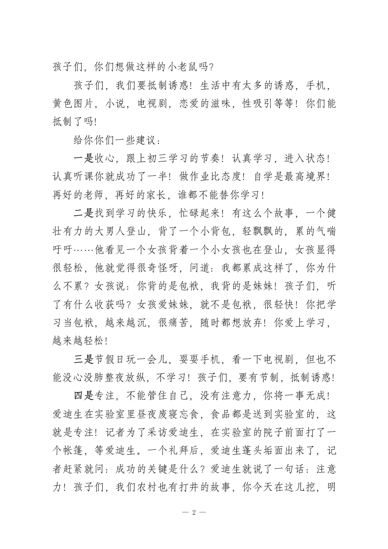 初三春季开学,初中校长讲了3句话吃苦,管住自己,相信自己同学们著名作家柳青说过:人生的道路虽然漫长,但要紧的只有几步,特别是他青年的时候,走错了会影响一个时期,甚至一生。现在的你们就到了人生的关键处,在冲刺的时刻,就要直奔目标!不要犹豫、不要彷徨、不要迷茫!只要努力什么时候也不晚!只要有梦想一切皆有可能!下面,我给大家分享三句话:吃苦、管住自己、相信自己01在该吃苦的时候一定要吃苦孩子们,我们在最好青春年华,要奋斗结果,让青春吐芳华,绝不能浪得虚名,混了个初三生,有啥意义?最忌讳“我拿青春赌明天”,在该吃苦的时候不吃苦,浑浑噩噩,行尸走肉,自己瞧不起自己!孩子们,网络上有一句话很流行,“人在江湖走,迟早要还的!”现在不吃苦,将来要吃大苦头!所以我们在初三孩子,一定要吃苦,拼搏!孩子们记住:幸福都是奋斗出来的!02管住自己,抵制诱惑,冲刺重点高中孩子们,你们一定不是叛逆期的孩子,你们长大了!叛逆不再是借口了,别活在梦里!有一句歌词,叫“老鼠爱大米”,老鼠掉进了小口的米缸,非常贪婪,抵制不住诱惑,没有早早筹划回归计划,米越吃越少,自己长肥了,很肥胖,从米缸的小口出不来了…悲剧啊!一1