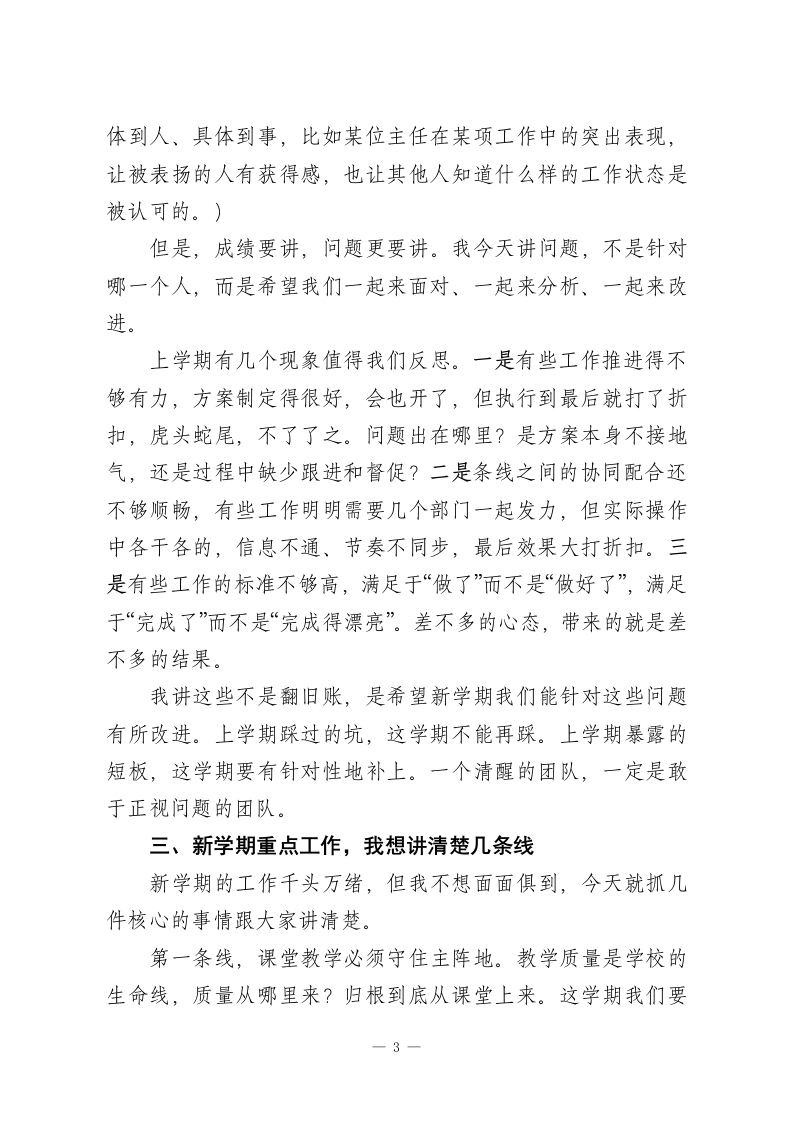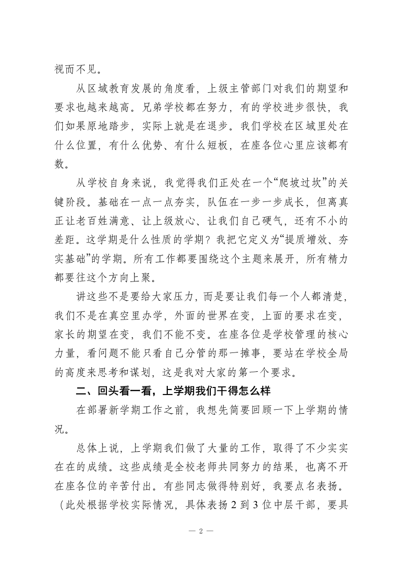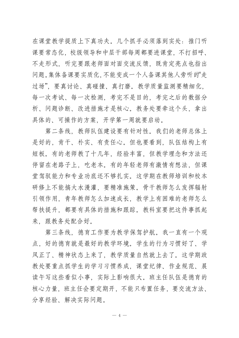 春季学期开学前中层会发言:看清形势、扛起担子、带好队伍,校长跟中层交了一次底各位主任、各位副主任:大家好。寒假过得很快,感觉年味还没散尽,新学期就到眼前了。今天把大家召集起来,是在全体教职工大会之前,我们核心团队先坐下来,把新学期的事情捋清楚、想明白。该统一的思想先统一,该明确的方向先明确,该部署的任务先部署。等全体会上,我们是要带着清晰的思路和饱满的状态去面对全体老师的,所以今天这个会很重要。我想跟大家谈五个方面的事情。一、看清大势,把我们的站位拉高一点开学前这几天,我一直在琢磨一个问题:我们这学期到底要干什么、怎么干、干到什么程度?要回答这个问题,不能只低头看自已脚下这一亩三分地,得先抬头看看外面的天。从大的政策环境来看,这两年教育领域的变化大家都有感受。新课标全面落地,对课堂教学提出了新的要求,核心素养导向不是一句口号,是要真正体现在每一节课、每一次作业、每一场考试里的。“双减”政策持续深化,校外培训这条路堵上了,家长的期望全部压回到学校,压回到课堂。教育评价改革也在推进,上级考核学校越来越看实绩、看质量、看内涵,不再只看你搞了多少活动、挂了多少牌子。这些大势,我们不能