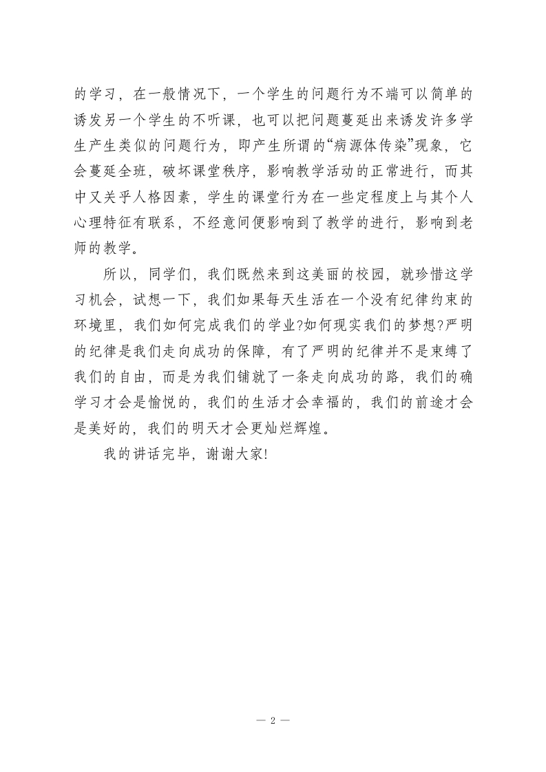 副校长在国旗下讲话爱学习,守纪律各位老师,同学们:大家早上好!今天我国旗下讲话的题目是《爱学习,守纪律》。常言到:“没有规矩,不成方圆。”无论各行各业,都将纪律、规章制度放在首要位置,纪律面前人人平等,如果学校没有制度的管理,大家没有纪律的约束,环境设施都只能是摆设,老师有一腔十情而无处可施,所以,制度的管理,纪律的约束是为了使校园变得文明安全,使课堂变得有序和引人入胜;因此,加强课堂纪律管理,对于维持良好的教学环境,保证课堂管理活动的顺利进行而具有重要意义。所谓学习纪律,主要是指对学生的课堂行为施加的外部控制与规则,良好的课堂纪律的形成不仅需要强制性的规则,更需要学生的自制的自律。因此,学生应自学发展纪律它是个体自学努力下由外部纪律内化而成的个体内部约束力,也就是自律、自我促成的纪律是课堂纪律管理的最终目的,当一个学生能够自律并客观评价他自己和集体的行为标准时,便意味着能够成为新的更好的集体标准做了贡献,同时也标志着学生的成熟水平大大的提高了。还有一个问题便是课堂行为问题了,一般指发生在课堂上与课堂行为规范和教学要求不一致并影响正常课堂秩序及教学效率的课堂行为,这样的行为不仅影响学生的身心健康,而且常常引起课堂纪律问题,影响教学质量,一个学生的不良课堂行为不只影响他自己的学习,同时也可以破坏课堂上其他学生1