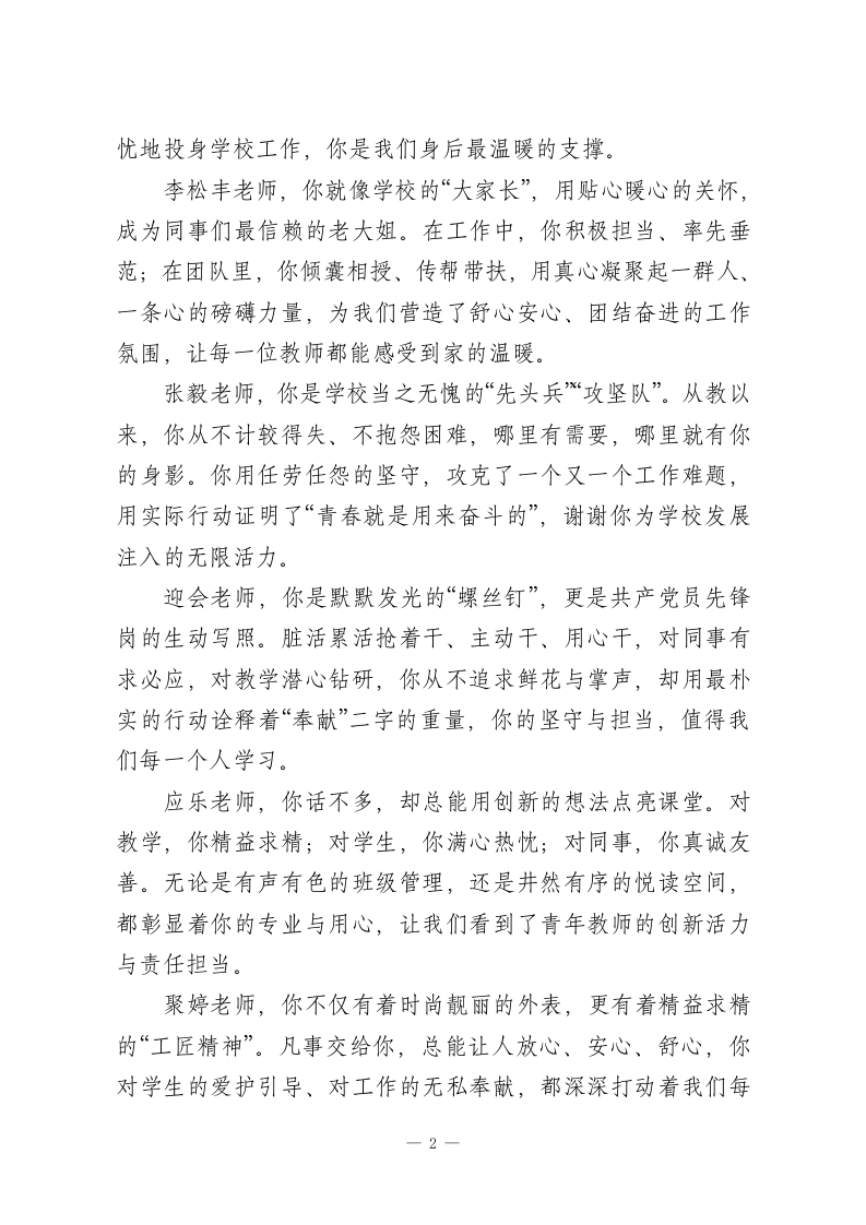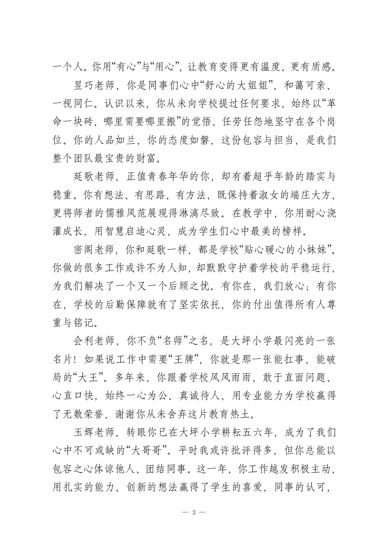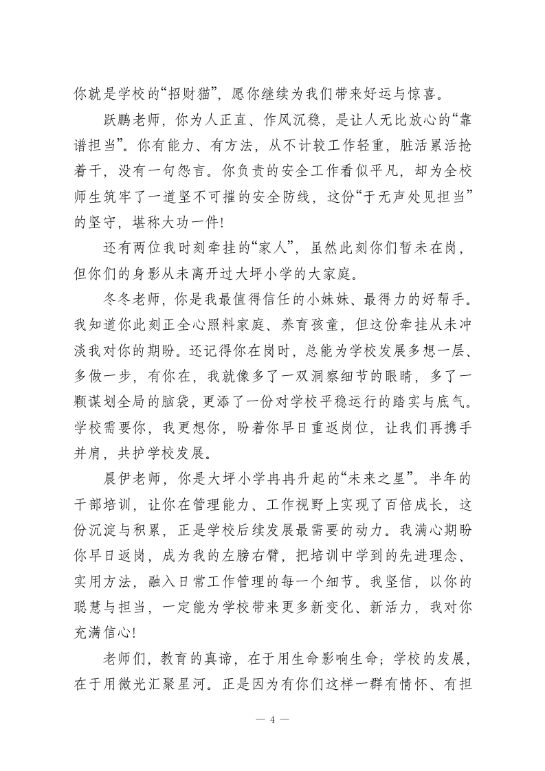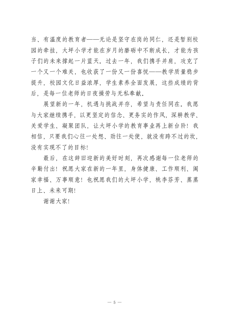 小学校长在2025-2026学年度第一学期期末总结会上的讲话:微光聚星河同心向新程尊敬的各位老师:大家晚上好!岁序更替,华章日新。在这辞旧迎新的美好时刻,我们齐聚一堂,共同回顾大坪小学这一年来的耕耘与收获,也向每一位为学校发展倾心付出的同仁,致以最诚挚的感谢与最崇高的敬意!教育是一场温暖的修行,而我们的教师队伍,正是这场修行中最坚定的同行者。过去一年,学校的每一点进步、每一份成绩,都凝结着大家的智慧与汗水、坚守与奉献。今天,我想特别为我们身边这些闪光的身影,送上最真切的赞誉:淑凤老师,你是一年级孩子们心中最温暖的港湾,更是学校发展最坚实的基石。作为母亲,你心中牵挂着自家孩童,却始终把更多精力倾注在校园这片沃土,用“舍小家顾大家”的担当,用积极负责、富有主见的工作态度,为孩子们的启蒙之路保驾护航,也为学校的长远发展筑牢了根基。牛艳艳老师,你用“敬业”与“本分”诠释着教师的初心,更用“不越位、不干预”的清醒,为学校管理增添了一份从容。作为校长家属,你从未因特殊身份寻求便利,反而以任劳任怨的作风深耕教学,以温柔坚韧的付出守护家庭,让我能毫无后顾之
