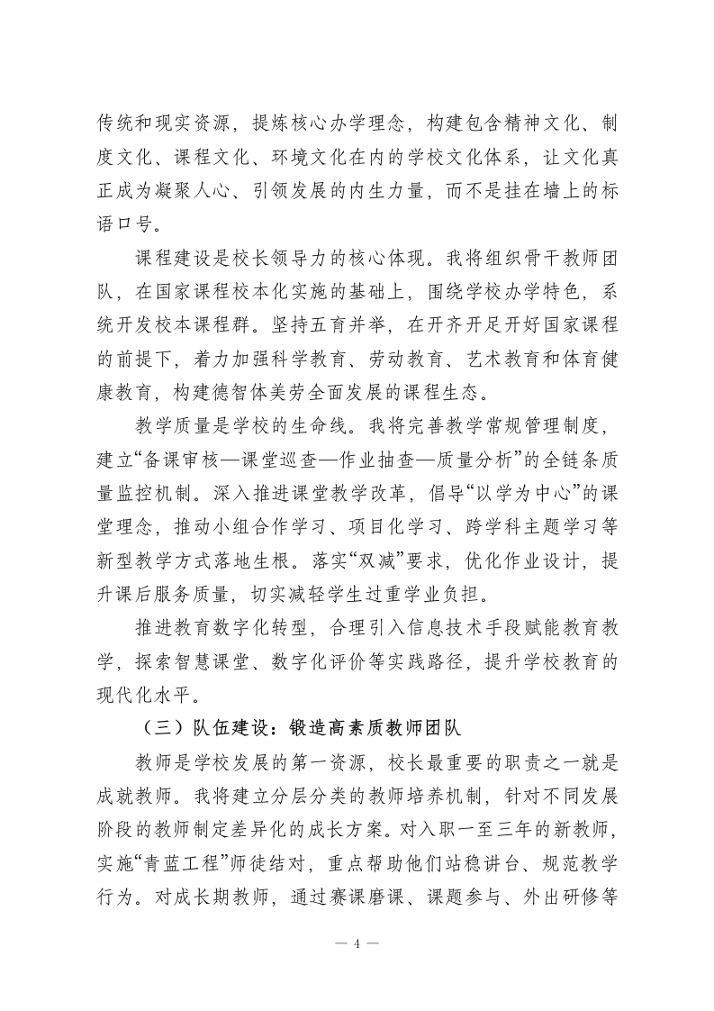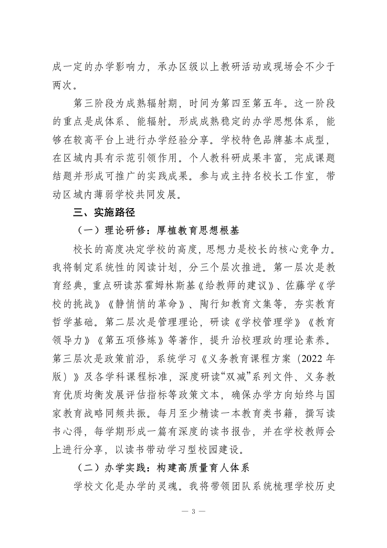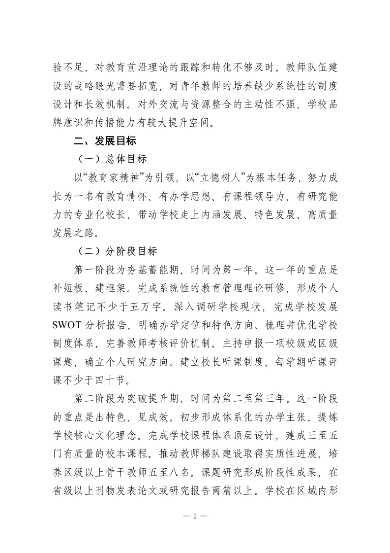 校长个人专业发展规划:3个阶段、5大路径,这样写才叫专业教育是一场静待花开的修行,校长是学校发展的领航者与教师成长的助推者。立足新时代教育改革背景,面对“双减”政策深入推进、义务教育优质均衡发展、教育家精神引领等新要求,作为学校管理者,我深感责任重大、使命光荣。为进一步明确发展方向,提升专业素养与治校能力,实现从“管理型校长”向“教育家型校长”的转变,特制定本规划。一、自我分析(一)个人优势长期扎根基础教育一线,经历了从教师到中层管理者再到校长的完整成长链条,对教育教学规律有较为深刻的认知,对学校管理的各个环节比较熟悉。工作中注重调查研究,善于倾听师生和家长的声音,决策时力求接地气、可操作。重视团队建设,倡导民主管理,与班子成员和教师之间形成了较为和谐的工作关系。有较强的学习意愿,愿意接受新理念、尝试新做法,在课程建设和教学改革方面做过一些有益探索。(二)存在不足办学思想的系统性和深度有待提升,对“办一所什么样的学校、培养什么样的人”这一根本问题的思考还不够清晰,尚未形成鲜明的、可辨识的办学主张。课程领导力不够强,学校课程体系的顶层设计能力欠缺,校本课程开发还停留在零散状态,缺乏整体规划。教科研引领能力薄弱,个人主持课题研究的经1