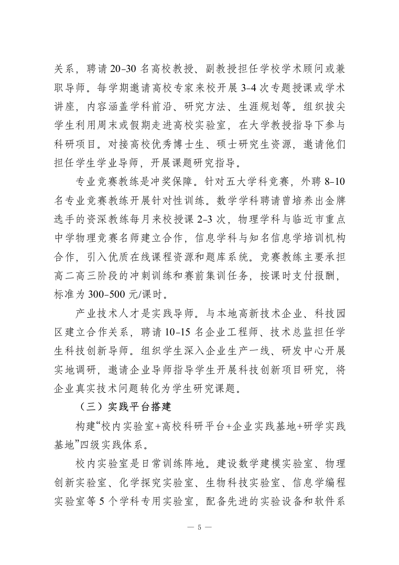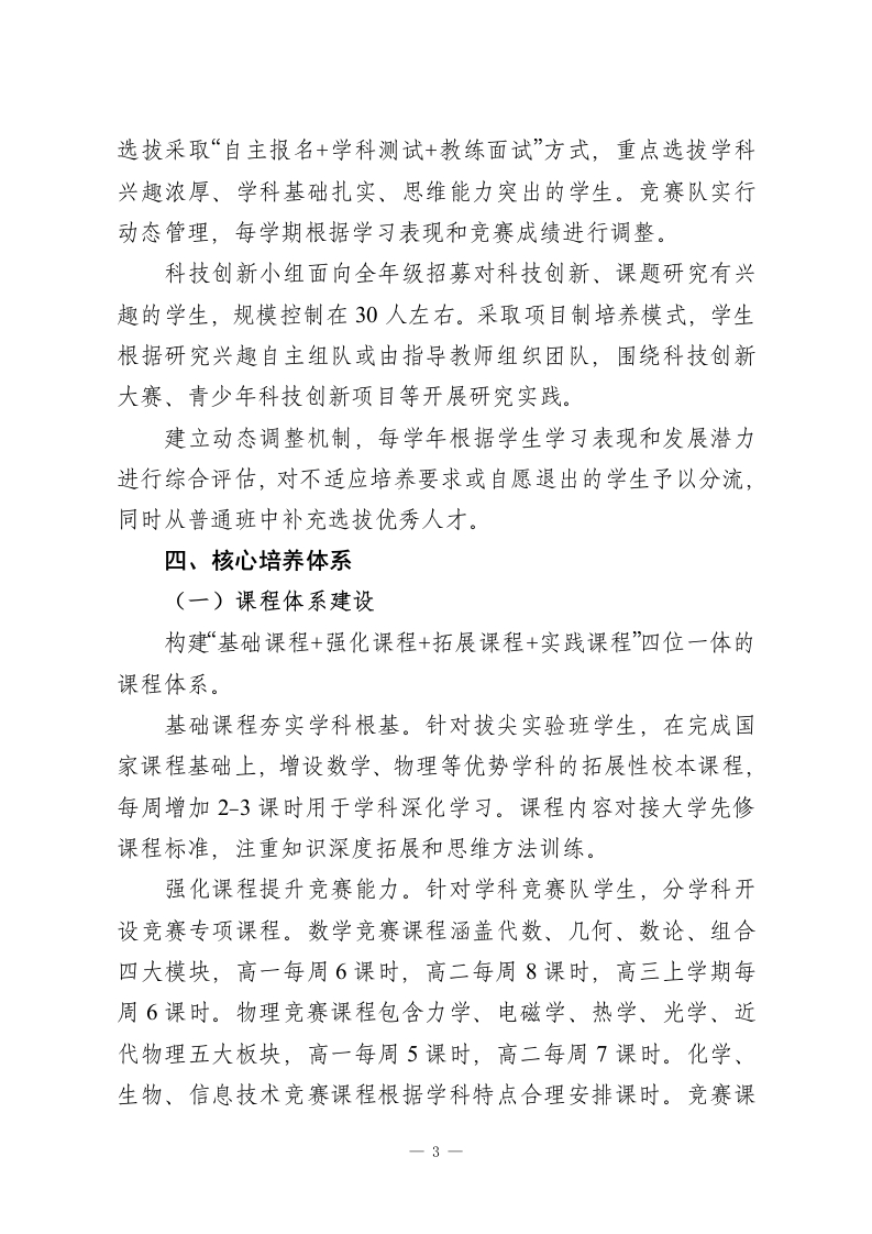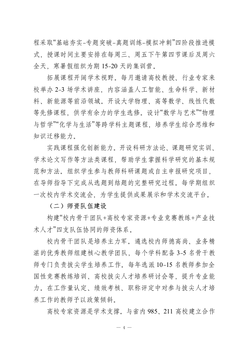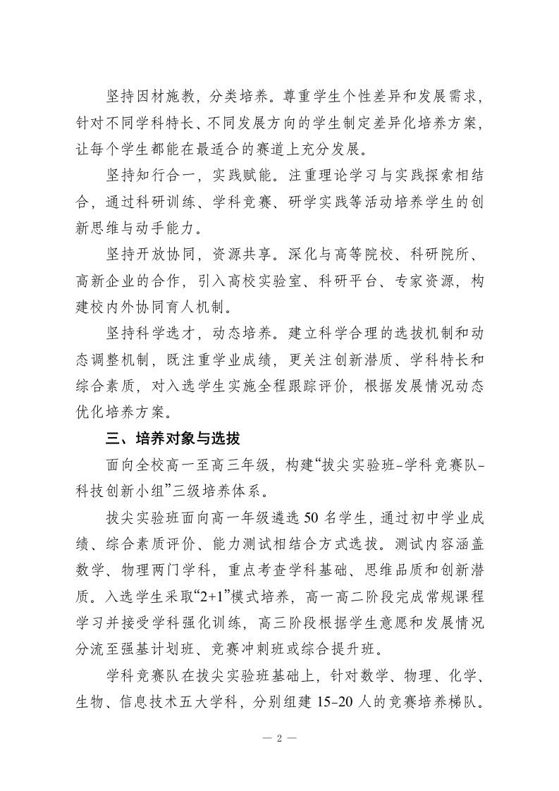 学校拔尖创新人才培养实施方案为深入贯彻落实中共中央、国务院《教育强国建设规划纲要(2024一2035年)》精神,全面落实教育部等六部门《关于实施基础学科拔尖学生培养计划2.0的意见》以及省市关于加强拔尖创新人才贯通培养的文件要求,结合我校办学实际,特制定本方案。一、指导思想与培养目标全面贯彻党的教育方针,落实立德树人根本任务,遵循拔尖创新人才成长规律,以培养学生核心素养为主线,以强化创新能力为重点,构建大中衔接、科教融汇的育人体系。着力培养一批具有家国情怀、学科特长和创新潜质的拔尖人才,为高等院校输送高素质生源,为国家重大战略领域储备后备力量。培养目标聚焦三个维度:一是铸牢理想信念之基,将思想政治教育贯穿培养全过程,培养学生科技报国、勇于担当的时代精神;二是夯实学科素养之根,系统强化数学、物理、化学、生物、信息技术等基础学科能力,构建扎实的知识体系与科学思维模式;三是锻造创新实践之能,通过项目式学习、科研训练、学科竞赛等载体,强化学生的创新思维、探究能力和实践本领。二、基本原则坚持立德树人,育人为本。把德育放在首位,将价值引领贯穿人才培养全过程,引导学生成长为有家国情怀、有社会责任、有创新精神的时代新人。一1