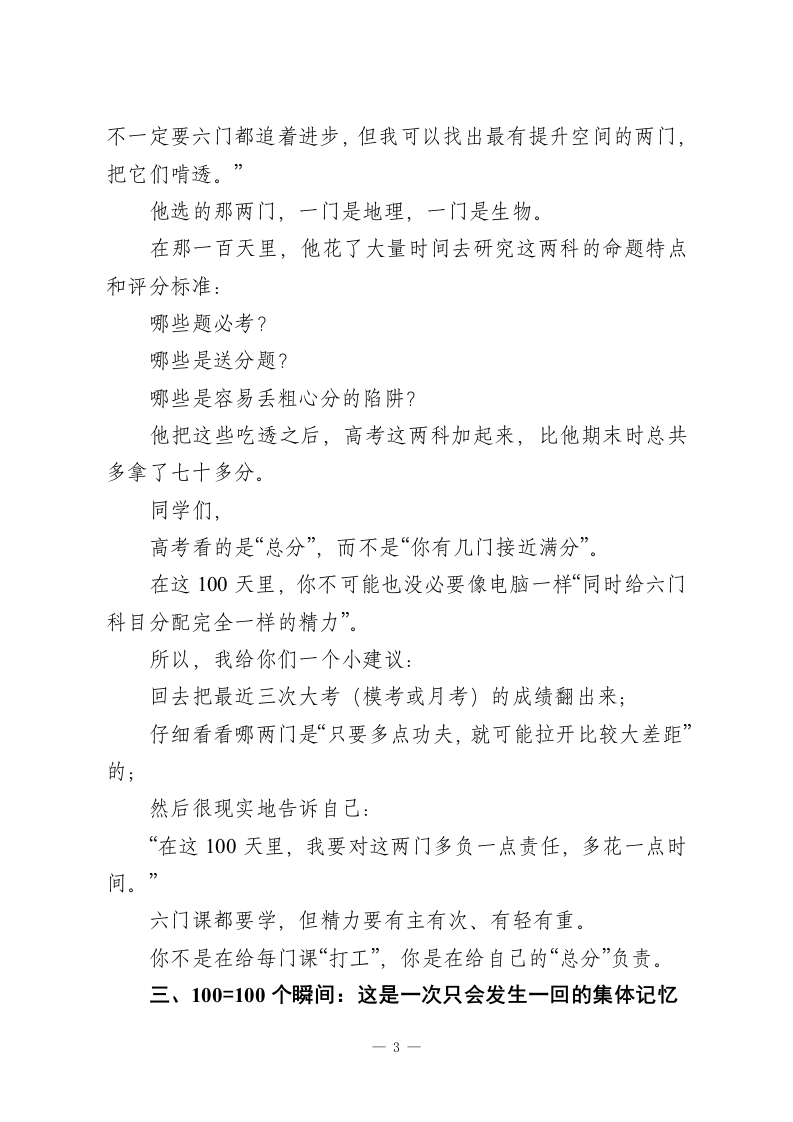 在2026届高考百日誓师大会上的讲话:我来跟大家分享一个真实的事件!同学们:在正式开始之前,我先做一件小小的事。(走到黑板,写下:100=?)别紧张,这不是临时测验,也不会记分。我只是想请你们和我一起,算一道“关于未来一百天”的题。这道题的答案不止一个,我们一条一条来“解”。一、100=30+70:先把时间拆开,再谈怎么用先看第一个等式:100=30+70。什么意思?就是把接下来的100天,分成两段来看:前30天,和后70天。前30天:收心、找回节奏的“调整期”春节刚过去没多久,说实话,现在坐在教室里的你们,身体可能在这里,心还半截挂在老家的被窝里、手机的世界里。这不是什么“罪过”,每一届高三都会有这么一个过程,你们的学长学姐也都是这么过来的。人不是机器,不可能说切换就瞬间切换。这30天,就是给自已一个“慢慢进入状态”的窗口:可以有一点不适应,但每天要比前一天更认真一点:可以有一点走神,但要学会把自己一点点“拉回来”;目标很简单:到第30天的时候,把自己调整回去年11月1