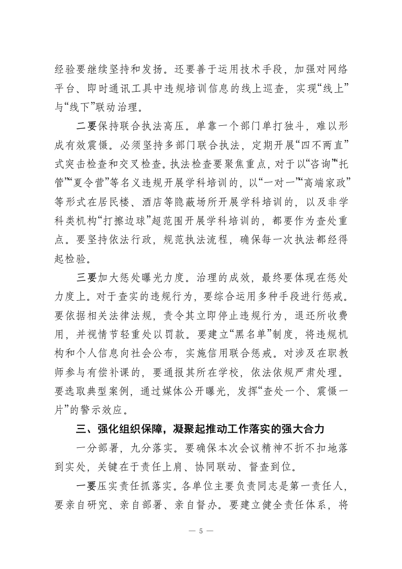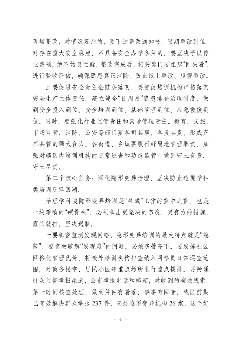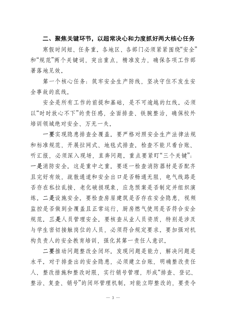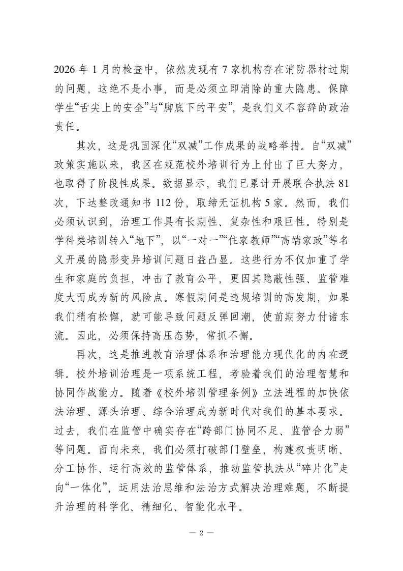 在XX区2026年寒假校外培训机构安全生产暨治理工作部署会上的讲话同志们:今天,我们在这里召开全区寒假校外培训机构安全生产暨治理工作部署会,主要任务是深入贯彻落实上级相关会议精神,分析当前我区面临的形势与挑战,对寒假期间的重点工作进行全面部署。刚才,相关部门已经传达了有关文件精神,提出了具体要求,我都同意。下面,我再强调三点意见。一、提高政治站位,深刻认识新形势下校外培训治理的极端重要性校外培训治理工作,事关立德树人根本任务,事关广大学生和家庭的切身利益,事关社会和谐稳定大局。当前,正值2026年寒假的关键节点,学生假期安全和“双减”工作成果巩固面临新的考验,我们必须从政治和全局的高度,充分认识到抓好这项工作的特殊重要性和现实紧迫性。首先,这是践行以人民为中心发展思想的必然要求。学生的安全与健康成长,是每一个家庭最大的期盼,也是我们一切工作的出发点和落脚点。校外培训机构作为重要的教育服务提供者,其安全状况直接关系到千家万户的幸福安宁。近期,全国范围内一些安全事故的发生,为我们敲响了警钟。我们必须清醒地看到,校外培训机构作为人员密集场所,普遍存在消防安全主体责任不落实、设施器材管理不规范、从业人员应急能力不足等风险。XX区虽然在前期排查中取得了一定成效,但在—1