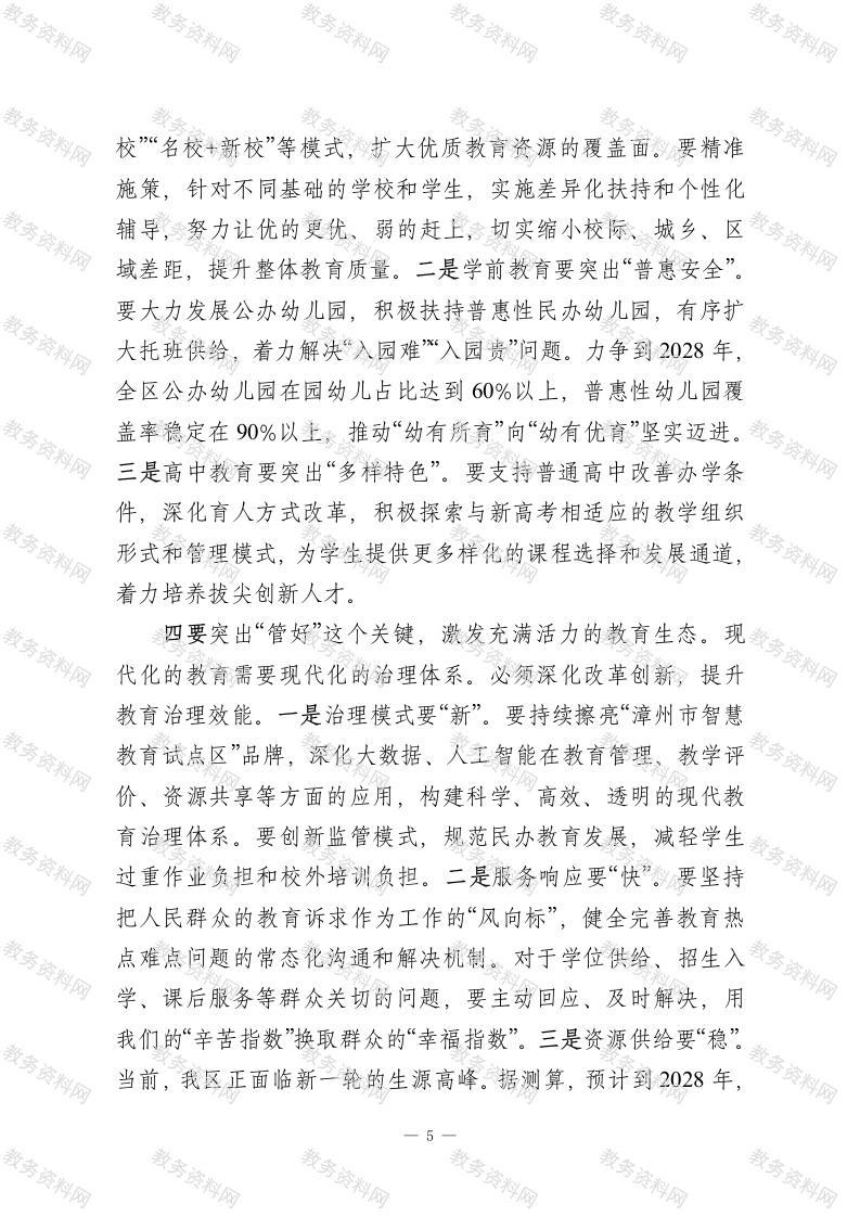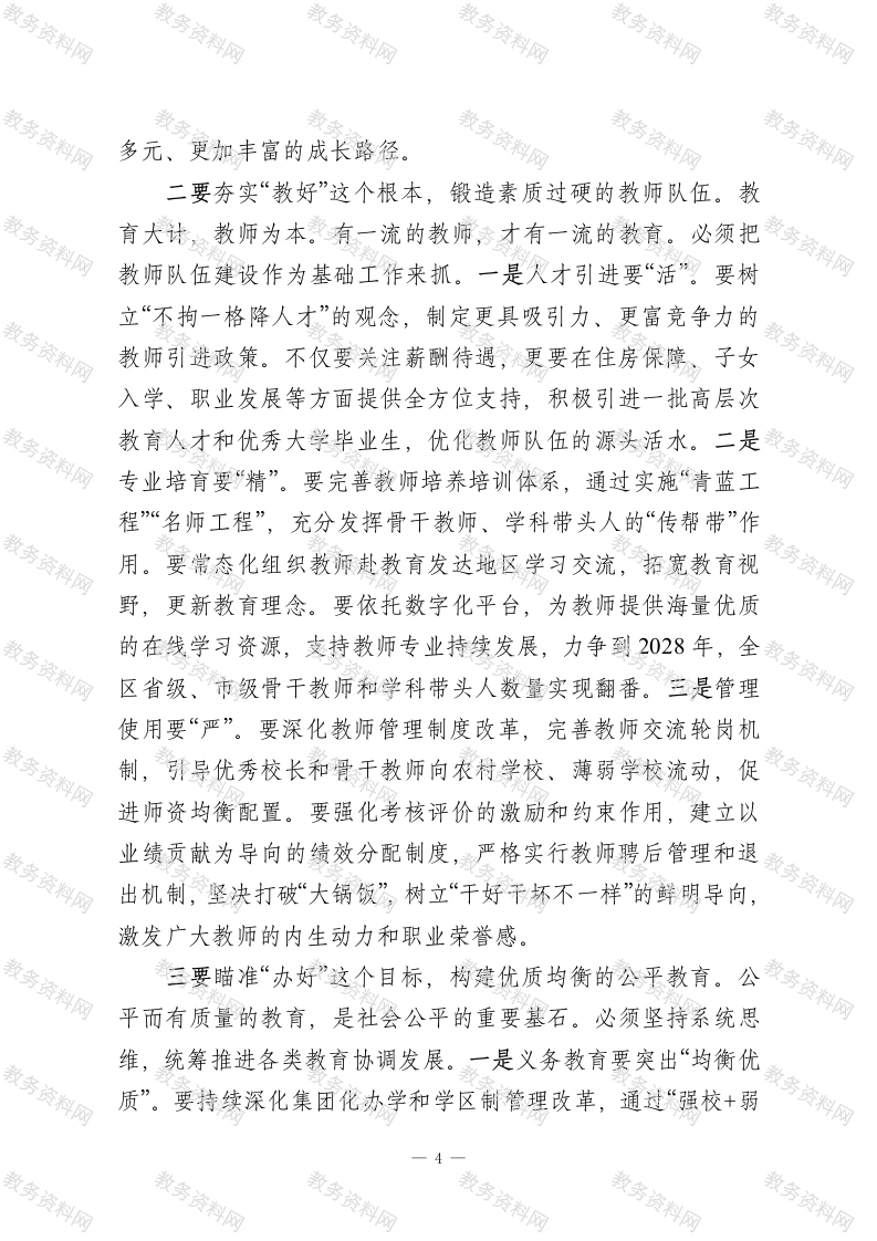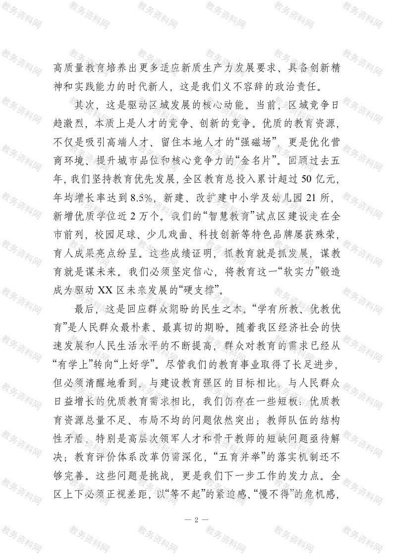 在XX区教育高质量发展推进会上的讲话同志们:今天,我们在此召开全区教育高质量发展推进会,主要任务是深入学习贯彻党的二十届四中全会精神与习近平总书记关于教育工作的重要论述,全面落实国家、省、市关于建设教育强国的战略部署,总结成绩,分析形势,明确任务,动员全区上下以更高站位、更大力度、更实举措,奋力开创我区教育事业高质量发展新局面,为加快建设“XX创智新城XX首善家园”提供坚实的人才保障和智力支撑。刚才,相关部门和学校代表作了很好的发言,讲了成绩、谈了思路,听了很受启发。下面,我讲三点意见。第一,统一思想,锚定方向,深刻认识推进教育高质量发展的战略意义教育是国之大计、党之大计。一个地区的发展,短期靠项目,中期靠政策,长期靠人才,而人才的根基在教育。全区各级各部门必须从战略和全局的高度,深刻把握新时代教育工作的历史方位和使命任务,切实增强投身教育强区建设的责任感和紧迫感。首先,这是服务国家战略的政治要求。党的二十届四中全会璧画了以中国式现代化全面推进中华民族伟大复兴的宏伟蓝图,明确指出教育、科技、人才是全面建设社会主义现代化国家的基础性、战略性支撑。我区作为改革开放的前沿阵地和产业转型升级的关键节点,必须把教育发展放在优先位置,通过1