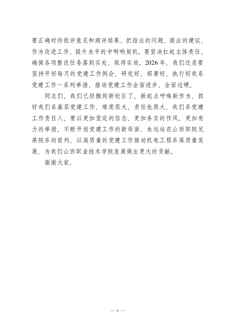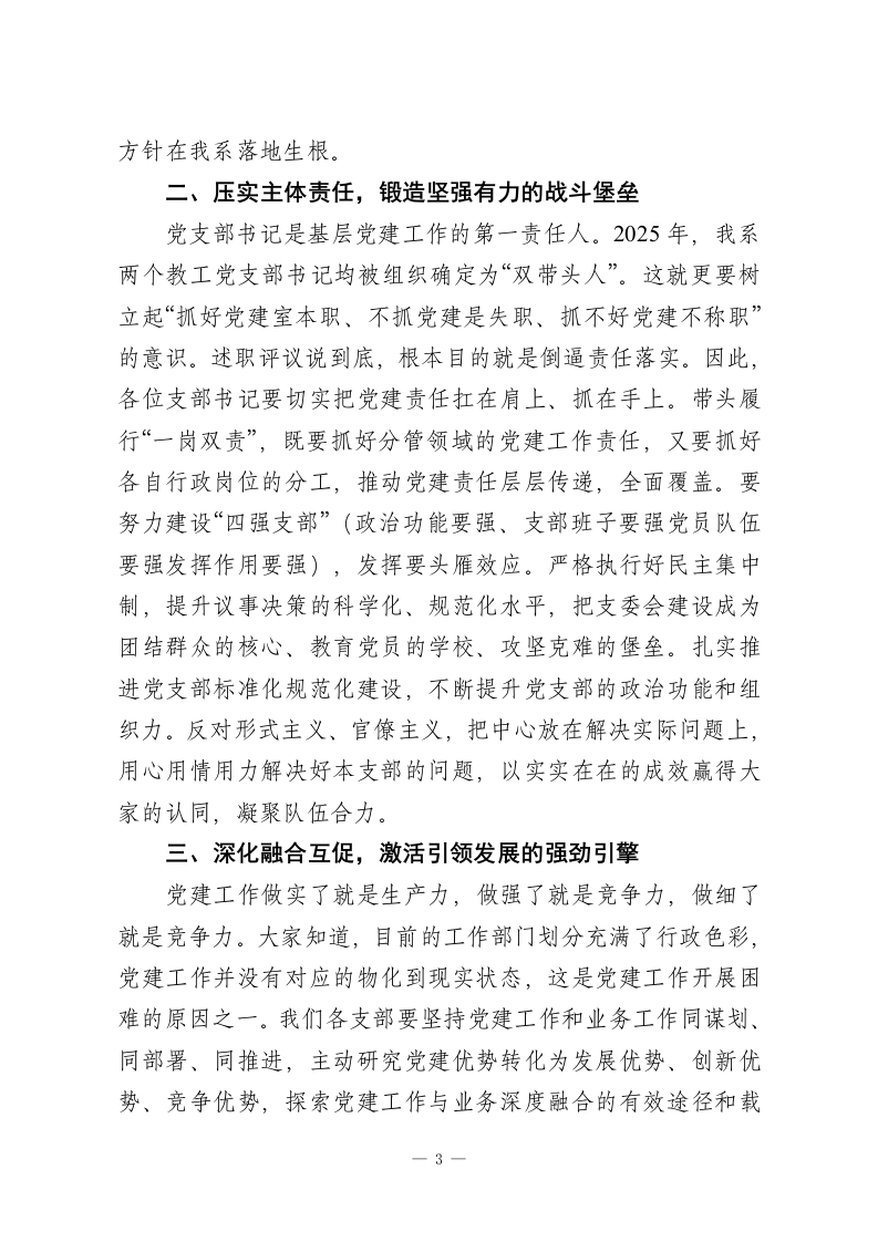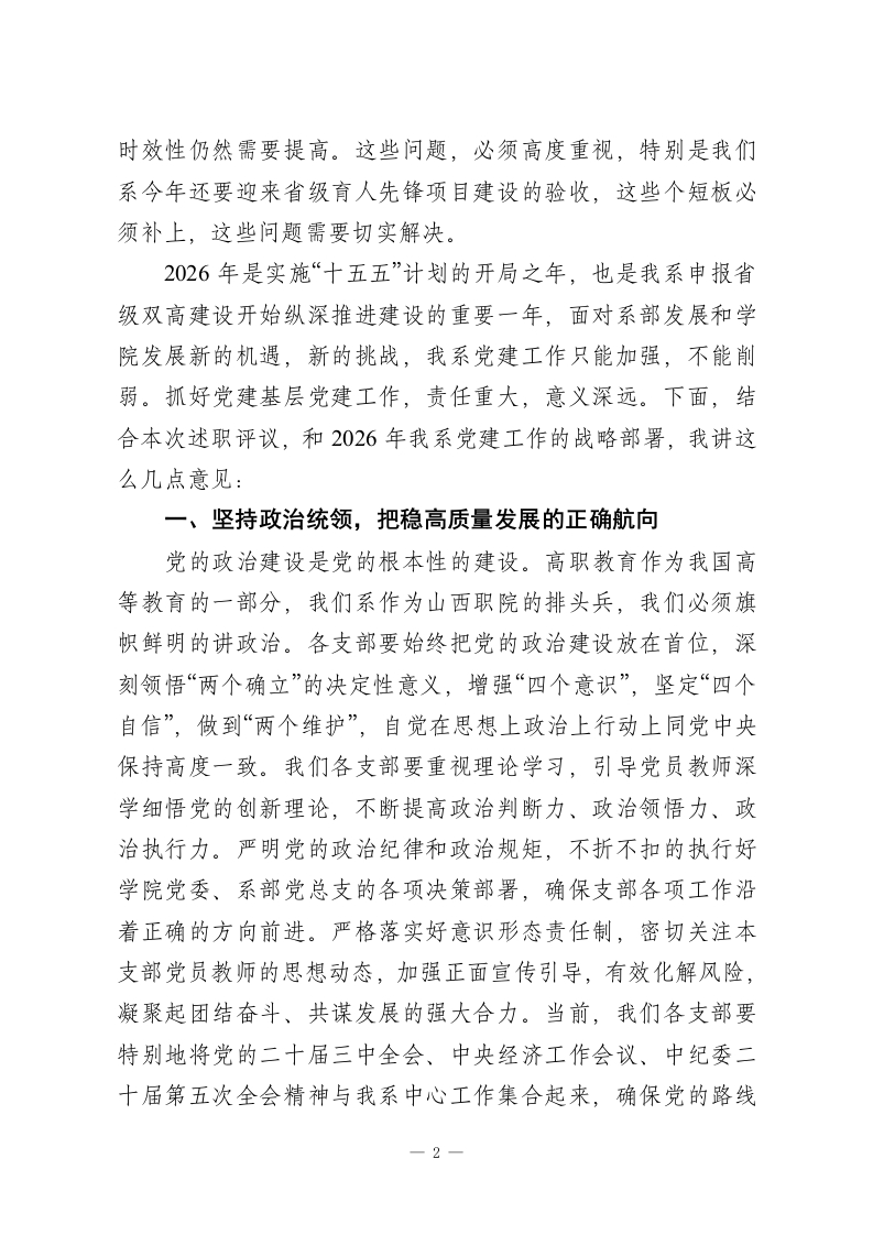 在XX系2025年党支部书记抓党建工作述职评议会议上的讲话同志们:按照学院组织部门的要求,今天我们召开2025年度党支部书记抓党建工作述职评议会议。会议听取了各党支部书记的现场述职,班子成员做了主题点评,总体来看,这次会议准备充分、组织严密,述职报告聚焦主责,剖析深刻,坦诚中肯,达到了预期效果,是一次严肃认真的党内政治生活实践,是一次压实管党治党政治责任的有效传导。过去一年,面对学院党委“迁建购改升”的中心任务,面对我系繁重艰巨的改革发展任务,各支部坚持以党的创新理论武装头脑、指导实践、推动工作,紧紧围绕系部技能大赛、双高申报、五金建设、招生就业、学生管理等中心任务,持续深化党建与业务融合,团结带领各支部的党员教师们攻坚克难、锐意进取,为系部高质量发展提供了坚强的政治保证和组织保证。在此呢,我代表系部党总支,向各位支部书记和全体党员教师表示衷心的感谢。肯定成绩的同时,必须看到我们系党建工作存在的短板和不足。从述职和日常掌握的情况来看,一些深层次的问题依然存在,总体来看,支部政治功能和组织功能发挥还不够充分,围绕中心工作、服务大局的切入点和着力点找的不准,党的政治优势、组织优势没有充分的转化为发展优势;党建引领发展的优势转化效能有待进一步提升,部分党支部书记破解党建难题、推动工作创新的能力有待加强,党员教育管理的针对性、1