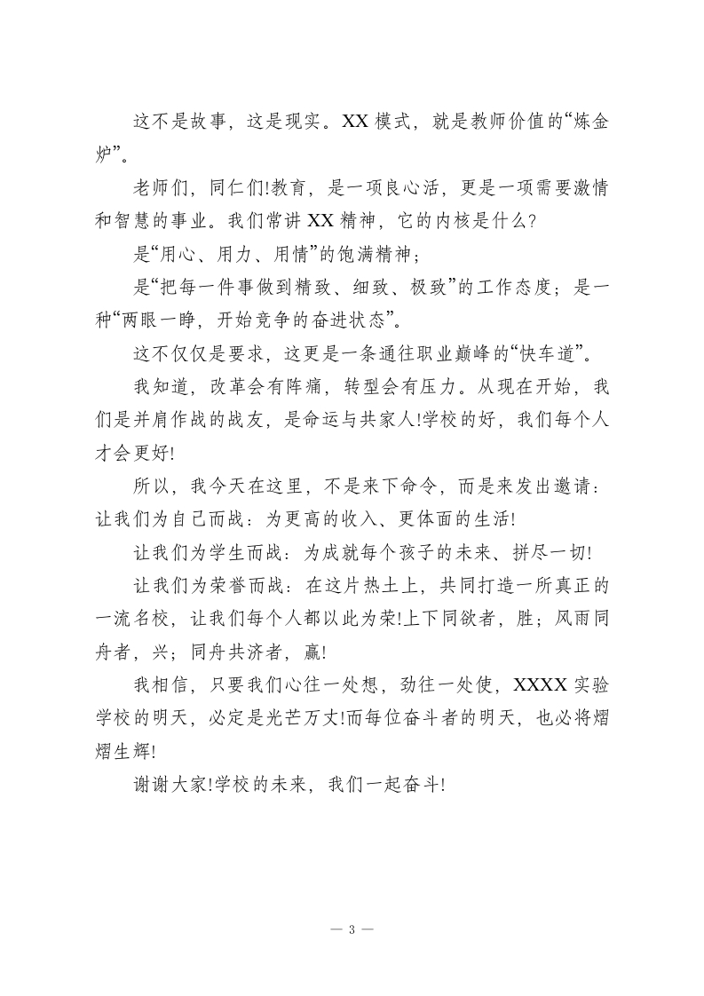 在XX县XX教育管理示范校全体教师大会上的讲话各位老师,各位领导:大家晚上好!今天坐在这里的,很多都是XX学校的“老功臣”,是你们用多年的心血,撑起了这片教育天地。在此,向大家的坚守和付出,致以最诚挚的敬意!谢谢你们!我是第一次和大家见面。我听说,最近学校里有些声音,有些不安和猜测。有人说:“XX的人来了,规矩要变了,管得要严了,会不会动不动就扣钱?我们的工资会不会不升反降?”我想说,老师们,有这种想法,很正常!面对任何改变,人本能的第一反应就是不安和担忧。这说明大家热爱这份工作、热爱这所学校,因为热爱,才会在乎,因为在乎,才会焦虑。我于此也看到了我们学校的真正的希望,是所有教师对学校的热爱和对职业的热爱。今天,我打开天窗说亮话,实实在在地回应大家的关切。我要明确地告诉大家一个最核心的事实:我们XX团队来到这里,不是为了让大家收入降低,恰恰相反,我们的首要目标之一,就是要想尽一切办法,让每一位敬业、优秀的老师,获得与你们的付出相匹配的、更高的收入!因为XX模式的底层逻辑,不是“克扣”,而是“激励”;不是“压榨”,而是“成就”。我们带来的,是一套让“能干者、多劳者、优秀者”真正能“多得”的机制。一1