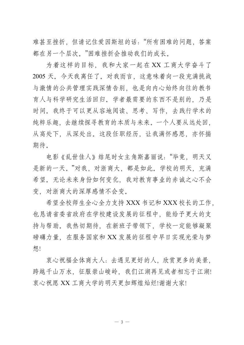 在某高校干部教师大会上的离任讲话刚才,X部长代表省委宣布了学校党委书记任命的决定,我坚决拥护省委决定,热烈欢迎XXX同志担任XX工商大学党委书记!同时,向五年半来与我并肩作战的班子成员、全体中层干部、广大师生员工,表达最诚挚的感谢和最衷心的祝福!德国诗人荷尔德林写过,所有离别的人说起话来都像醉汉。此刻的我,虽未醉酒,却也满心都是不舍与眷恋。我真的做不到,挥挥手不带走一片云彩。回首在浙商大的五年半时光,它不仅是一段职务经历,更是一场与理想使命、与无数美好灵魂的相遇。接下来的日子,我要和校园里的一个个人,一幢幢楼,一棵棵树,一只只天鹅,去告别。此时此刻,我由衷感谢省委省政府的信任,以及不拘一格的干部选用政策,让我完整干满了一届,由于换届推迟还延了半年;让我有机会能够在浙商大这样一所承载“全国有位置,全省很重要”使命的百年学府,践行一名教育者的初心。自接到省委任命,从2020年7月29日到今天,整整2005个日夜,这一公共管理学术研究与体验实践的时光,不仅对于我学术研究的拓展,而且对于我人生价值的实现,都是至关重要的时光。我将永远铭记!茨威格在《人类群星闪耀时》中说,人生中最大的幸事,莫过于在富于创造力的壮年发现了自己的使命。五年半来,我心怀感恩之心,不敢有一天懈怠。特别感谢与我并肩作战的你们一一每一位校领导班子成员、全体中层干部和全校师生,是你们的智慧、担当与情怀,让浙商大在时代浪潮中稳步前行、1