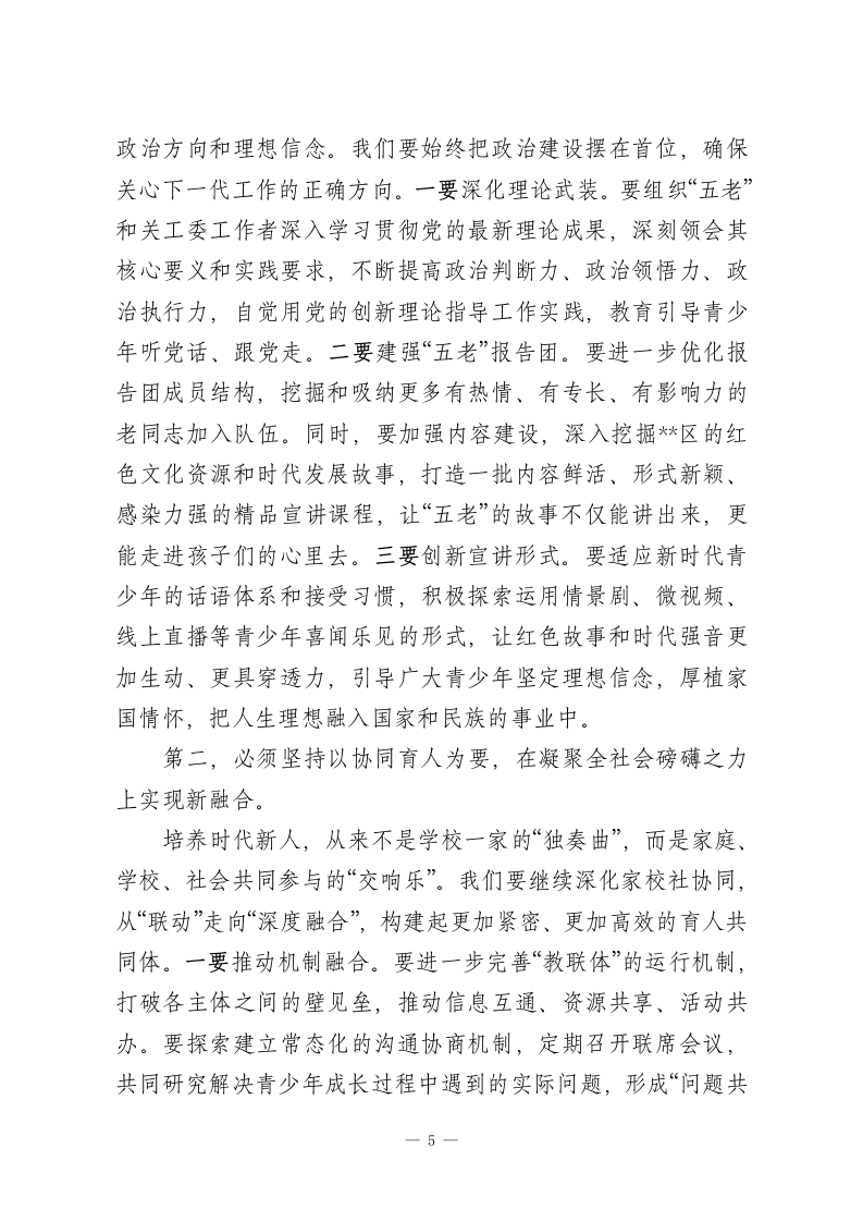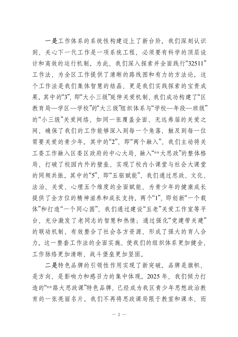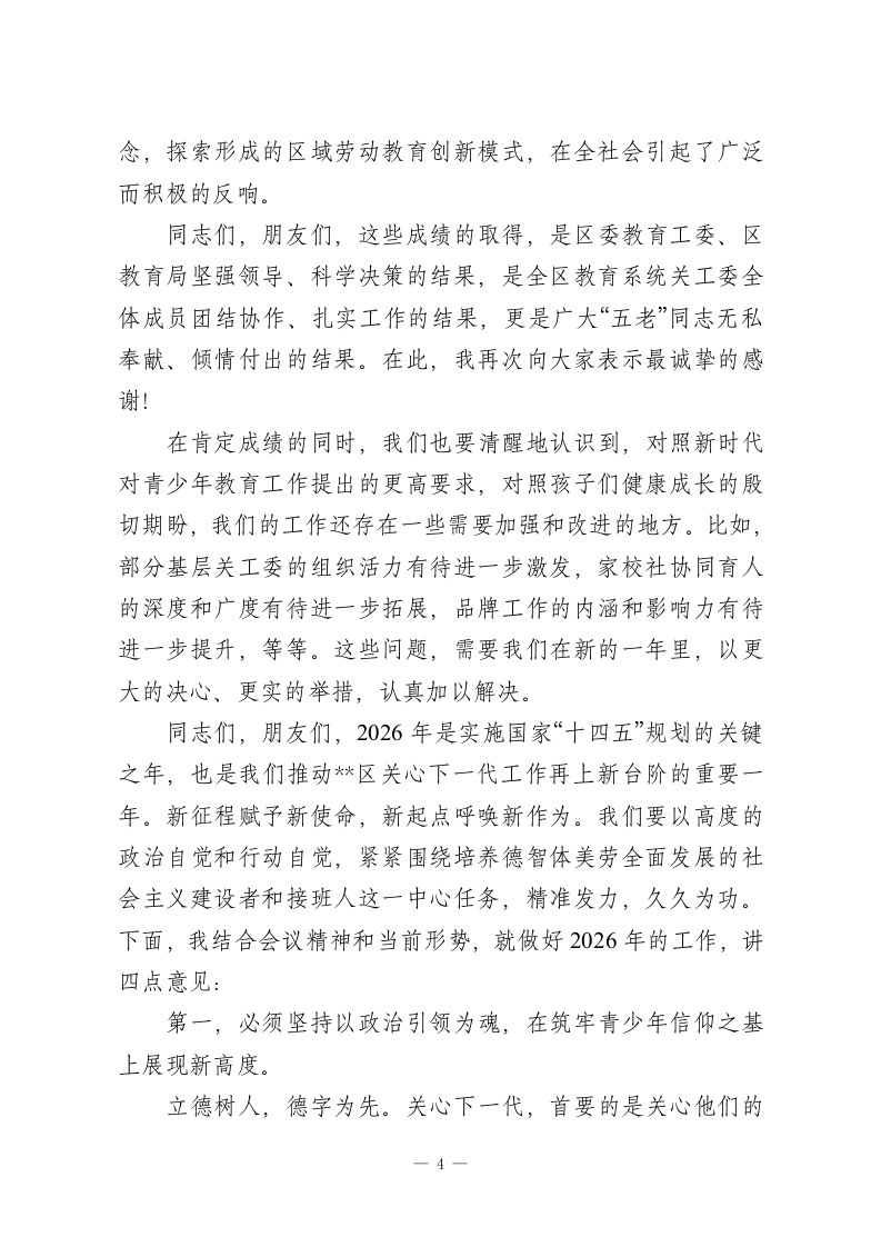 在区教育系统关工委2026年工作会议上的讲话各位同志,各位“五老”朋友们:大家上午好!岁序更替,华章日新。今天,我们怀着对过往的崇敬和对未来的期许,隆重召开*区教育系统关心下一代工作委员会2026年工作会议。这次会议的主要任务是,全面总结回顾2025年我们共同走过的奋斗历程,系统分析当前关心下一代工作面临的新形势、新任务,科学谋划和部署2026年的重点工作,动员全区教育系统的同志们和“五老”朋友们,以更加饱满的热情、更加昂扬的斗志,共同谱写新时代*区关心下一代事业的新篇章。刚才,*同志宣读了新一届关工委成员名单,这为我们的组织注入了新的活力;*同志对2025年的工作进行了全面、客观、深刻的总结,成绩斐然,振奋人心。在此,我谨代表区关工委,向长期以来高度重视并大力支持关工委工作的区委教育工委、区教育局表示衷心的感谢!向辛勤耕耘在关心下一代工作战线上的全体同志,特别是向我们可敬可爱的“五老”朋友们,致以最崇高的敬意和最诚挚的问候!回首2025年,是*区教育系统关工委工作承前启后、守正创新、成效卓著的一年。一年来,我们紧紧围绕立德树人这一根本任务,在区委、区政府的正确领导和上级关工委的有力指导下,主动作为,奋发进取,推动全区关心下一代工作取得了长足的进步,呈现出许多新的亮点和特色。1