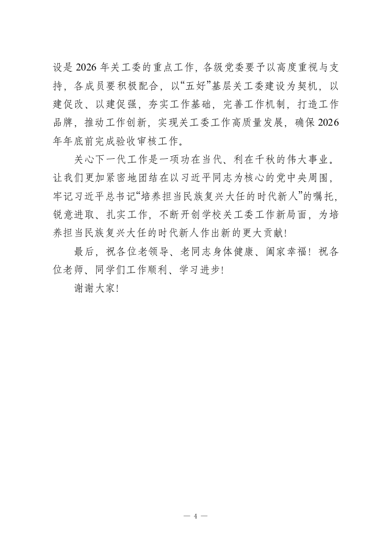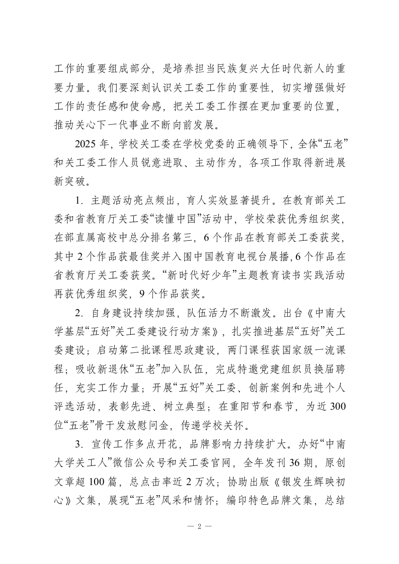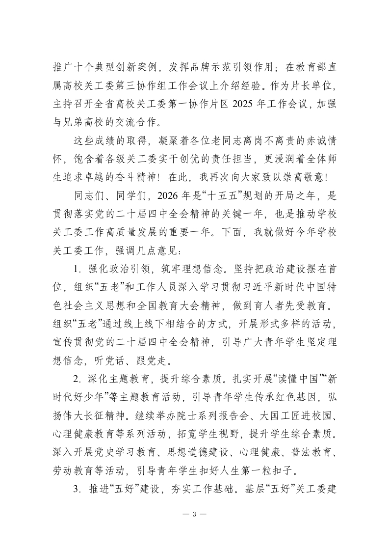 在学校关工委年度总结表彰大会上的讲话:守正创新担使命培根铸魂育新人尊敬的各位老领导、老同志,老师们、同学们:下午好!今天,我们在这里召开关工委年度总结表彰大会,主要任务是深入学习贯彻党的二十届三中、四中全会和全国教育大会精神,全面落实习近平总书记关于关心下一代工作的重要指示精神,总结2025年关工委工作成效,表彰先进集体和个人,部署2026年重点任务。在此,我谨代表校党委和校关工委,向受到表彰的先进集体和个人表示热烈的祝贺!向长期以来关心支持学校关工委工作的各位老领导、老同志表示崇高的敬意!向辛勤工作在关心下一代工作岗位上的全体同志表示衷心的感谢!习近平总书记多次对关心下一代工作作出重要指示,强调要支持更多老同志参加关心下一代工作,为培养社会主义建设者和接班人作出新的更大贡献。教育部党组《关于加强新时代全国教育系统关心下一代工作委员会工作的意见》明确指出,成立关工委组织是具有中国特色的制度性安排,是党加强青少年思想政治工作的创新。学校关工委成立以来,始终坚持以习近平新时代中国特色社会主义思想为指导,紧紧围绕立德树人根本任务,充分发挥“五老”优势,在加强青少年理想信念教育、思想道德建设、帮助青少年成长成才、为青少年健康成长营造良好社会环境等方面发挥了不可替代的作用。实践证明,关工委工作是学校教育教学1