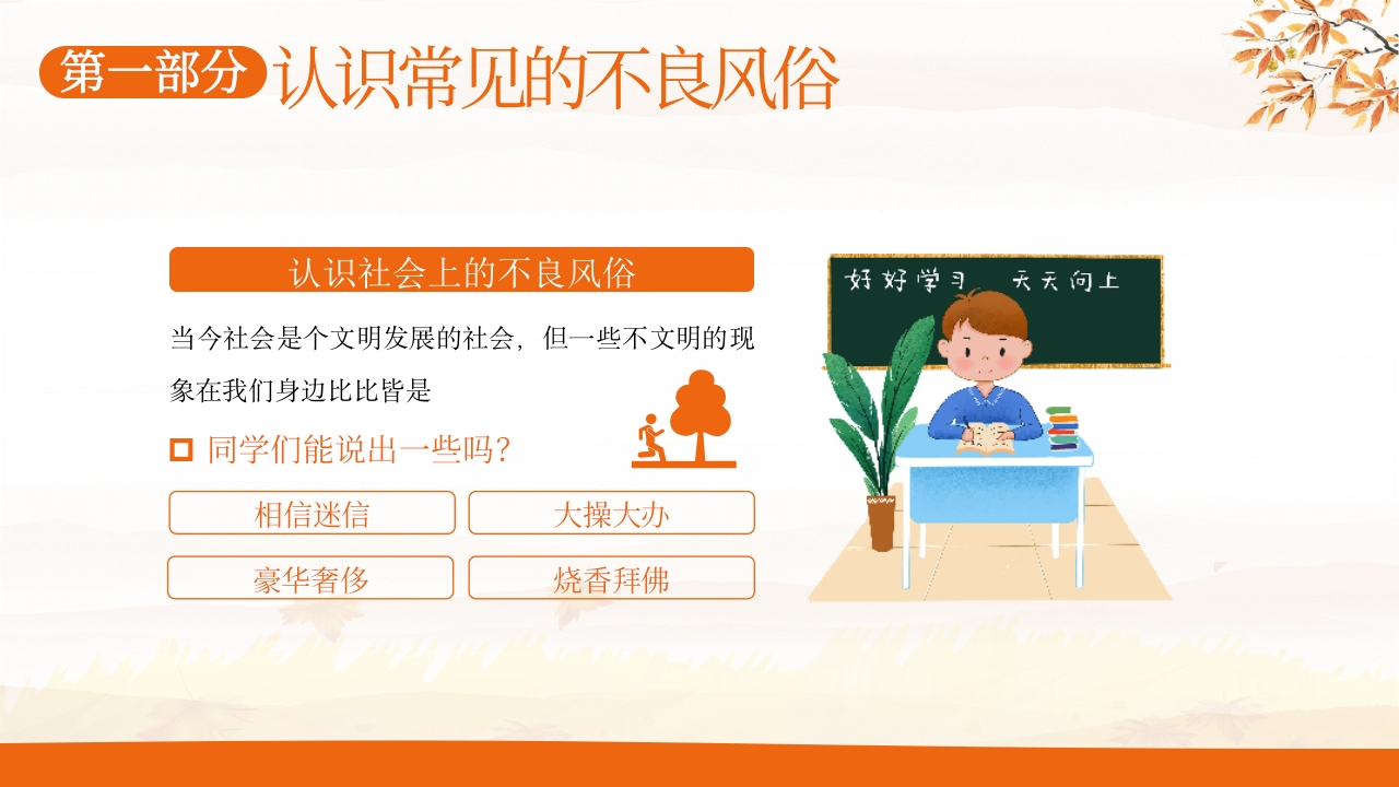 【中小学】【移风易俗】主题班会:移风易俗树新风,争做文明好少年tangqi888小时前发布关注私信15.56MB14页02313 第1页 / 共14页 第2页 / 共14页 第3页 / 共14页 第4页 / 共14页 第5页 / 共14页 试读已结束,还剩9页,您可下载完整版后进行离线阅读 【中小学】【移风易俗】主题班会:移风易俗树新风,争做文明好少年此内容为付费资源,请付费后查看¥9.9¥19.9VIP会员免费立即购买您当前未登录!建议登陆后购买,可保存购买订单付费资源© 版权声明本站是一个信息分享及获取的平台,不确保部分用户上传资料的来源及知识产权归属,资料由老师投稿,公开渠道整理,网友上传,如果侵犯到您的权益,请联系客服删除THE ENDPPT课件 文本预览 抵社会不202X年中小学移风易俗主题班会良风俗」我移风易俗树新风起从在做争做文明好少年班级:XXX时间:202X. 查看更多 收起部分 喜欢就支持一下吧点赞13 分享QQ空间微博QQ好友海报分享复制链接收藏