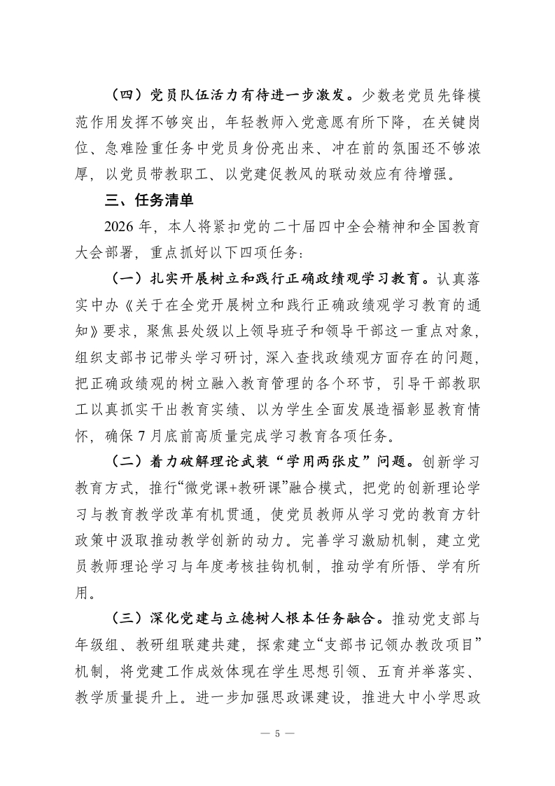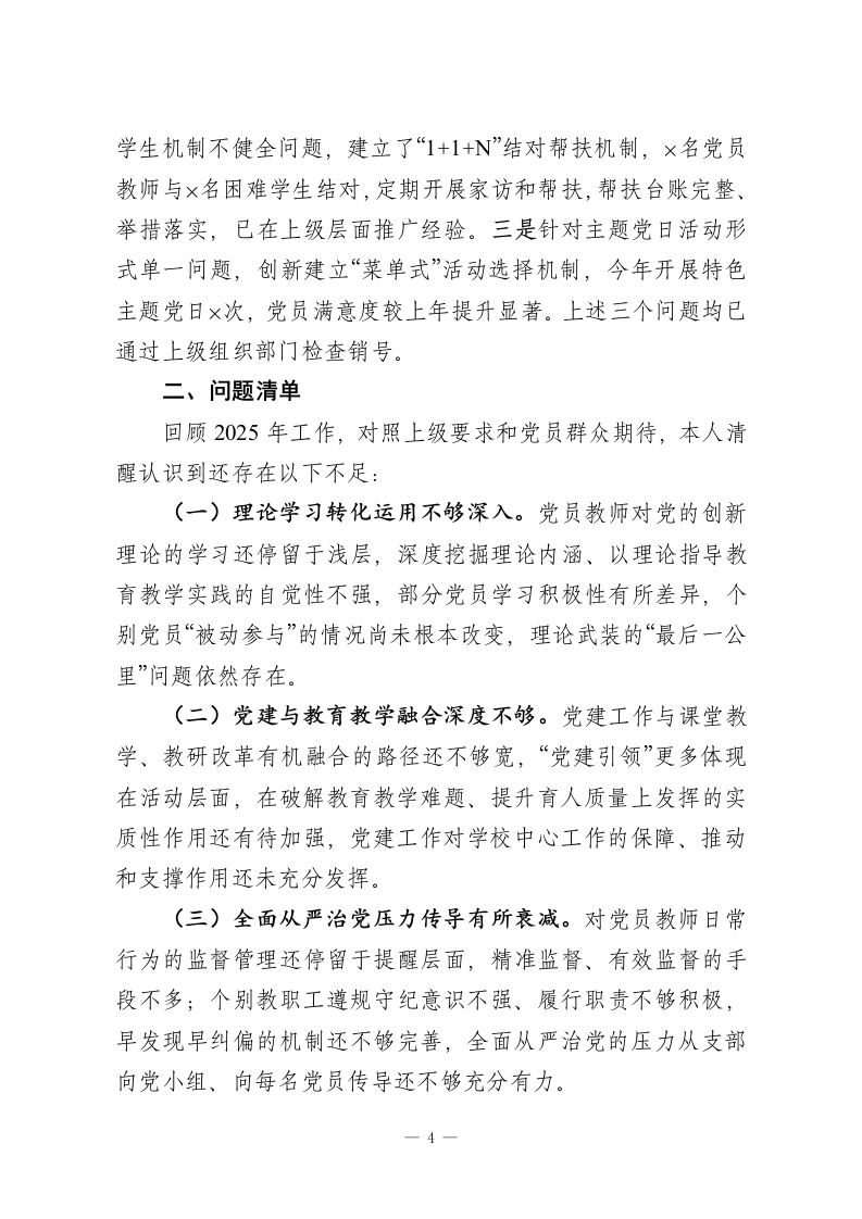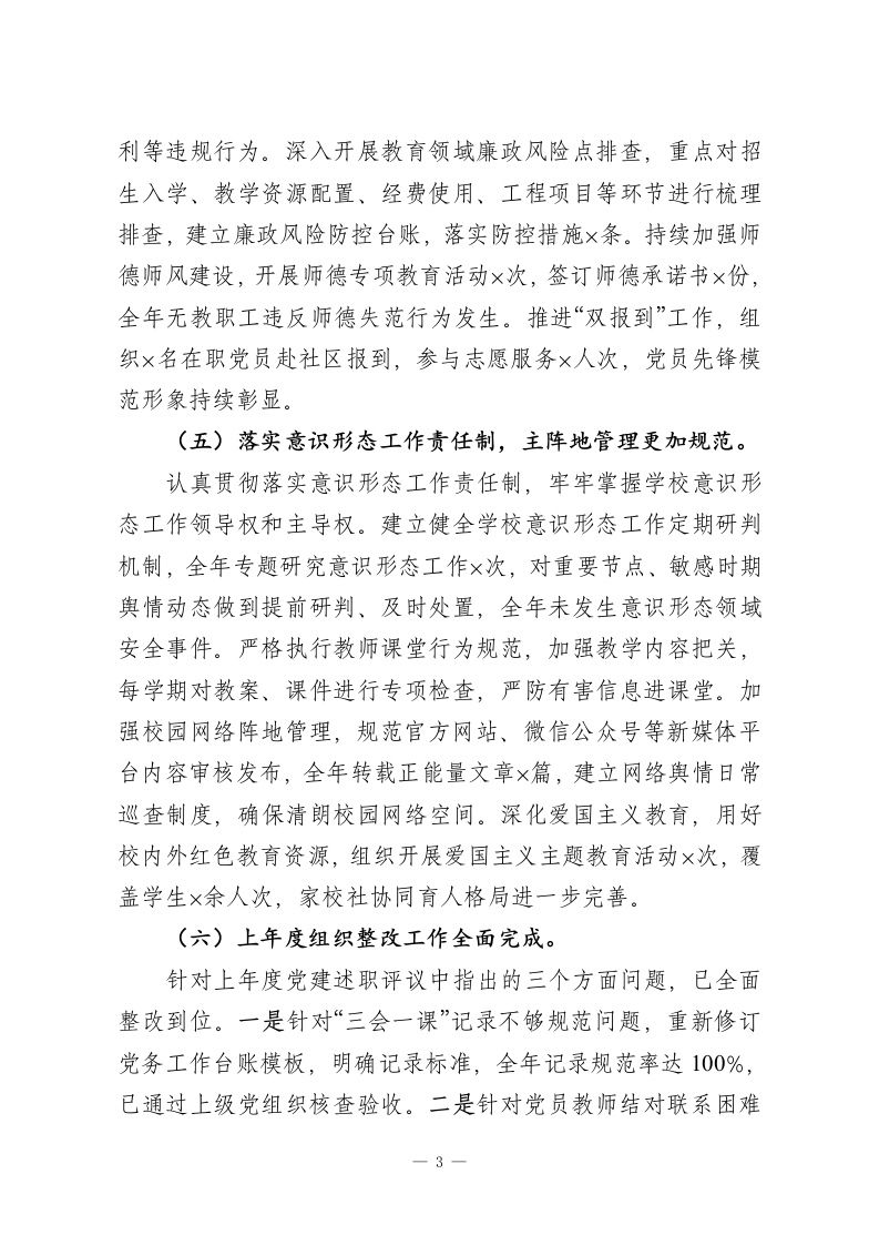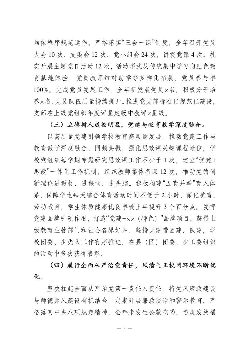 ××中学(小学)党支部书记2025年抓基层党建工作述职评议报告各位领导、同志们:按照上级党组织统一部署,现将本人2025年度履行抓基层党建第一责任人职责情况,按照成绩清单、问题清单、任务清单三个维度向大家作述职报告,恳请评议。一、成绩清单(一)政治建设更加有力,理论武装持续深化。始终把党的政治建设摆在首位,严格落实“第一议题”制度,全年组织党支部委员会集中学习12次、党员大会学习10次,带领全体党员深入学习贯彻习近平新时代中国特色社会主义思想,系统学习党的二十届三中、四中全会精神,全面贯彻全国教育大会和《教育强国建设规划纲要》精神,推动党员干部在思想上政治上行动上同党中央保持高度一致。深入开展党纪学习教育常态化长效化工作,组织开展专题辅导2次、警示教育2次,全体党员学习覆盖率达100%。扎实开展“学习强国”积分管理,党员月均学习积分较上年提升30%。本人全年带头走进课堂讲授思政课4次,带头开展谈心谈话20余人次,示范引领党员教师担当尽责。((二)组织建设持续规范,支部战斗堡垒更加坚强。深入推进党组织领导的校长负责制,建立健全党组织研究决策、校长执行落实的工作运行机制,重大事项决策前均提交党支部会议研究,全年召开党政联席会议12次,重大决策事项1