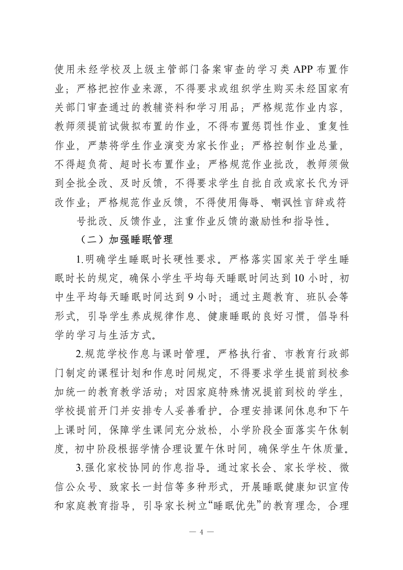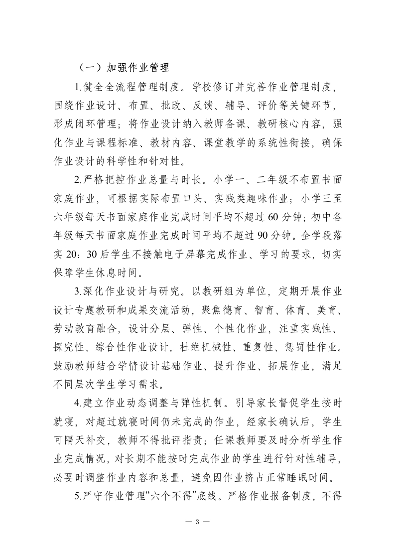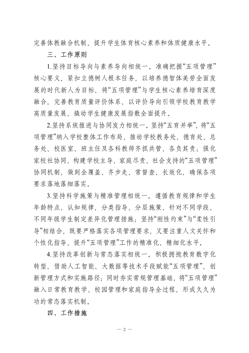 2026春季第二学期中小学五项管理工作实施方案一、指导思想全面贯彻党的教育方针,以教育部及省、市关于加强中小学生作业、睡眠、手机、读物、体质等“五项管理”的最新文件精神为根本遵循,紧扣教育强国建设三年行动计划工作要求,将“五项管理”作为深化育人方式改革、办好人民满意教育的重要抓手,坚持以生为本,构建科学、长效、精细化的管理机制,以“小切口”推动“大育人”,切实减轻学生过重课业负担和校外培训负担,解决广大家长急难愁盼问题,全方位促进学生身心健康、全面发展,持续增强人民群众的教育获得感、幸福感和安全感。二、工作目标遵循学生身心成长发展规律,聚焦“五个强化、五个提升”,健全常态化、规范化的“五项管理”落实机制,培养学生健康科学的学习生活方式,助力学生全面发展、健康成长。一是强化作业源头与过程双管理,形成科学、分层、个性化的作业设计与实施规范,提升作业育人实效;二是强化睡眠综合保障管理,完善家校协同的睡眠管理体系,提升学生睡眠质量与健康作息养成率;三是强化手机进校园精细化管理,引导学生科学使用智能设备,提升学生信息素养和自我管理能力;四是强化课外读物进校园全流程管理,规范读物遴选与使用,提升校园阅读品质和学生阅读素养;五是强化体质健康过程性与个性化管理,1