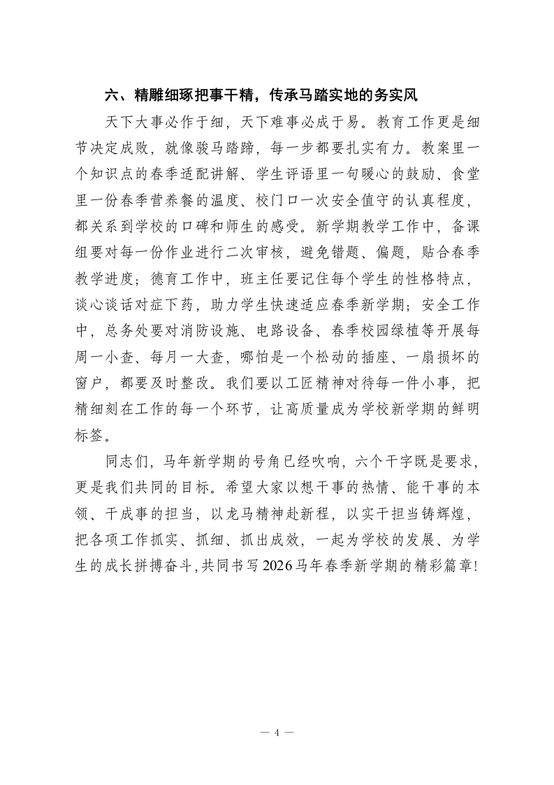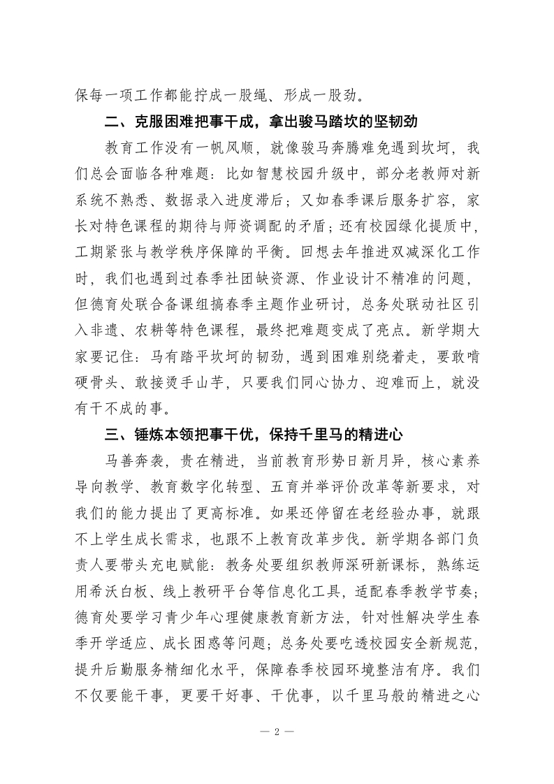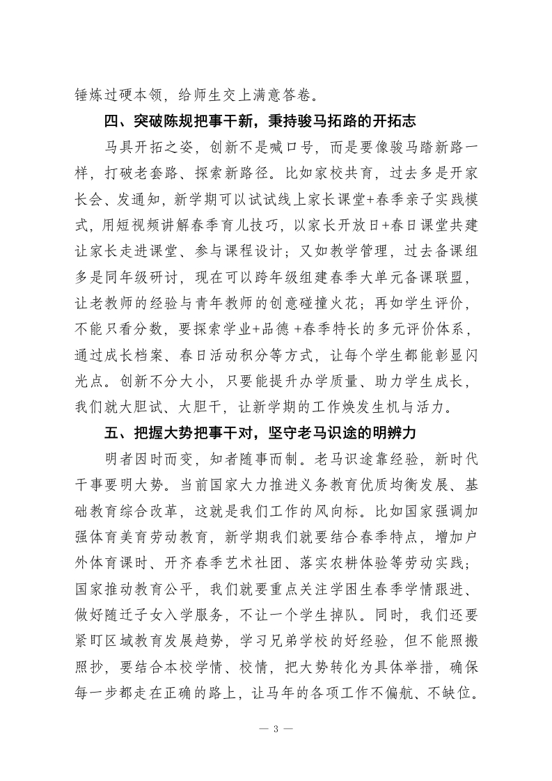 2026春季开学中层行政会议,校长讲话:策马扬鞭,要做到这6个“干”同志们:春回校园,万象更新!2026马年新春,我给大家拜个晚年,我们迎来了春季新学期的首个行政班子会。中层班子作为学校发展的中坚力量,是推动各项工作落地的领头雁,每一项决策、每一次执行都直接关系到办学质量和师生福祉。马年象征着奋进、实干与协同,今天我们就以马的精神为指引,聚焦干字核心,从六个方面提要求、明方向,希望大家以龙马精神扛起重任,以一马当先的姿态开局起步,把责任扛在肩上、把工作抓在手上,共同推动学校新学期再上新台阶!一、顾全大局把事干好,彰显群马奔腾的协同力不谋万世者,不足以谋一时;不谋全局者,不足以谋一域。马年讲究合力致远,我们学校是个有机整体,教务处的教学统筹、德育处的活动策划、总务处的服务保障,从来不是各管一摊的孤立事务。就像新学期重点推进的春季研学实践课程体系建设,既需要教务处牵头敲定春季特色方案,也需要德育处做好学生组织与安全引导,更需要总务处协调车辆、场地与后勤保障,还要联动年级组做好家校沟通,让春日研学既安全又有实效。往后各部门要多开协同会、少算部门账,摒弃单打独斗的思维,像群马奔腾般心往一处想、劲往一处使,把局部工作放在立德树人的总目标里,把个人精力融入学校发展大局,确1