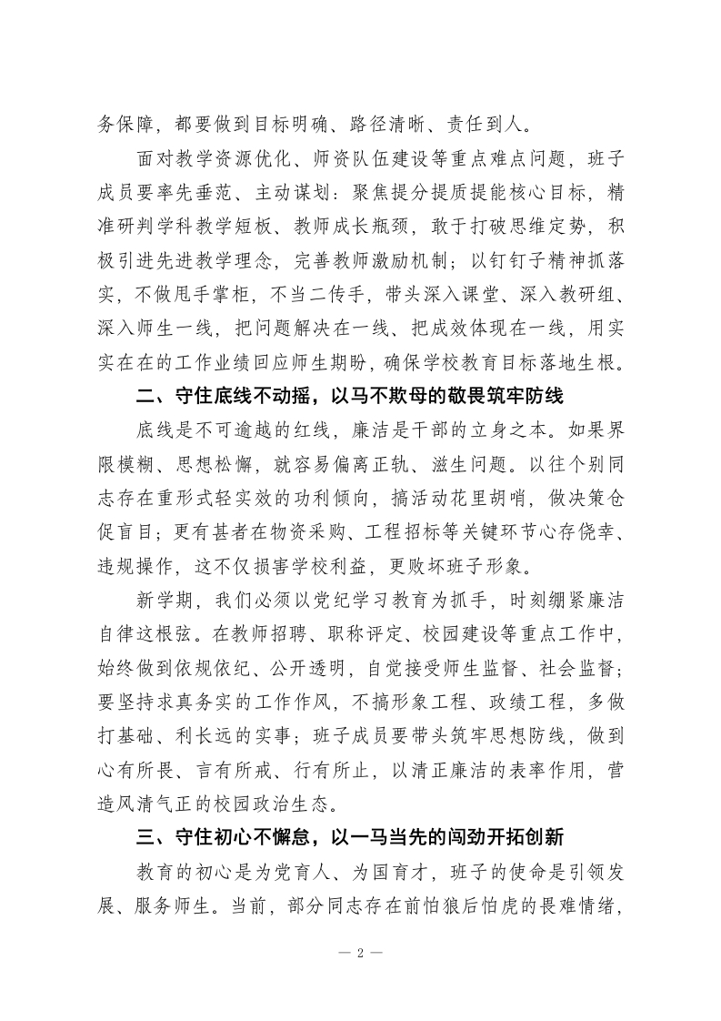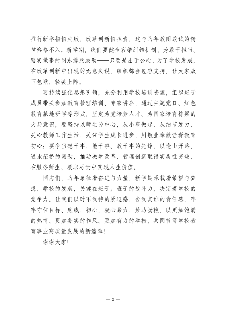 2026春季新学期第一次行政班子会上,校长的讲话:乘势而上守初心,策马扬鞭启新程各位班子成员、同志们:春回大地,万象更新;龙马奔腾,奋进当时。2026年是充满朝气与力量的马年,也是我校教育高质量发展的关键之年。今天,我们以第一次班子会为契机,锚定新学期目标、凝聚发展共识。当前教育改革纵深推进,新理念、新任务接踵而至,对我们这支关键少数的领导班子提出了更高要求一一学校要实现跨越式发展,班子成员必须在其位、谋其政、尽其责,成为敢担当、善作为、靠得住的领头雁。客观来看,我们当中少数同志还存在目标模糊、责任弱化、初心淡化的问题:遇到难题推拖绕,面对新要求本领慌,干事创业不敢闯,导致部分工作落实滞后、成效打折扣。新学期新气象,我们必须对症下药、靶向发力,牢牢守住目标、底线、初心这三条生命线,以马不停蹄的干劲、一马当先的闯劲、马到成功的韧劲,推动学校各项工作再上新台阶!一、守住目标不松劲,以驰而不息的执着勇担使命目标是前行的灯塔,实干是成事的路径。班子成员作为学校发展的操盘手,必须杜绝不想干、不愿为的惰性思想,把每项工作都当成关乎学校发展、关乎学生未来的大事来抓。无论是教学质量提升、学生全面发展,还是校园文化建设、后勤服