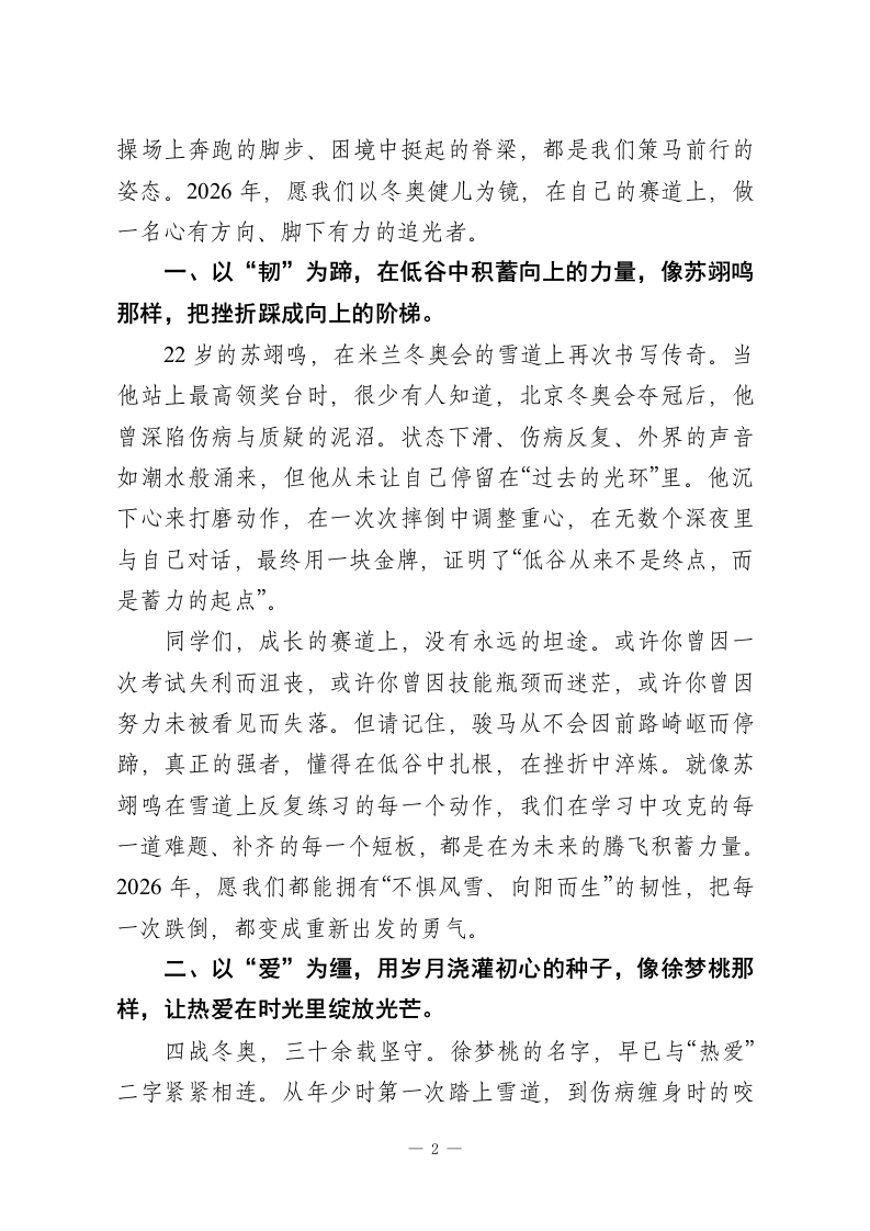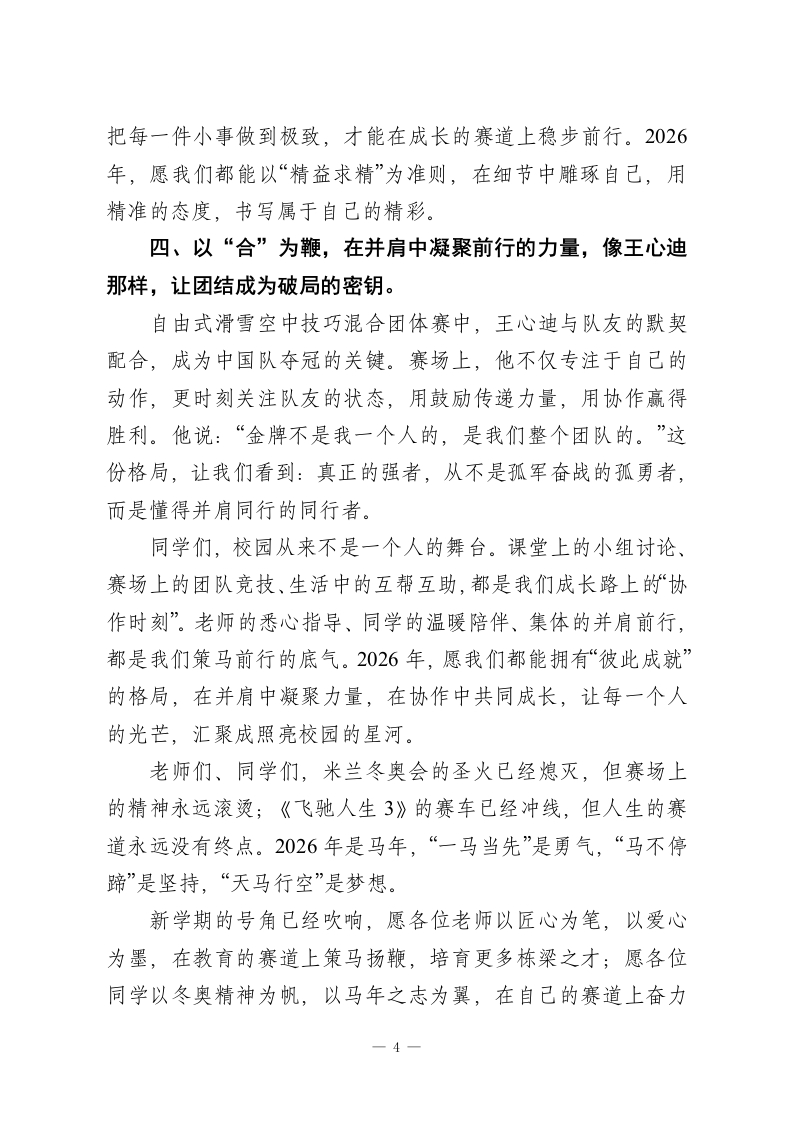2026春季新学期开学典礼,校长讲话:米兰奥运会,开启新学期,在自己的赛道上奔赴山海尊敬的各位老师、亲爱的同学们:大家上午好!当晨光洒满校园,当琅琅书声再次唤醒沉寂的教室,我们迎来了2026年崭新的学期。站在丙午马年的起点,“策马扬鞭”的旋律在耳畔回响,而我更想和大家聊聊那些在冰雪赛道上绽放光芒的身影一一刚刚落幕的米兰冬奥会,不仅是体育竞技的盛宴,更是一堂生动的成长课。就像《飞驰人生3》里那句滚烫的台词:“赛道从不会辜负每一份全力以赴”,那些在雪道上飞驰的健儿,用坚守与汗水告诉我们:真正的赛道,从来不在别人的目光里,而在自己的心中。这个冬天,米兰的冰雪赛场,镌刻下中国健儿的荣耀印记。苏翊鸣、徐梦桃、宁忠岩、王心迪四位冠军,用一次次腾空、一次次冲刺,将“不可能”变成“我能行”。他们的故事里,没有天生的幸运,只有日复一日的打磨;没有一蹴而就的辉煌,只有百折不挠的坚持。这些瞬间,恰如我们求学路上的每一次伏案、每一次突破,提醒着我们:成长的赛道,从来都是用热爱与执着铺就的。同学们,体育赛场是人生的缩影,而我们每个人,都是自己赛道上的“骑手”。课堂上专注的眼神、书桌前疾书的笔尖、