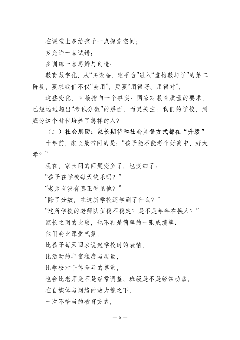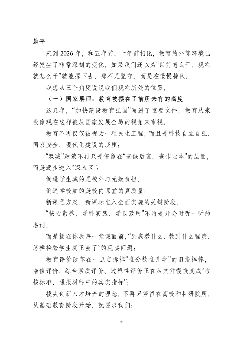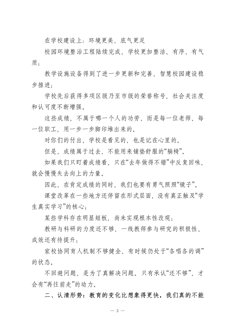 2026开学教职工会议讲话稿:不躺平、不原地打圈,成绩不能变成“躺椅”!各位老师、各位同志:大家新年好!金蛇辞旧去,骏马踏春来。短暂而充实的寒假刚刚过去,我们又回到了熟悉的校园,迎来2026年春季学期的第一天。此时此刻,看到大家再次齐聚一堂,我既感亲切,也感珍惜。在这里,我代表学校领导班子,向全体教职工送上马年的新春祝福,向寒假期间仍然坚守在学校、保障校园安全和运行的老师们、同志们表示衷心的感谢与敬意!假期里,大家回到家庭角色中,陪伴亲人、恢复体力、滋养心情,这是非常重要的。而今天当我们重新迈进校园大门,站上讲台、走进办公室的那一刻起,我们的身份又重新回到了那个始终离不开的名字一“教育工作者”。新学期,新起点,我想围绕三个问题,和大家谈一谈心里话:我们刚刚走过的一年,留下了什么?站在2026年,我们身处怎样的教育环境?接下来,这个学期我们可以、也应该一起去做哪几件事?一、回望过去:每一份努力都值得被记录刚刚过去的2025年,对学校来说是真正意义上的“关键一年”。一1