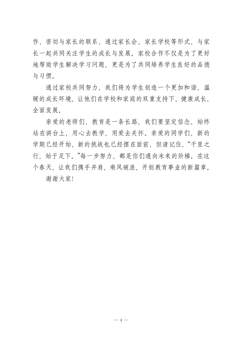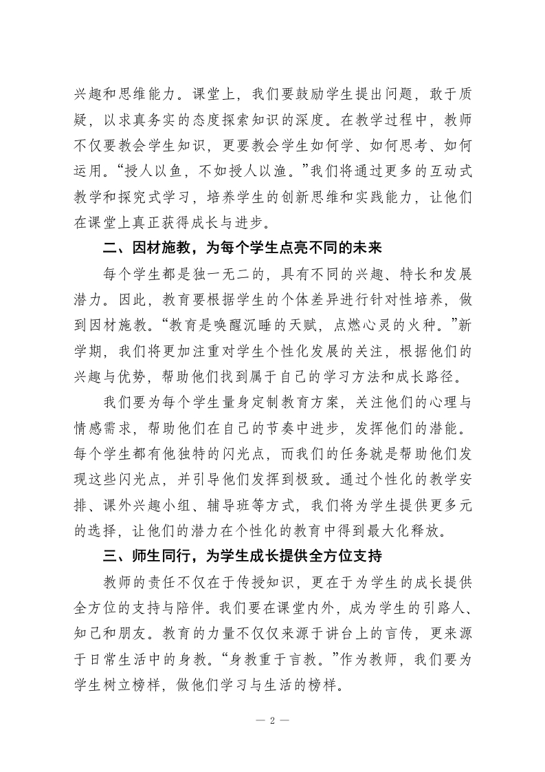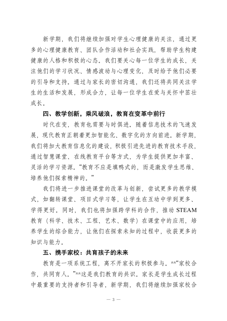 2026年春季开学典礼教导主任发言一一以梦为马,扬帆启航尊敬的各位领导、亲爱的同学们:大家好!在这温暖的春日里,我们迎接崭新的学期,承载着新的希望与梦想。作为教导主任,今天能站在这里,心中充满了无尽的激动与责任感。在新的学期里,我们将继续肩负起对学生的教育使命,带领每一位学子从知识的源泉中汲取力量,助他们一臂之力,让他们在成长的道路上不断超越自我,勇敢前行。“以梦为马,扬帆启航。”这是我为新学期寄予的祝福。教育不仅是知识的传递,更是理想的启航,是每一位学子人生中的第一艘船。今天,我站在这里,怀着满怀的期待,愿我们每一位教育者都能成为这艘船的掌舵人,带领学子们驶向更加广阔的海洋。一、从课堂出发,做“知行合一”的引领者每一个孩子的成长,离不开课堂的滋养与启迪。在这片知识的沃土上,我们每一位教师都是耕耘者,种下知识的种子,等待它们在学子们的心田里茁壮成长。然而,教育不仅是知识的灌输,“教学相长”才是教育的真正意义。每一位学生的成长,离不开教师的引导和启发。“学而时习之,不亦说乎?”教育的最高境界是让学生不再依赖老师,而是能够主动吸收知识,形成自主学习的习惯。新学期,我们将继续深耕课堂教学,注重培养学生的学习-1