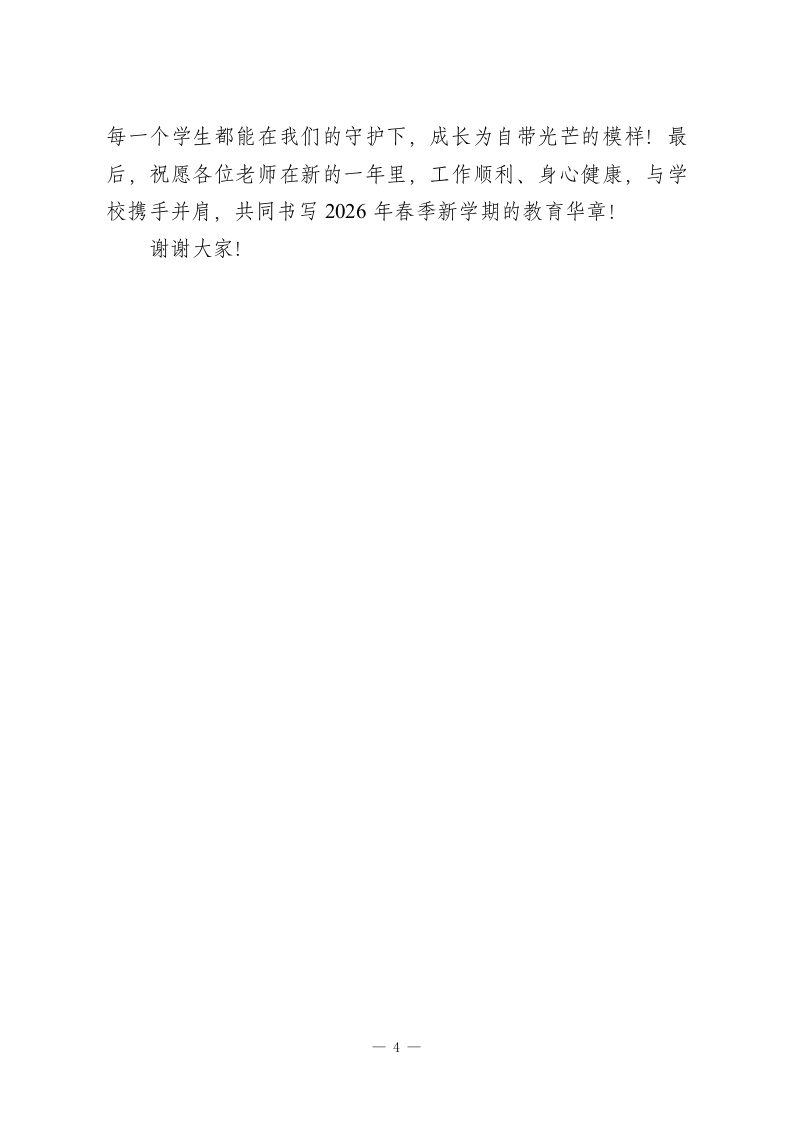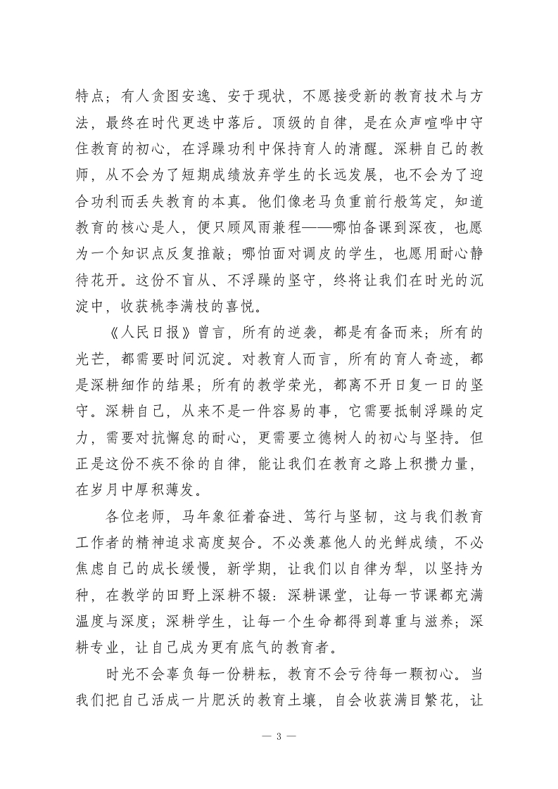 2026年春季新学期全体教师大会,校长讲话:深耕自己各位老师:大家上午好!度过一个充实祥和的寒假,我们怀揣着对教育的热忱与期许,再次相聚在这充满生机与希望的校园。首先,我代表学校领导班子,向全体教职工致以新春的诚挚问候和美好的祝愿!向假期里坚守岗位、默默奉献的各位同仁表示衷心的感谢!回首过去一学年,全体教师凝心聚力、砥砺前行,在教育教学、学生培养、校园发展等各项工作中取得了丰硕成果,这离不开每一位教育同仁的辛勤耕耘与无私奉献,你们的坚守与付出,是学校最宝贵的财富!春潮涌动处,奋进正当时。在这草长莺飞、万物勃发的春日里,我们带着马年的昂扬锐气,迎来了2026年春季新学期。2026年是充满奋进力量的丙午马年,龙马精神、笃行致远的美好寓意,恰与教育事业的初心使命同频共振。“马者,至健而不离地”,马的坚韧笃行、深耕不辍,正是我们教育人应有的精神底色。站在教育高质量发展的关键节点,新学期既是承前启后的加油站,更是再创佳绩的新起点。今天,我想以深耕自己为题,与各位同仁共勉一一对教育人而言,深耕是成年人顶级的自律,更是我们滋养学生、成就教育的根本之道。一、深耕自己,是褪去浮躁、打磨教学真功的清醒教育的真谛,从来不在喧嚣的口号里,而在每一堂精心设1