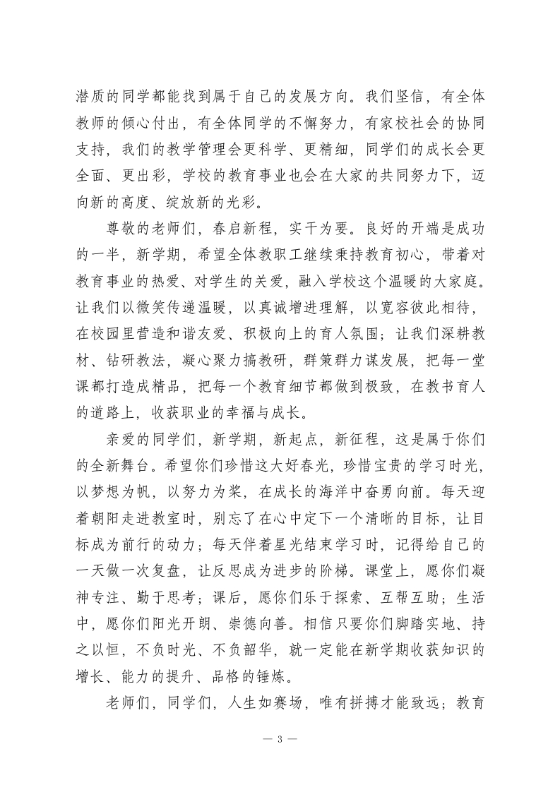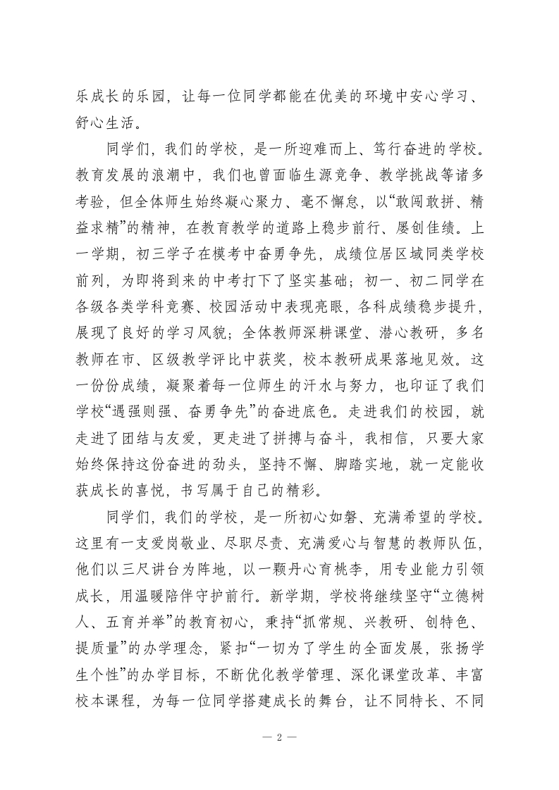 2026年春季学期初中开学典礼校长讲话:秉初心育桃李,赴新程向未来尊敬的各位老师、亲爱的同学们:大家好!刚才同学们铿锵有力的誓言,尽显少年意气与奋进姿态,既道出了新学期的坚定决心,也许下了成长路上的郑重承诺。这份热血与执着,不仅是青春最美的模样,更激励着每一位教师与大家并肩同行、携手共进。今天,我们迎着春日的暖阳,沐着和煦的春风,齐聚校园隆重举行2026年春季学期开学典礼。在此,我谨代表学校领导班子和全体教职工,向顺利返校的全体同学致以新春的问候和美好的祝愿,向默默耕耘、坚守岗位的全体教师致以诚挚的敬意,也向本学期加入我们大家庭的新老师、新同学,表示最热烈的欢迎!同学们,我们的学校,是一所日新月异、底蕴日增的学校。一直以来,学校始终把改善办学条件、优化育人环境放在重要位置,多方统筹资源,将每一份投入都用在助力师生成长上。如今的校园,教学楼窗明几净,现代化教学设备配齐到位,为大家搭建了优质的学习平台;学生公寓整洁舒适,人文化管理暖心周到,让住校的同学们拥有温馨的生活港湾;标准化操场、多功能活动室、书香四溢的图书馆,为大家的课余生活、全面发展提供了广阔空间。新学期,学校还将持续优化校园环境,完善教学配套设施,让校园成为大家汲取知识、涵养品格、快-1