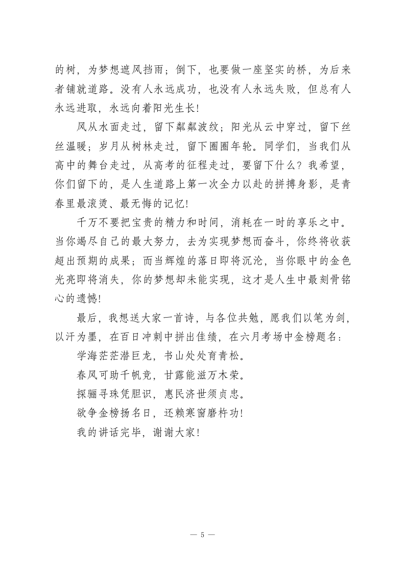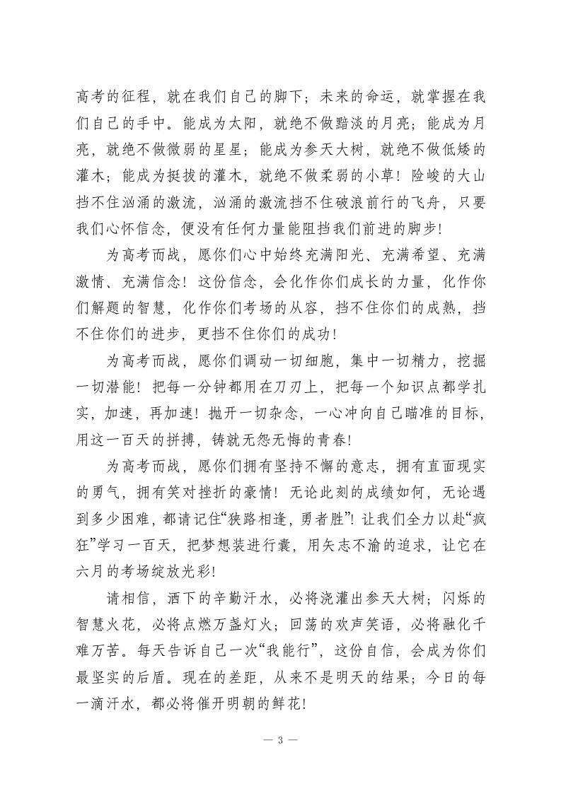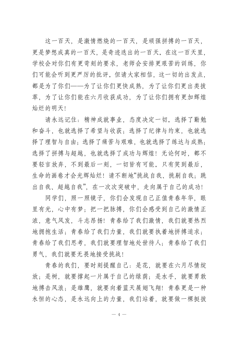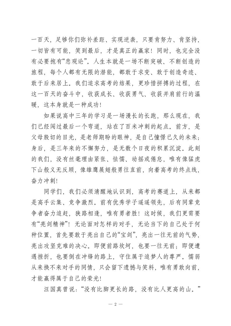 2026年春季学期高考百日冲刺校长动员讲话:在一次次突破中,走向属于自己的成功!亲爱的同学们:大家好!当日历一页页翻过,我们站在了2026年高考百日冲刺的关键节点一一距离高考,仅剩100天!这一刻,有人感慨时光匆匆,三年高中生涯弹指间即将落幕,那些在书桌前埋头苦读的日夜,那些为梦想奋力拼搏的瞬间,都将成为青春里最珍贵的印记;也有人庆幸时光未竭,一百天,足以让我们查漏补缺、厚积薄发,足以让我们调整状态、冲刺顶峰。面对这一百天,不同的人有不同的心声。有人说“一百天太长”,因暂时的迷茫看不到希望,便想放弃十几年的汗水与坚持,这实在令人惋惜。要知道,越是接近目标,越能考验人的意志,行百里者半九十,最艰难的时刻,正是离成功最近的时刻。也有人说“一百天太短”,心怀理想、朝气蓬勃的你们,深知时光宝贵,只想分秒必争、奋发图强。因为你们坚信,奇迹永远由强者创造,每一份付出,都终将收获对应的回报,这一百天,就是改写结局、铸就辉煌的黄金时光!在这里,我要告诉大家,必须彻底抛弃“定局论”。高中三年的学习,是一个由量变到质变、由渐变到突变的过程,此刻的成绩从来不是最终的答案。暂时落后的同学,不必妄自菲薄,
