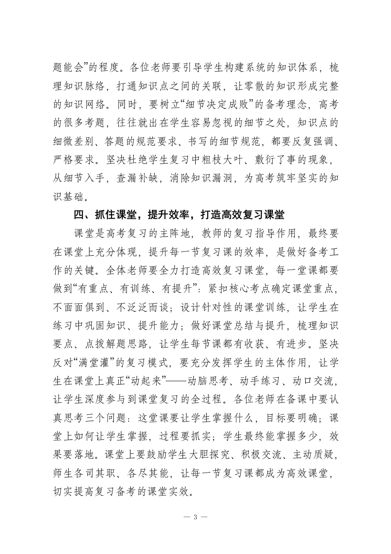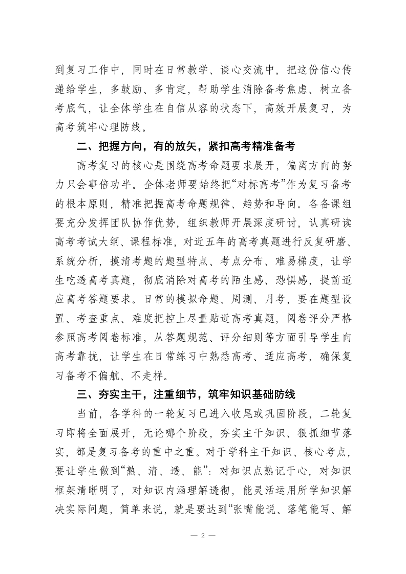 2026年春季学期高三高考迎考复习教师会议校长讲话:以“敢打必胜”的信心、“精准施策”的匠心、“真抓实干”的决心各位老师:下午好!时光飞逝,2026年高考已进入百日冲刺的关键阶段,当下的复习成效,直接决定着学生六月考场的发挥,更关乎着学校教育教学的成果。面对本届高三的学情实际,我们深知迎考复习工作面临着不少挑战,但连日来,各位老师始终坚守讲台、潜心教研、全力备考,这份敬业与坚守,让我们对今年的高考充满了希望和信心。今天,借着本次高三教师会议,我代表学校就高考迎考复习工作,提五点意见,与大家共勉,希望各位老师认真落实、精准发力,扎实做好后续复习备考工作。一、树立信心,敢打必胜,传递备考正能量信心是备考路上的精神基石,更是提升复习效率、助力考场发挥的关键。积极的心理状态,能让学生更高效地识记知识、理解考点,更从容地应对模考、迎战高考,甚至在考场上实现超水平发挥。回顾过往,无论面对何种挑战,坚定的信心总能让我们攻坚克难、取得突破。今天,我想把“树立信心,敢打必胜”这句话送给全体高三老师,这不仅是对我们自身备考工作的要求,更是我们要传递给每一位学生的信念。希望各位老师首先自身坚定迎考必胜的信心,以饱满的热情、昂扬的斗志投入