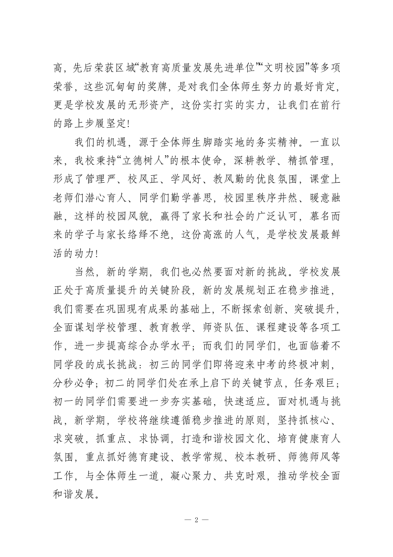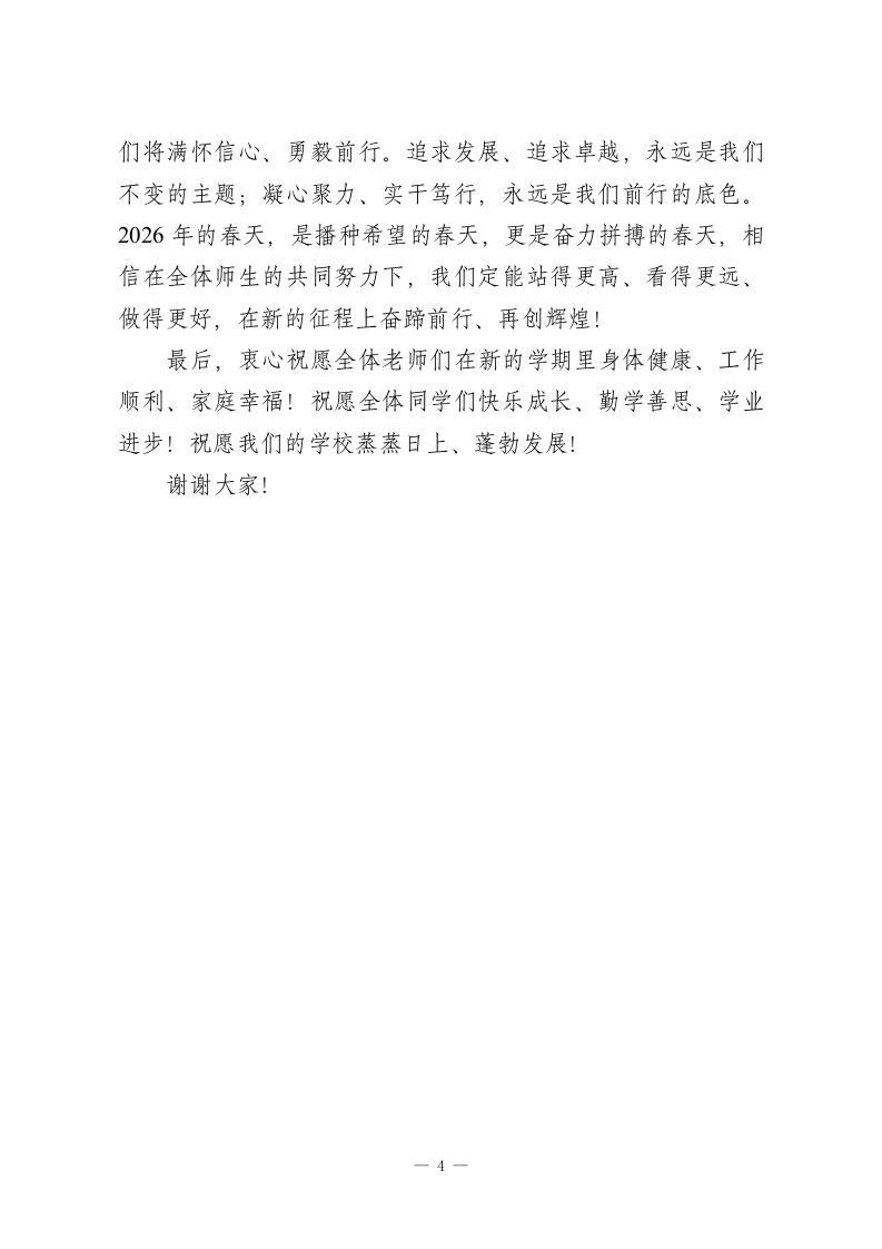 2026年春季学期寒假后开学典礼校长讲话:龙马奋蹄开新局,春风逐梦启新程老师们、同学们:大家好!龙马奋蹄开新局,春风逐梦启新程!度过了温馨祥和、充实愉悦的寒假,我们怀揣着崭新的希望、昂扬的斗志,重返生机盎然的校园,共同开启2026年春季学期的崭新篇章。一年之计在于春,春日的校园,处处涌动着奋进的力量;新的学期,既有属于我们的发展机遇,也面临着全新的成长挑战,愿我们以春为序,以勤为径,以志为帆,在新的征程上书写属于我们的精彩答卷!回望过往,我们凝心聚力、笃行实干,学校各项工作稳步推进、硕果累累,这份积淀,让我们在新的学期拥有了直面机遇、迎接挑战的底气。我们的机遇,源于全体师生同心同德的大爱情怀。过去的一学期,我们始终心怀家国、立足校园,将个人成长与学校发展、时代进步紧密相连;寒假期间,我校学子积极参与志愿服务、红色研学、文化传承等各类实践活动,用实际行动践行新时代青少年的责任与担当,真正做到家事、国事、天下事,事事关心,这份胸怀与格局,是我们最珍贵的精神财富!我们的机遇,源于全体师生勇毅前行的不懈追求。多年来,全校上下一心、真抓实干,在教育教学、德育建设、校园发展等方面屡创佳绩,学校办学质量稳步提升,社会美誉度持续提1
