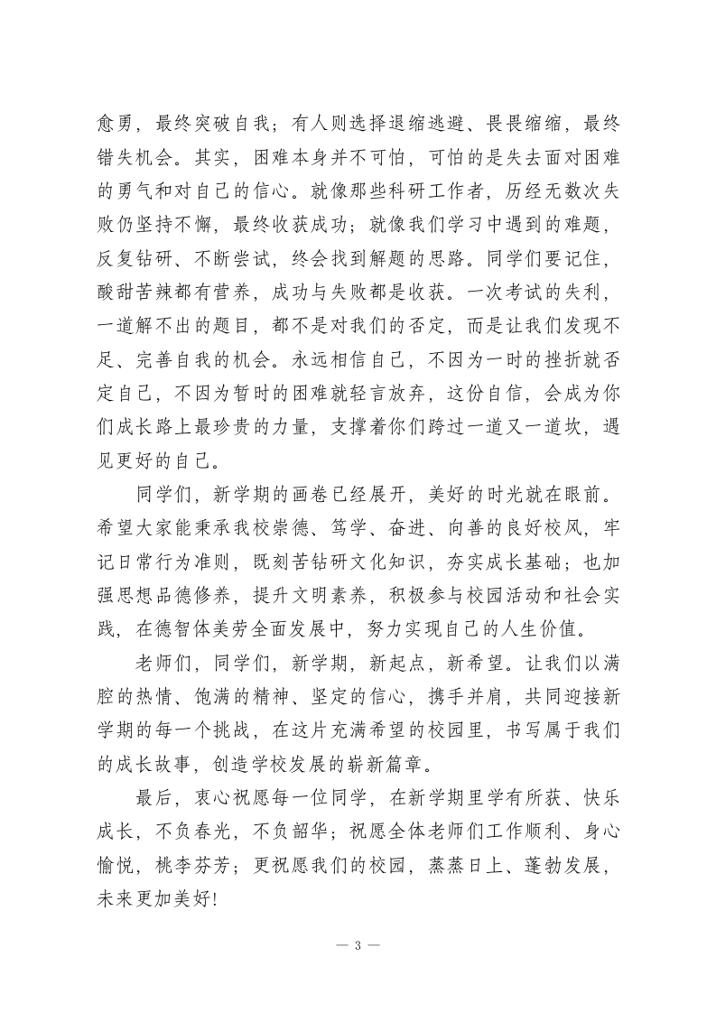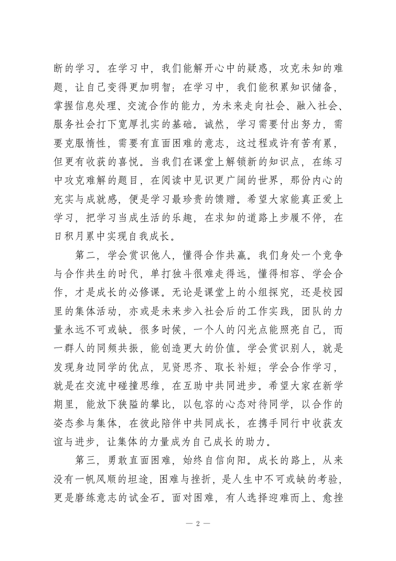 2026年春季学期寒假后开学典礼校长讲话:愿少年成长皆快乐,愿校园未来更美好尊敬的老师们,亲爱的同学们:大家好!温馨的寒假伴着新春的喜庆悄然落幕,相信同学们在假期里,既享受了阖家团圆的美好时光,也得到了充分的休息与调整,不仅恢复了充沛的体力,更在见闻中开阔了视野,在实践中增长了见识,在陪伴中收获了温暖。如今,我们踏着春日的暖阳,迎着拂面的清风,迈着轻盈的步伐重返校园,共同开启2026年春季学期的崭新征程,迎来求知路上又一个全新的里程碑。新学期的钟声已然敲响,相信每一位同学心中都萌动着新的渴望与冲动:或许想忘却过去的些许失意与挫折,或许想改掉自身的小缺点、小毛病,或许想在崭新的时光里脚踏实地拼搏一次,为自己的成长交上一份更满意的答卷。这份向上的期许,正是成长最美的模样。在此,我想对同学们提几点希望,愿大家能认清当下的时光,扛起成长的责任,以清晰的目标、坚定的行动,安排好新学期的学习与生活,为心中的理想做好全方位的准备。第一,以学习为天职,以求知为乐趣。学习,是学生阶段的核心主题,更是伴随一生的成长课题。一个人的成长高度、人生格局,或许由多种因素决定,但最根本的,永远是持续不1