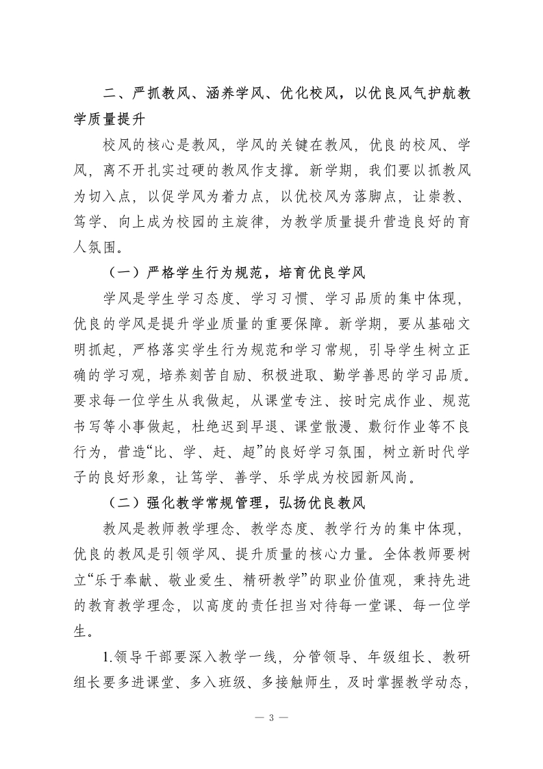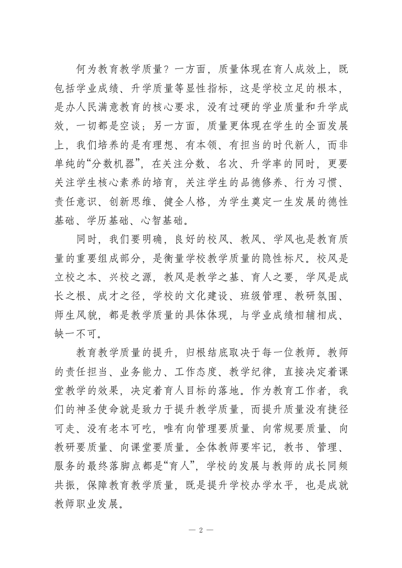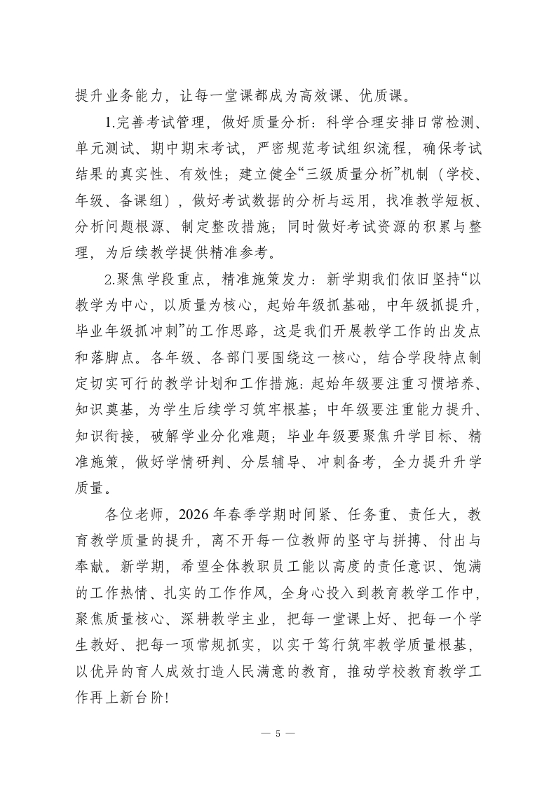 2026年春季学期教学工作会议分管教学副校长讲话:锚定质量核心,深耕教学主业,以实干笃行筑牢教育发展根基各位老师:大家好!刚刚过去的一学期,全校教师凝心聚力、深耕教学,我校教育教学工作扎实推进、成效显著,各项教学指标稳步提升,这离不开每一位教学一线老师的辛勤付出与不懈拼搏。2026年春季学期已然开启,新学期教育教学工作面临着新的挑战、新的任务,更肩负着新的使命。教育教学质量是学校发展的生命线,更是我们一切工作的核心,新学期我们必须以“抓早、抓细、抓实、抓严”的作风,锚定质量目标,夯实教学基础,开好局、起好步。下面,我对新学期学校教育教学工作提出总体思路:聚焦质量、深耕课堂、严抓常规、精研教研、优化教风、涵养学风、精细管理、提质增效,全面落实立德树人根本任务,以高质量教学回应家长期待、满足社会需求,切实筑牢学校教育高质量发展的根基。一、坚守质量核心,锚定教学中心,让质量成为教育教学的永恒主题在这里,我要再次强调两句话,与各位老师共勉:无论教育形势如何变化、教学模式如何创新,教育教学质量永远是学校工作的永恒主题;质量第一是各项教学工作的主旋律,任何人、任何时候都不能掉以轻心。