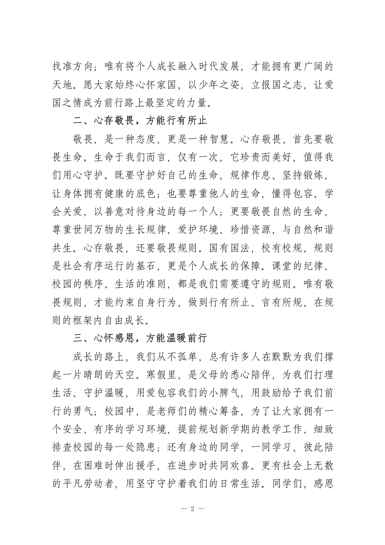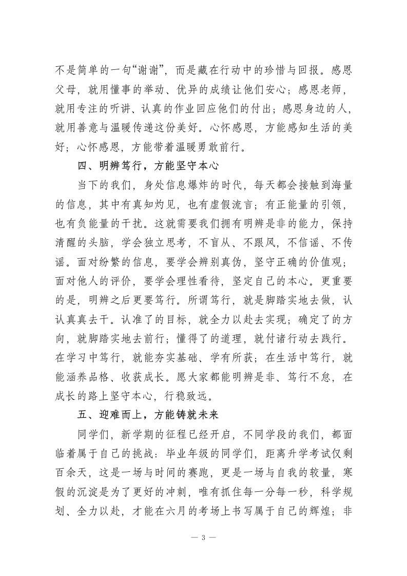 2026年春季学期开学典礼校长讲话:磨难凝聚力量,奋斗铸就未来亲爱的同学们:大家好!踏着春日的晨光,我们告别了充实的寒假,重返熟悉的校园,共同开启2026年春季学期的崭新征程。回望假期,有人在书香中沉淀自我,有人在实践中锤炼本领,有人在陪伴中感受温暖,更有同学在面对生活中的小考验、学习中的小挑战时,展现出了坚韧的品格和自律的素养。这段时光里,我看到了大家的成长与成熟,也看到了少年身上独有的勇气与担当。同学们,成长从不会一帆风顺,前路总有风雨兼程,而那些走过的坎坷、经历的磨难,从来都不是前行的阻碍,而是凝聚力量的基石。今天,我想和大家分享几句心里话,愿这些话语能成为大家新学期前行的力量。一、心有家国,方能行稳致远青年的命运,始终与国家的命运紧密相连;少年的情怀,更应怀揣对家国的热爱与担当。过去的一年,我们见证着祖国在科技领域的不断突破,在民生领域的持续深耕,在国际舞台上的坚定担当;我们也看到无数各行各业的建设者,以坚守诠释责任,以实干书写奉献,他们是时代的楷模,更是我们心中的榜样。同学们,家国情怀从来不是一句空洞的口号,它藏在认真学习的每一个瞬间,藏在遵守规则的每一个细节,藏在心怀大爱的每一个举动。唯有心中装着家国,才能在成长的路上1