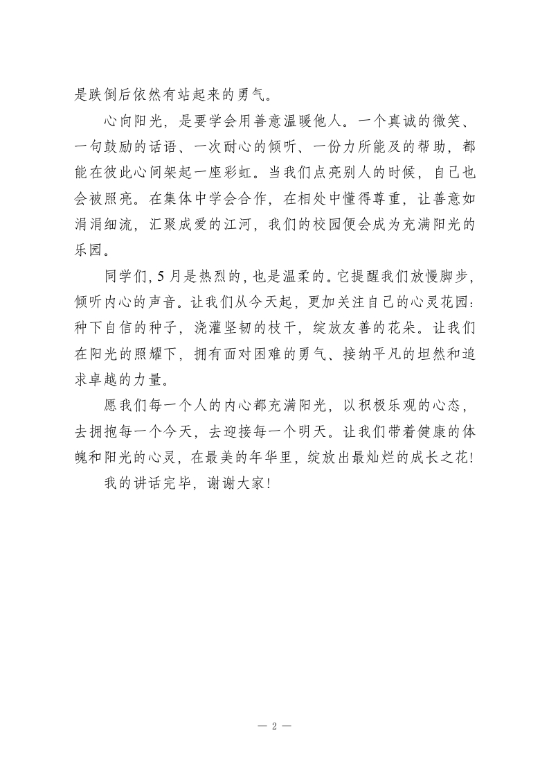 2026年春季学期升旗仪式第13周演讲稿:心向阳光,健康成长尊敬的老师,亲爱的同学们:大家早上好!今天,我国旗下讲话的主题是“心向阳光,健康成长”。当我们站在五月的尾巴上,沐浴着初夏的暖阳,你是否感受到一种蓬勃向上的力量?本周六,5月25日,是“全国心理健康日”。“525”谐音“我爱我”,意在提醒我们:珍爱生命,关爱自己,才能更好地爱他人、爱社会、爱我们脚下的这片热土。同学们,健康不仅仅是身体的强健,更是心灵的阳光。它如同一棵大树的根系,深植于沃土,支撑着我们枝繁叶茂、茁壮成长。那么,如何让心灵沐浴阳光,让成长充满力量?心向阳光,是要学会接纳不完美的自己。成长路上,有坦途也有坎坷,有欢笑也有泪水。我们不必因一次考试的失利而气馁,不必因暂时的落后而自卑。就像月亮有阴晴圆缺,我们每个人都是独特的存在。接纳自己的情绪,正视自己的不足,给自己一个微笑,说一声“没关系,我可以慢慢来”。这份对自己的宽容与理解,是心灵阳光的第一缕光芒。心向阳光,是要学会在风雨中坚韧前行。成长难免遇到压力、困惑与挑战。当烦恼来袭时,不妨打开心扉,与好友倾诉,向师长求助,在信任的人那里获取温暖与力量。也可以跑跑步、听听歌、读一本好书,让运动释放多巴胺,让文字治愈心灵。记住,求助不是软弱,而是强者的智慧;坚韧不是不跌倒,而1