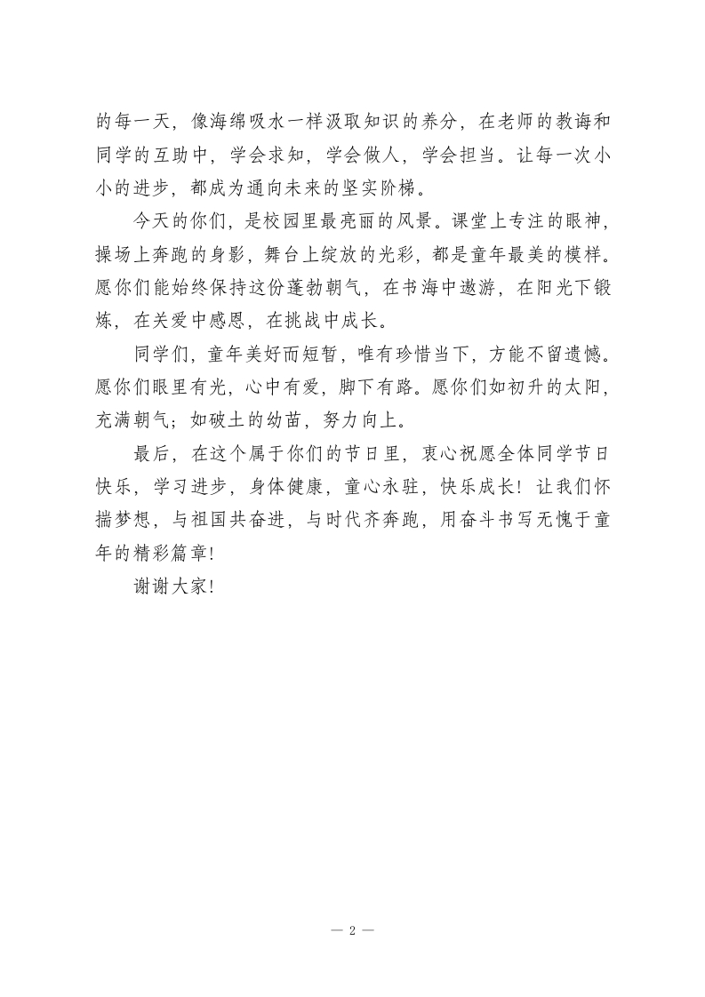 2026年春季学期升旗仪式第14周演讲稿:童心飞扬,快乐成长尊敬的各位老师,亲爱的同学们:大家早上好!在这阳光明媚、生机盎然的六月清晨,我们迎来了新的一周。今天,我们怀着喜悦的心情相聚在鲜艳的五星红旗下,共同迎接一个属于所有孩子的节日一一六一国际儿童节。本周升旗仪式的主题是《童心飞扬,快乐成长》。六月,是童年的摇篮,是童年的沃土。六月的第一天,被全世界赋予了最纯真、最灿烂的色彩。儿童节,不仅仅是一个庆祝的日子,它更是对童年价值的礼赞,是对未来希望的寄托。童年,是人生画卷上最初始、最明亮的底色。它承载着无边的梦想,萌发着蓬勃的生机,孕育着无限的可能。“童心”,是一颗赤子之心。它饱含着对世界的好奇,对美好的向往,对他人的善意。拥有童心,意味着拥有发现美的眼睛,拥有感受爱的能力,拥有不畏困难的勇气。这份纯真,是我们最宝贵的财富。无论我们将来走得多远,飞得多高,都应努力呵护心底那份最初的真诚与善良,让它在岁月的洗礼中愈发澄澈明亮。“成长”,是生命的主旋律。它不仅仅是年龄的增长,知识的积累,更是品格的锤炼,心智的成熟。成长的道路上,有成功的欢笑,也难免有挫折的泪水。但正是这些丰富的体验,构成了我们独一无二的人生轨迹。同学们,我们要珍惜在校园里1