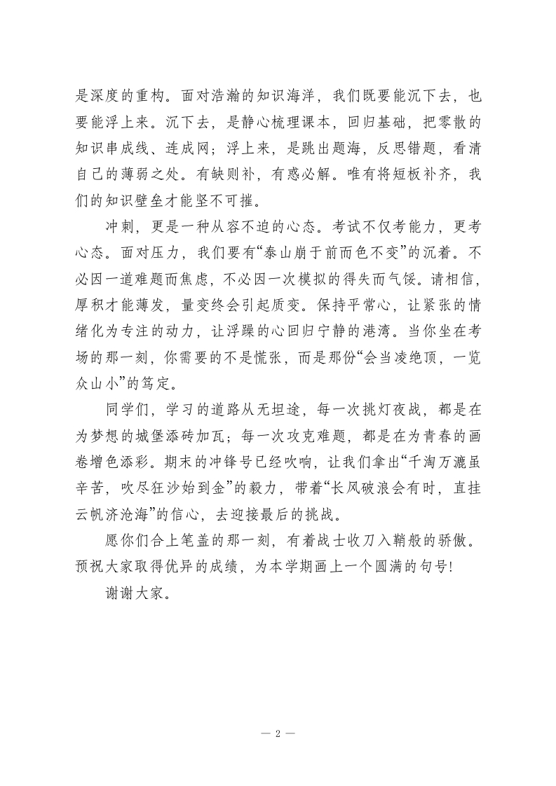 2026年春季学期升旗仪式第17周演讲稿:全力以赴,冲刺期末尊敬的老师们,亲爱的同学们:大家早上好!当六月的暖风拂过校园,当枝头的蝉鸣日渐嘹亮,我们站在了学期的尾声。今天,我国旗下讲话的题目是《全力以赴,冲刺期未》。时光如白驹过隙,忽然而已。回首望去,从乍暖还寒的初春到骄阳似火的盛夏,我们用琅琅书声迎接每一个黎明,用奋笔疾书送走每一缕余晖。那些在课堂上专注的眼神,那些在深夜苦思冥想的瞬间,都化作了成长路上坚实的足迹。而此刻,期末考试的战鼓已经擂响,这不仅是一场对知识的检阅,更是一次对意志的磨砺。“行百里者半九十。”越是临近终点,越显艰辛,也越接近成功。冲刺期末,并非一句空洞的口号,而是一场需要智慧与勇气的修行。冲刺,是一种争分夺秒的惜时。时间是最公平的,它给予每个人同样的二十四小时,却在不同的人手中结出不同的果实。在这一周里,我们要做时间的主人。告别拖延,拒绝懒散,哪怕是课间的一两道习题,睡前的一两个知识点,都是在为最后的胜利添砖加瓦。让每一分钟都过得充实,让每一个知识点都在脑海中生根发芽。冲刺,是一种查漏补缺的智慧。复习不是简单的重复,而-1
