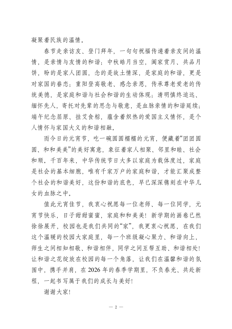 2026年春季学期元宵节校长讲话:元宵安康阖家欢,校园和谐共新程各位老师、同学们:大家好!今天是2026年农历正月十五,公历3月2日,我们迎来了元宵佳节。这是农历新年的第一个月圆之夜,也是传统意义上春节的收官之日,当新春的团圆暖意遇上春季学期的奋进朝气,校园里处处洋溢着温馨与希望。在此,我向全体老师、同学们致以最诚挚的祝福,祝大家新春未尽,元宵安康!正月十五闹元宵,元宵节的形成至今已有两千多年的历史,在岁月的沉淀中,这份传统民俗孕育了诸多动人的传说,也留下了丰富多彩的节日习俗。元宵之夜,家家户户张灯结彩,赏灯游街、猜灯谜,满街灯火映着人间烟火;一碗碗热气腾腾的元宵(汤圆)端上餐桌,软糯香甜,藏着团圆美满的期许;不少地方还有舞龙舞狮、踩高跷、划旱船等传统表演,热闹非凡,尽显中华儿女对生活的美好向往。这些代代相传的习俗,不仅是中华传统文化的重要组成部分,更承载着国人对团圆、和睦的永恒追求。老师们、同学们,在这春意萌动的校园里,我们齐聚一堂共庆元宵,不仅因为今天是传统佳节,更想和大家分享的是:每一个中华传统节日,都是中华民族精神的鲜活体现,而这份精神的核心价值,便是和谐。中华传统节日灿若星河,无论端午中秋、重阳清明,每一个节日的背后,都浸润着和谐的底蕴,1