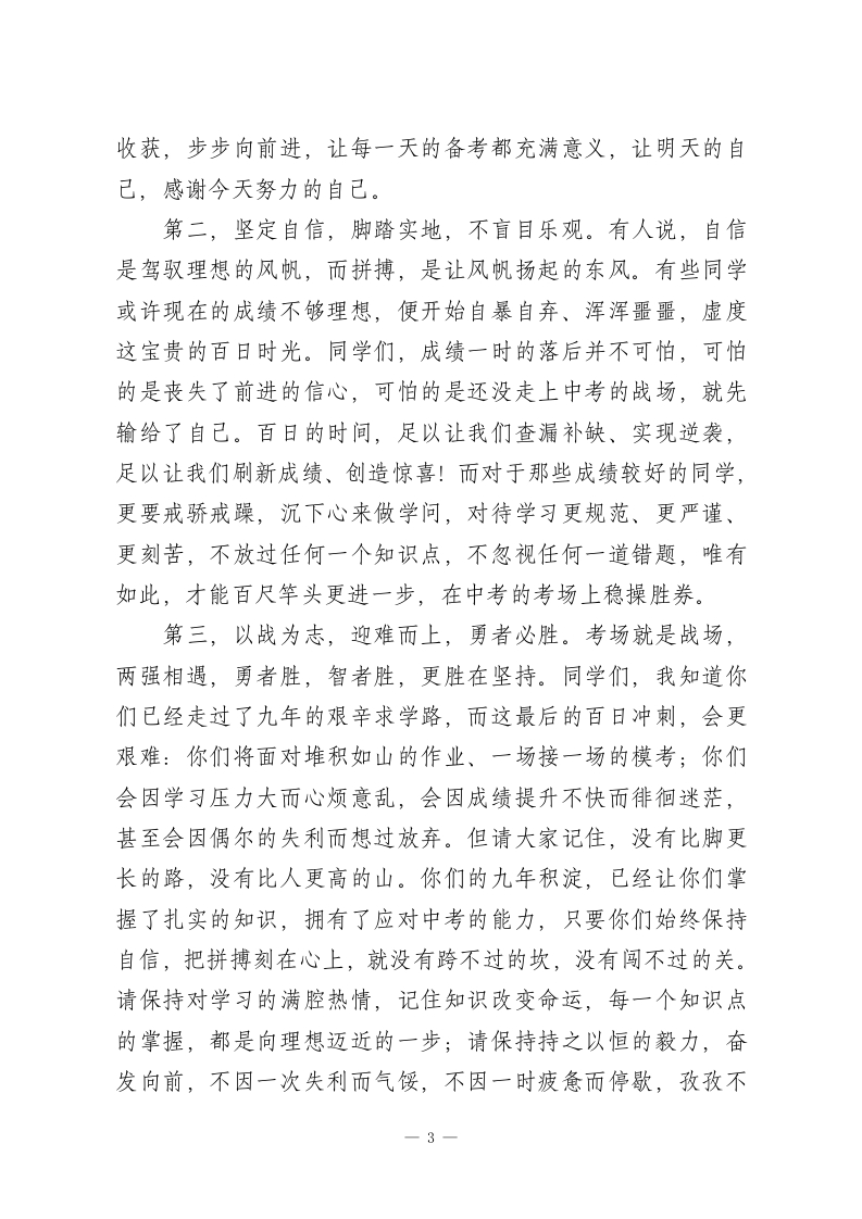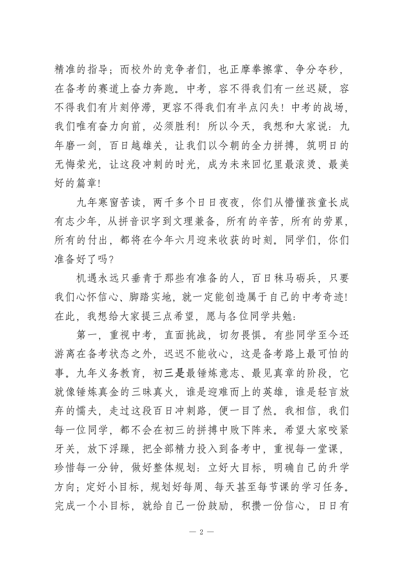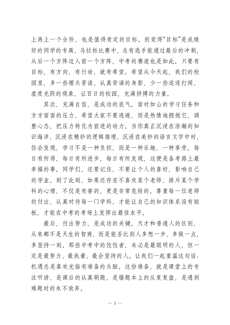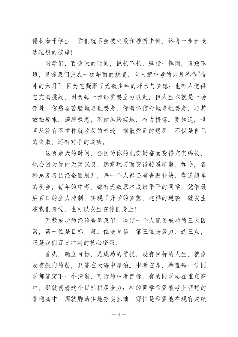 2026年春季学期中考百日冲刺校长励志讲话:九年磨一剑,百日越雄关,以今朝拼搏筑明日荣光亲爱的初三同学们:大家早上好!春潮涌动催奋进,百日冲刺正当时。此刻,我们站在2026年春季学期的关键节点,距离中考仅剩百余天,这一百多天,是九年寒窗的收官冲刺,是你们人生中第一次重要的抉择与考验。中考的答卷,将为你们的九年义务教育画上第一笔浓墨重彩的句号,也将决定你迈入重点高中还是普通高中,决定你踏上怎样的学业新征程,甚至为未来的人生发展埋下第一颗种子。这一次的拼搏,值得我们全力以赴,因为今日的每一滴汗水,都将成为明日最珍贵的回忆。面对即将到来的中考,我知道此刻的你们,心态各有不同:或许有的同学正因成绩暂时不理想而迷茫彷徨,不知道该如何发力;或许有的同学正因百日时光的短暂而心生焦虑,感叹时间不够用;也或许还有少数同学依然浑浑噩噩,不以为然,还在虚度宝贵的备考时光。可是同学们,你们可曾想过,在你们为中考辗转难眠时,父母正为你们的前路心急如焚,默默为你们做好后勤保障,盼着你们能学有所成;在你们挑灯夜读时,我们的老师正承受着备考的压力,精心打磨每一堂课、每一份学案,只为给你们最