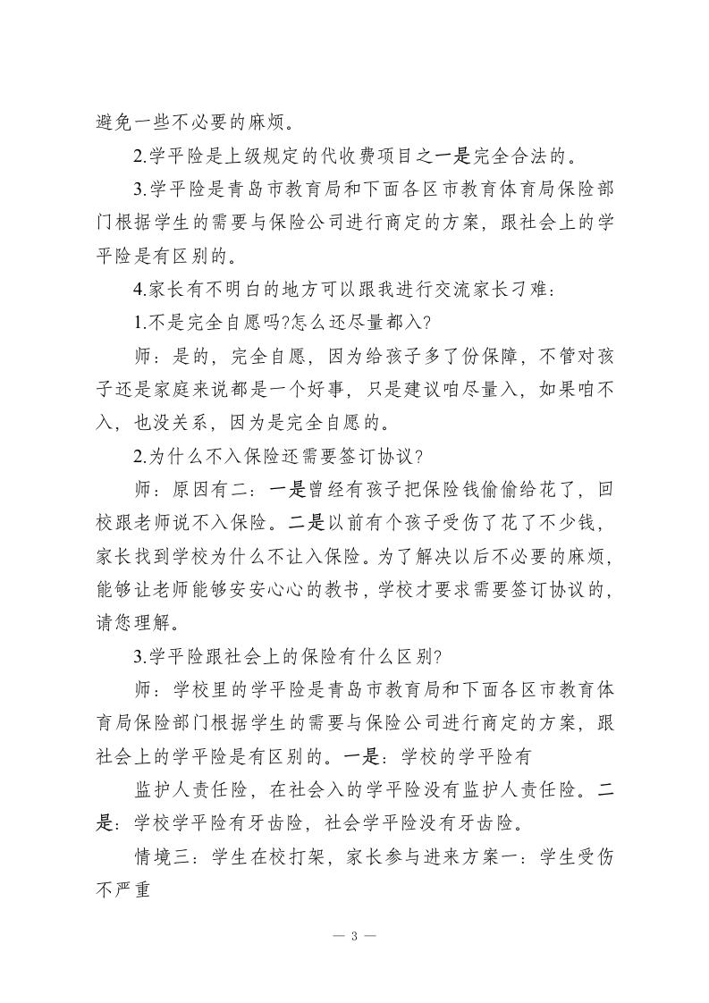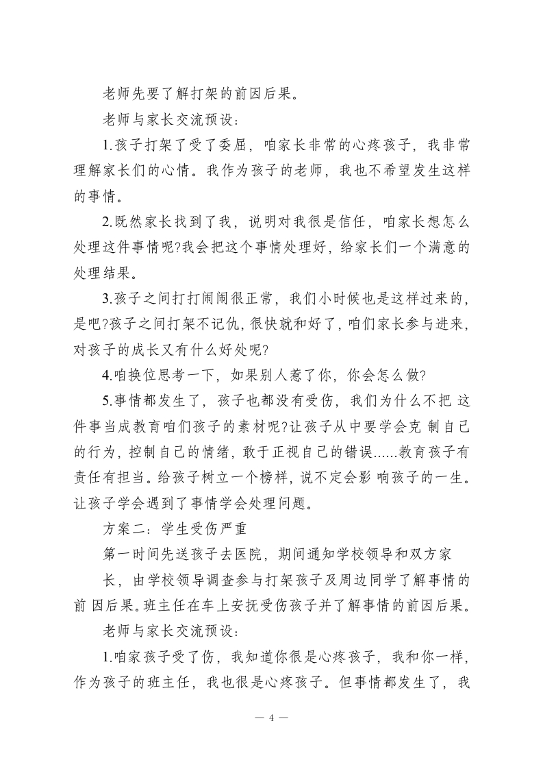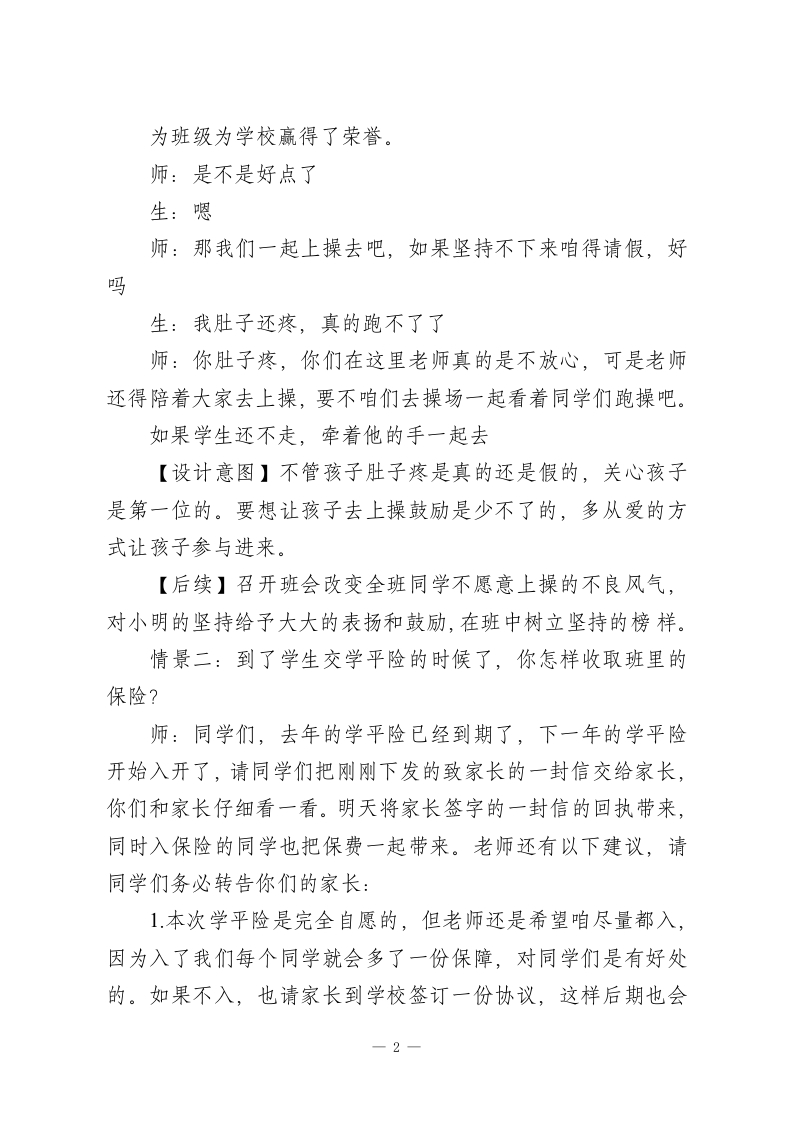 班主任基本功大赛情景模拟情景一:学生向老师请假不愿意上课间操方案一:学生确实不舒服师:小明,怎么了?生:我身体不舒服,向您请假,课间操我不上操了。师:好,可以。用不用去医院看一看,先喝点热水吧,定要多注意身体,如果严重了一定要告诉老师。【设计意图】身体不舒服,父母不在身边,老师就是他最亲近最信赖的人,老师一定要给予关怀,让孩子体验到温暖,关心。【后续】老师让周围同学多关注孩子的身体状况,如病情严重要马上通知老师,让同学们多关注关心到不舒服的同学。老师自己也要多往教室跑一跑,了解情况。方案二:班里最近上操风气不好,有些同学总是找一些理由不上操师:小明,怎么了?生:老师我肚子疼,向您请假,课间操我不上操了。师:严不严重,用不用去医院看看生:不用了师:那好吧,那多喝点热水,以往同学们肚子疼喝上热水一会儿就好了。师:在老师心里你是一个勇敢的孩子,还记得篮球比赛中你摔倒了,腿上流血了,你依然勇敢的坚持去比赛,最后一1