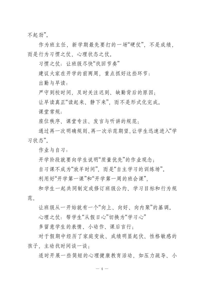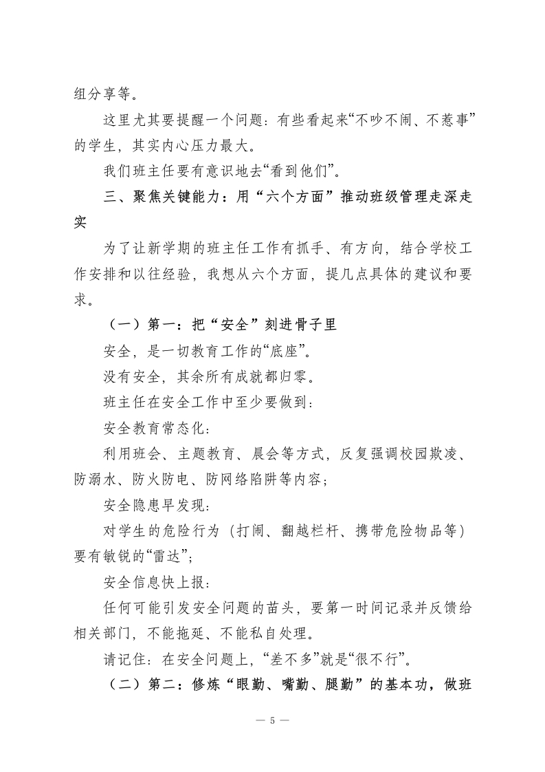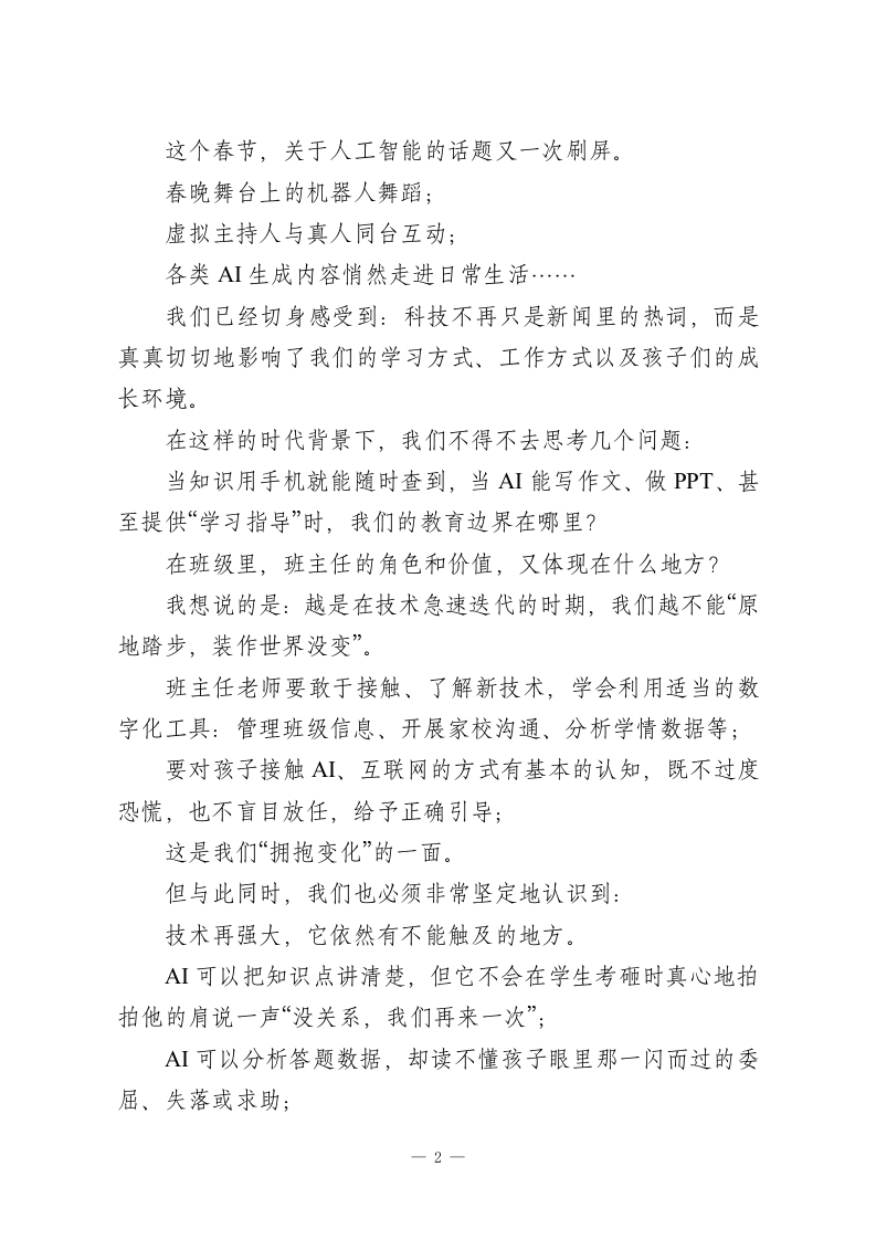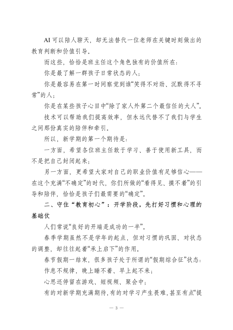 春季开学班主任工作会,校长重点强调8个字:担在肩上,爱在心里!各位班主任老师:大家好!马年新春的喜庆还在空气里回荡,我们已经再次站在了这片熟悉的校园里,迎来了充满希望与挑战的新学期。在这个春意渐浓的日子里,我代表学校,向每一位坚守在班主任岗位上的老师,致以诚挚的问候和由衷的敬意!过去一个学期,大家用爱去温暖、用心去管理、用责任去守护,一笔一画地勾勒出一个个班级的模样。班级秩序的井然有序;学生成绩的稳步提升;各种活动中的积极参与和精彩表现:每一个看得见的成果,背后都有你们无数次的耐心沟通与默默付出。可以说,你们是学校这座大厦最坚实的“承重墙”,也是一届又一届学生成长路上最重要的“引路人”。学校为拥有这样一支有温度、有担当、有战斗力的班主任队伍,感到无比骄傲和感激。今天,我想用“守住初心,拥抱变化”这八个字,和大家分享新学期的一些想法。一、学会“拥抱变化”:在A时代,重新理解班主任的价值-1