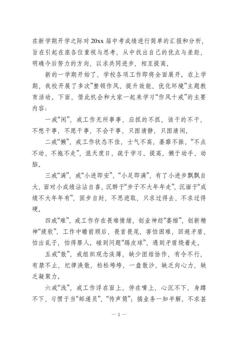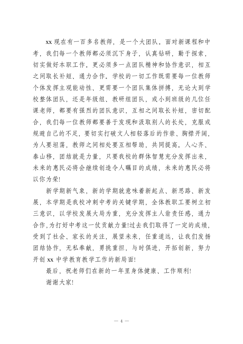 寒假后开学初教师会议上,校长讲话教师之间相处要互相帮助,共同提高老师们:大家新年好!经过了一个平安、轻松愉快的寒假,我们满怀着新的希望迎来了生机勃勃的20xx年春天。在此,我谨代表学校向返校的全体教职工致以崇高的敬意!并向大家拜个晚年,祝愿老师们健康快乐,工作顺利!回首过去的一年,我校在上级主管部门的关心和支持下,师生同心齐努力,一心一意谋发展,谱写了学校发展史上的新篇章,我们在校园建设、办学质量、特色办学以及创建品牌优质学校中,我们均有较大的进步,获得社会各界一致好评。教育教学是学校的生命线,古语有云:以铜为镜,可以正衣冠;以史为镜,可以知兴替。成功来自大家的努力,但纵横向的对比分析和考后的反思也是一股不容大家忽视的促进力量。在20xx年中考中,我校Xx中达线率、录取率仍然取得了全县第一的骄人战绩,这与各位老师的辛勤工作是分不开的。在总均分的对比中,我校总均分全市排名第4,其中,数学、英语、物理、化学、政治、历史这六门学科的排名都维持在第三、四名的水平,然而语文总均分的全市排名在第18名,相对落后。在与Xx县、Xx县、Xx县、Xx县四县的对比中,我校总均分排名第一,数学、英语、物理、化学、政治、历史这六门学科也都是第一名,语文相对落后,在四县对比中排在第七名。可以说,我们的整体成绩是可喜的,语文这一学科的成绩有待提高。1
