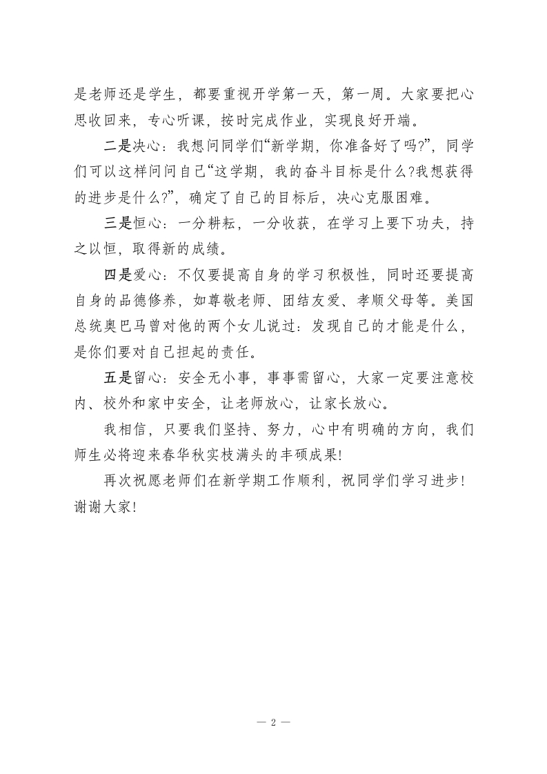 寒假结束,校长在2023春季开学典礼上讲话,希望同学们做到5个心亲爱的老师们、同学们:大家上午好!我们经过了近X天的寒假,度过了一个平安、充实、和美而有意义的寒假,今天是农历正月十五元宵节,也是我们2026学年第二学期开学的第二天。按照传统习惯,过了今天,春节就结束了。借着节日的喜庆,我祝愿全体师生在马年里:身体健康、工作顺利、学习进步、心想事成!回顾过去的一学期,同学们都能按照学校的要求做到文明上学、文明上课、文明集会、文明就餐、文明午休,精神面貌焕然一新;学校各项工作也在全体师生以及家长的共同努力下,取得了长足的发展。今天早上,我在校门口,迎接大家回校,看着老师们精神抖擞、同学们高高兴兴地踏进校门,作为校长,我心中无比激动,这就是我们x人一年轻活力、团结上进的教师队伍,充满生机、充满希望的学子。一日之计在于晨,一年之计在于春。老师们,同学们,过去的成绩记录着我们的勤劳,蕴含着我们的智慧,新学年开始了新形势,面临着新的机遇和挑战。站在更新、更高的起点上,需要全校师生抖擞精神,乘势而上,发扬我们Xx学校的传统:学生进步,家长满意,社会称赞。借此机会,我希望同学们做到“五个心”:一是收心:凡事开头难,良好的开端是成功的一半,无论1