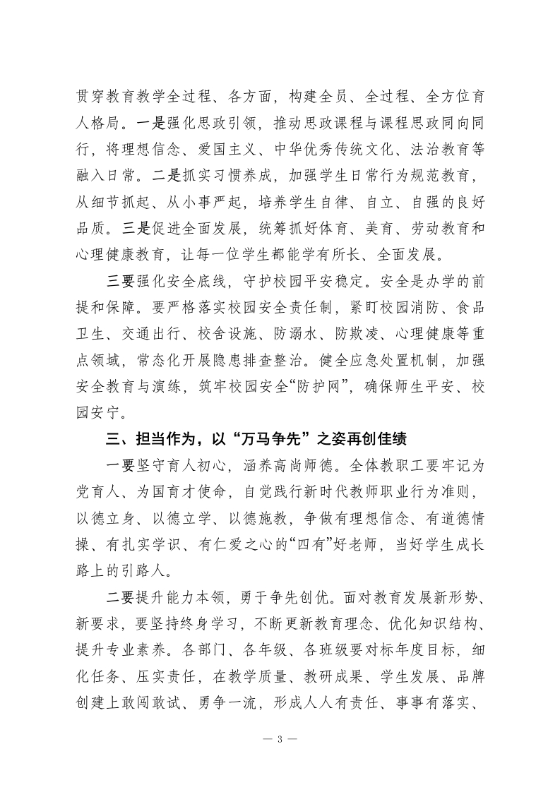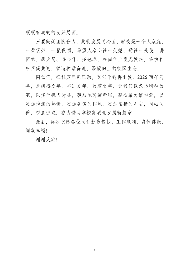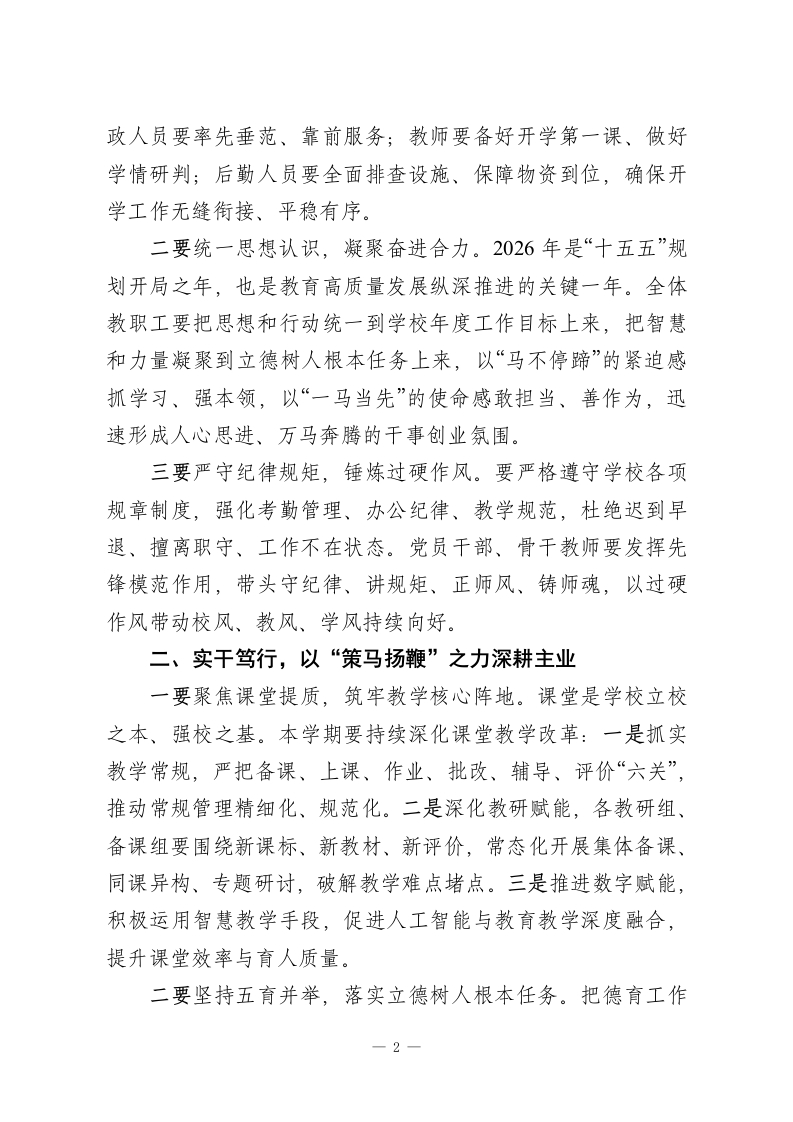 骏马驰骋迎新程,凝心聚力谱华章校长在2026年春节后第一次全体教职工大会暨开学工作部署会上的讲话(2026年2月XX日)尊敬的各位同仁:新春伊始,万象更新。伴随着农历新春的喜庆余韵,我们迎来了充满希望的丙午马年。今日我们齐聚一堂,既是共贺新春的团拜会,更是收心聚力、部署工作的动员会。在此,我谨代表学校领导班子,向全体教职工致以诚挚的新春祝福,祝愿大家马年大吉、万事如意、阖家幸福!回首过去一年,我们携手并进、砥砺前行,在教育教学、人才培养、校园文化、安全稳定等各方面都取得了可喜成绩。每一份成绩,都凝聚着大家的心血与智慧;每一点进步,都彰显着我们团结协作、追求卓越的精神风貌。在此,我向辛勤耕耘在各个岗位的全体同仁,致以最衷心的感谢和最崇高的敬意!新征程的号角已经吹响,新学期的画卷正在展开。下面,我就新学期工作,讲三点意见:一、收心归位,以“骏马奔腾”之势开启新程一要迅速调整状态,实现角色转换。春节假期已然结束,全体教职工要尽快从“假期模式”切换到“工作模式”,克服慵懒散漫,以“满格电”的状态投入新学期各项工作。要以“一日不为、三日不安”的责任感,摒弃“等一等、看一看”的观望心态,杜绝“松口气、歇歇脚”的懈怠思想,做到到岗即履职、开工即冲刺。行-1
