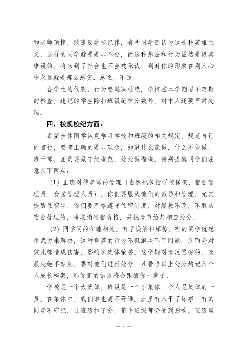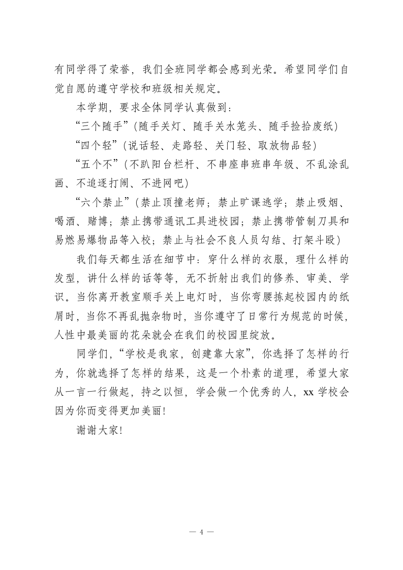 开学初,德育副校长讲话,并在最后要求学生做到三个随手,四个轻,五个不,六个禁止各位领导、老师、同学们:大家上午好!我们刚刚度过了一个充实、愉快而有意义的假期。今天我们怀着愉快的心情,精神抖擞地拉开了新学期学习和工作的序幕。同时也祝老师们在新的学期里工作顺利、万事如意!祝同学们在新的学期里,学习百尺竿头,更进一步!上学期,在校领导、全体老师及同学们的共同努力下,我校的德育工作取得了可喜的成绩。我们的校风班风大有改观,我们学生的行为规范大有进步。在新学期,我们要有新的起点、新的目标、新的任务,新的希望。同学们,不管你过去是好还是差,我们最关心的是你现在表现如何,你能不能把握每一个今天。你过去光荣也好,失败也罢,都已成为昨天,留给你的只应该是教训和经验;新的一学期已经开始,你最需要做的就是赶快给老师、同学留下一个美好的印象。应该勇于告别过去的不足,告别自身的缺点,要不断挑战自我,完善自我,相信自我。一切从头再来,努力在老师和同学们的心中树立一个积极向上、不惧困难、刻苦勤奋的新形象,重塑一个崭新的自我。在此,就学校德育工作,我向同学们提一些要求:一、安全方面:上楼下楼、早操、课间活动、上学放学都要把安全放在第1
