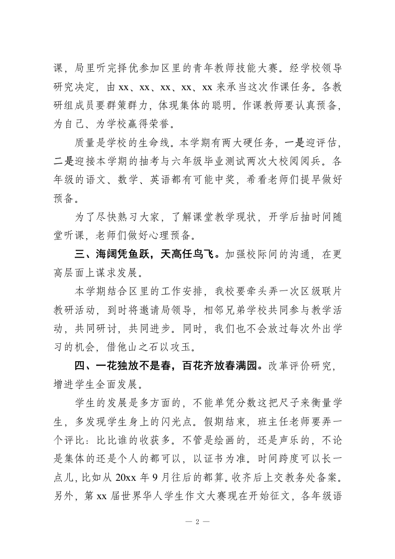 元宵节开教师会议,校长用4句古诗谈了4点精彩建议亲爱的老师们:首先祝大家元宵节快乐!能够有机会与各位同仁一起工作、学习是我的荣幸,我会很珍惜和大家在一起的每天。青山一道同风雨,明月何曾是两乡。我会尽快地融进到Xx小学这个暖和的大家庭中来。新学期伊始,为了使我校教育教学工作再上新台阶,现谈四点建议,不足的地方恳请大家提出宝贵意见。一、问渠哪得清如许,为有源头活水来。课程标准深进人心,进进课堂。怎样教学?教到甚么程度,用甚么方法教,《课程标准》说了算。各年级教研组要组织学习所任学科的课程标准。对课程标准提出的基本理念,设计思路,课程目标,内容标准及课程实施建议做到烂熟于心。本学期各年级在新课标的指导下教育教学改革努力再上新台阶。二、纸上得来终觉浅,尽知此事要躬行。坚持常态化的教学研究,谋求师生共同发展。课堂是教学的主阵地。本学期我校将在教学质量月中推出几节课:骨干教师的示范课;师徒结大对观摩课;其他教师每人一节汇报课。通过说、讲、评、辩、研一系列活动,拉动课改不断向纵深发展。3月X日上午,我校将迎接区里教学视导与评估,要推出工作20xx年之内的五位教师的语、数、英、美、信息技术五节1