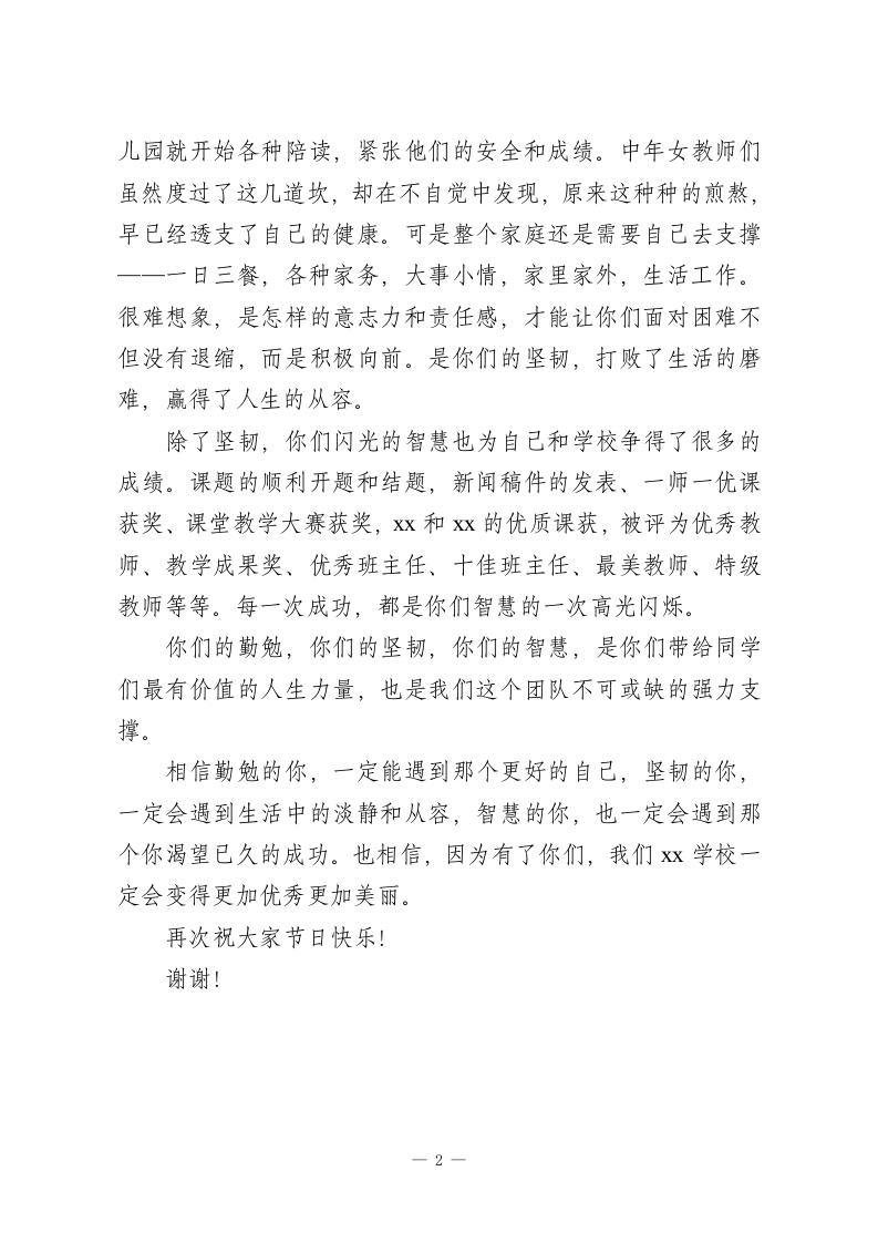 在三八女神节庆祝大会上,农村学校校长重要讲话老师们:今天学校在这里隆重举行巾帼向党绽芳华建功立业新时代尝尝别人家的果子,女神节家庭教育经验分享活动。首先我代表学校祝老师们节日快乐。您辛苦了!刚刚入场的时候,Xx校长和Xx校长向老师们献花,祝贺大家节日快乐。今天的鲜花是中心校特意为大家准备的。让我们用掌声感谢中心校和二位校长对大家的一片心意。老师们,看到你们,我仿佛就看到了你们的勤勉,看到了你们的坚韧,看到了你们的智慧。往事历历在目。大雪封地,是你们在顶风冒雪,清扫通道;黎明未启,是你们站在讲台陪伴学生早读;黑夜来临,晚自习的教室里是你不曾停歇的身影。校门口,校车旁,餐厅里、托管室、教室里、办公室、报告厅,你们的足迹遍布在校园的角角落落,同时也记录了你们一路走来洒下的滴滴汗水。勤勉是优秀者的通行证。正是这份勤勉,换来了我们学校xx省平安校园、全国新教育优秀实验学校、x市优秀家委会学校、新华杯征文优秀组织奖、文艺汇演获奖等等一张张亮丽的名片。我20xx年下学期再次来到我们学校。经历过最多的事情之一就给女老师批产假。在我看来,女老师们特别不容易。孕早期的生理反应,孕中期的小心翼翼,产检中的各种担心,孕后期的行动不便和缺钙抽筋,产后哺乳的各种熬夜,从孩子上幼1