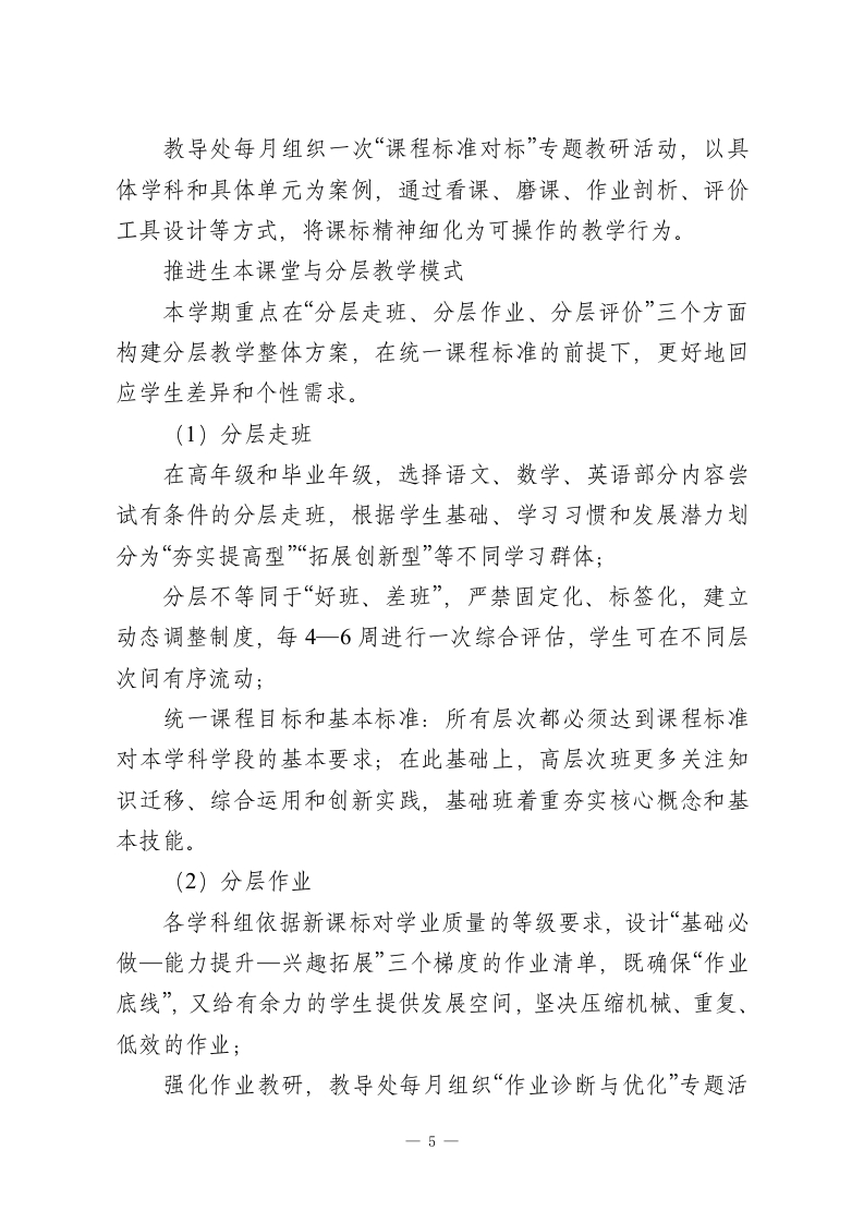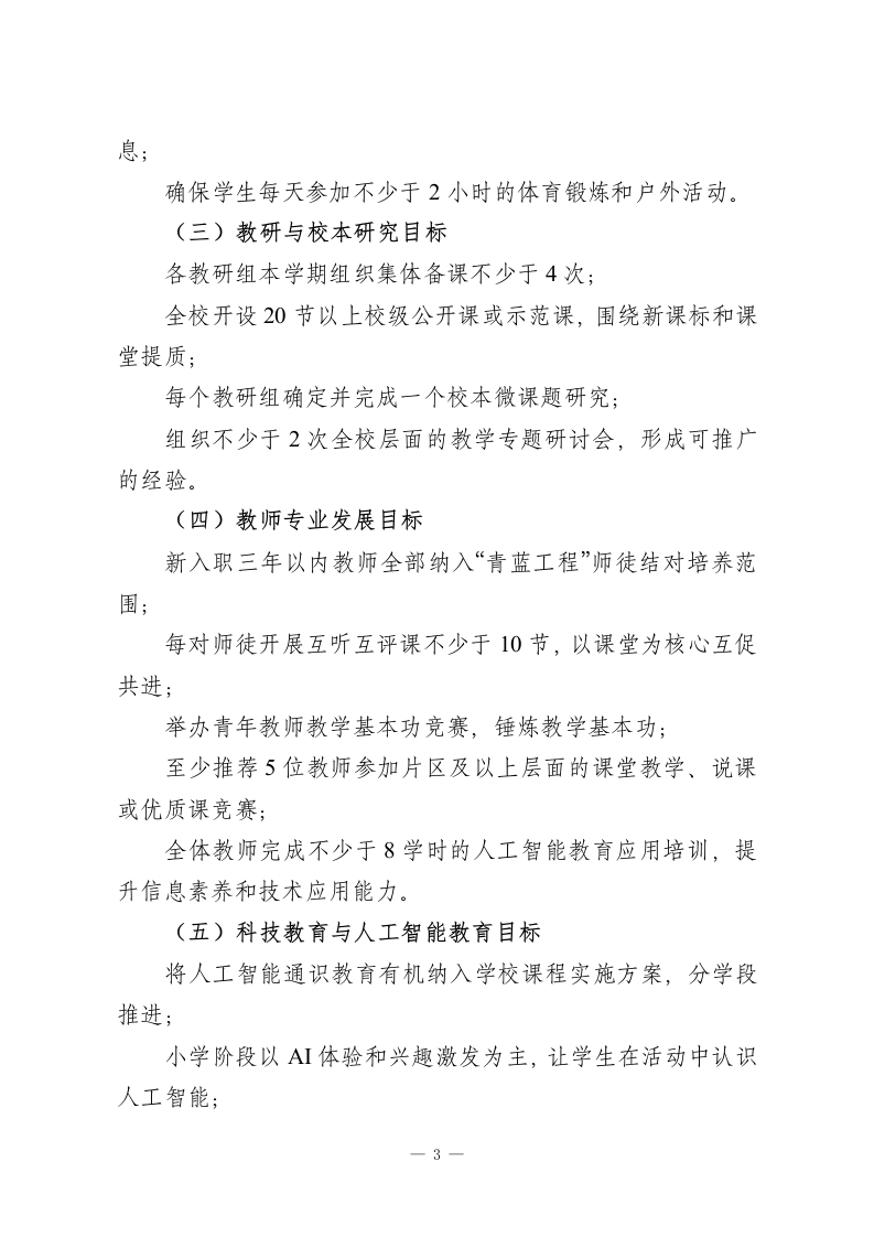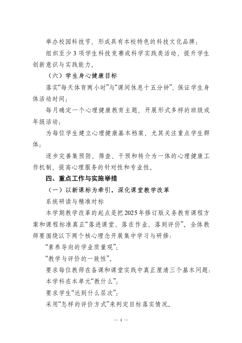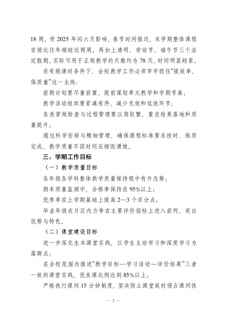 26春季期教学教研工作计划及安排表:78个教学日如何用出高质量?一、总体思路与工作导向本学期各项教学与教研工作,立足《教育强国建设规划纲要(2024一2035年)》的总体部署,坚持以立德树人为根本任务,以提高课堂效率和教育教学质量为主攻方向。紧扣教育部近期出台的《进一步加强中小学生心理健康工作十条措施》《关于实施学生体质强健计划的意见》《关于加强中小学科技教育的意见》《中小学人工智能通识教育指南(2025年版)》以及2025年修订的义务教育课程方案和课程标准等政策要求,统筹推进课程改革与学校实际深度结合。本学期工作的主线概括为三条:课堂提质一围绕新课标优化课堂结构,落实“教学评一致性”,推进生本课堂常态化;科技赋能一一以信息技术和人工智能为抓手,重构教学方式和学习方式:身心并进一一在健康第一理念引领下,同步抓好体质提升与心理健康教育。在此基础上,坚持五育并举,着力培养学生的核心素养和关键能力,进一步提升办学质量和社会满意度,努力办人民满意的基础教育与职业教育。二、学期基本情况与形势研判2026年春季学期自3月4日开学,至7月上旬结束,共计1