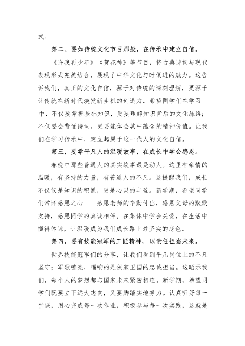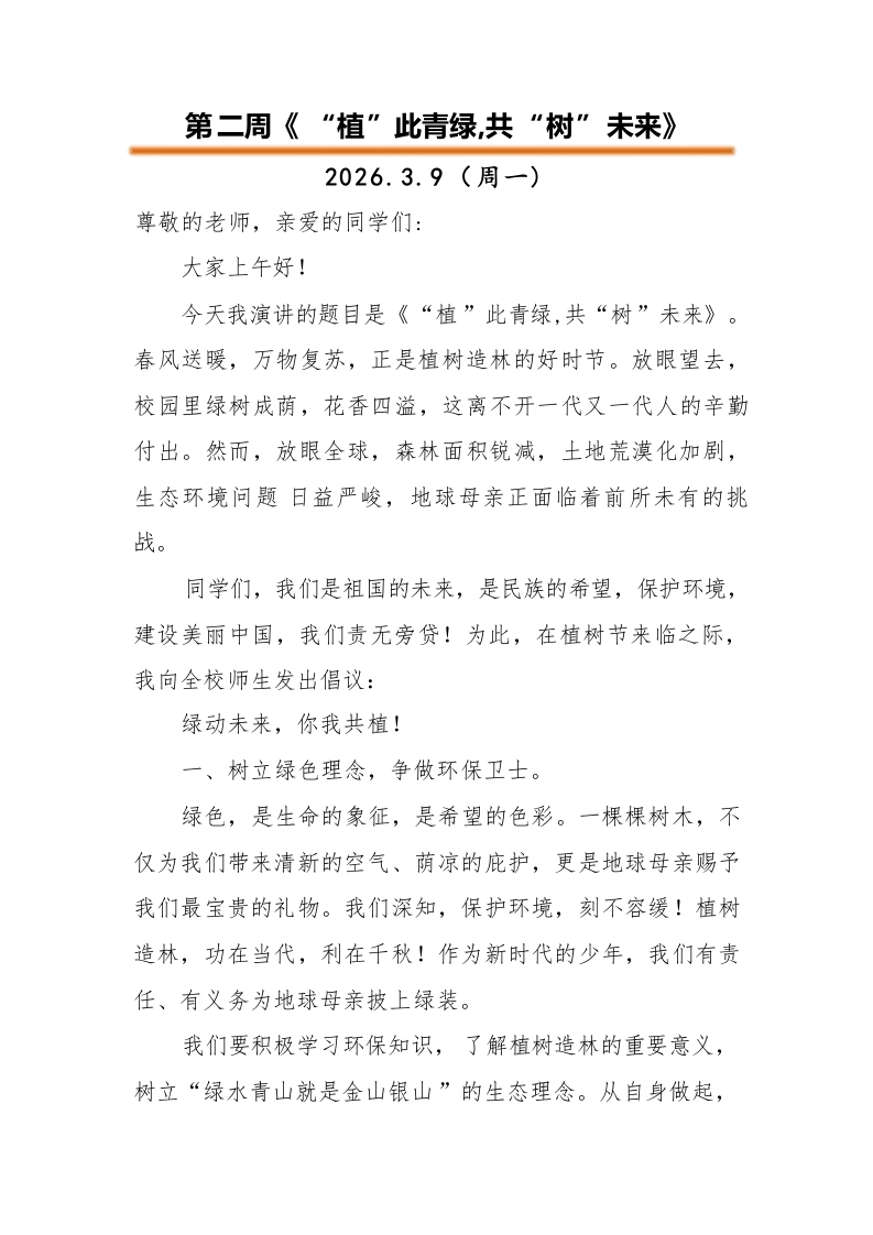 2026年春季中小学升旗仪式演讲安排表、演讲稿(建议收藏备用)上课次天数日期内容主讲人备注2天3.4春日逐梦织华章,骐骥驰骋梦续航六1班校长寄语5天3.9“植”此青绿,共“树”未来六2班3.12植树节三5天3.16一规一矩养正气,一言一行促成长六3班四5天全国中小学生安全3.23与春风相伴,与安全同行六4班教育日五5天3.30在缅怀中传承,在春光里成长六5班4.4清明节六5天4.7不负“食”光,俭以养德五1班七5天4.13科技筑梦启心智,少年立志强家国五2班八4天4.20字里行间藏星河,阅读点亮少年梦五3班4.23世界读书日九5天4.27以劳为美,向光而行五4班5.1劳动节十5天5.6岁月有痕,母爱无声五5班母亲节5天5.11防灾记于心,安全践于行四1班5.12防灾减灾日十4天5.18谦谦有礼,温润时光四2班十三4天5.25心灵洒满阳光,成长一路芬芳四3班5.25心理健康日十四5天6.1童心飞扬梦启航,多彩六一绽光芒四4班6.1儿童节十五5天6.8遵纪守法,敬畏规则四5班十六5天6.15粽香传古韵,端午共传承三1班6.19端午节十七4天6.22“复”之有道,“习”之有效三2班十八5天6.29快乐暑假,安全一夏三3班校长/总务主任