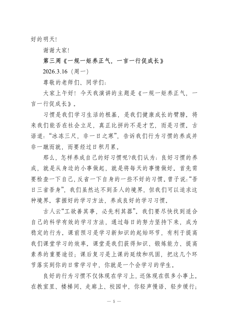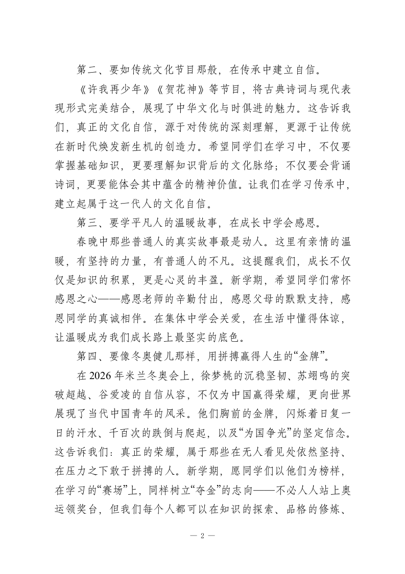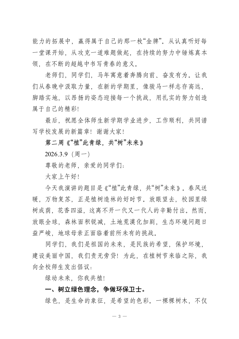 2025-2026第二学期升旗仪式演讲稿(18周):春日逐梦织华章,骐骥驰骋梦续航第一周《春日逐梦织华章,骐骥驰骋梦续航》2026.3.4(周三)亲爱的同学们、老师们:大家上午好!春日逐梦织华章,骐骥驰骋梦续航。在这生机勃发的季节里,我们满怀憧憬回到美丽校园,共同开启新学期的征程。首先,我谨代表学校向全体师生致以最诚挚的祝福:祝老师们马年一马当先、事业有成、工作顺利;祝同学们马不停蹄、学业精进、身体健康!新的一年刚刚开始,马年春节众多精彩的元素已如繁星般照亮我们的视野,为我们带来丰富的启示。这些元素如同不同的音符,将奏响我们新学期成长的旋律。今天,我想从四个方面与同学们分享,希望能助力大家在新学期茁壮成长。第一、要像机器人舞者那样,将精准与创新融入学习。今年春晚上,机器人与武术演员的精彩互动让人印象深刻。机器人完成每个动作都需要精准的程序设计,而它与演员的配合又展现了创新的艺术表达。这启示我们,学习既要有机器人般的精准态度一一认真对待每一个知识点,做好每一次作业;也要有突破边界的创新精神一一不满足于标准答案,敢于提出新问题、探索新方法。希望同学们在新学期,既要有严谨务实的学习态度,也要保持开放创新的思维方式。1