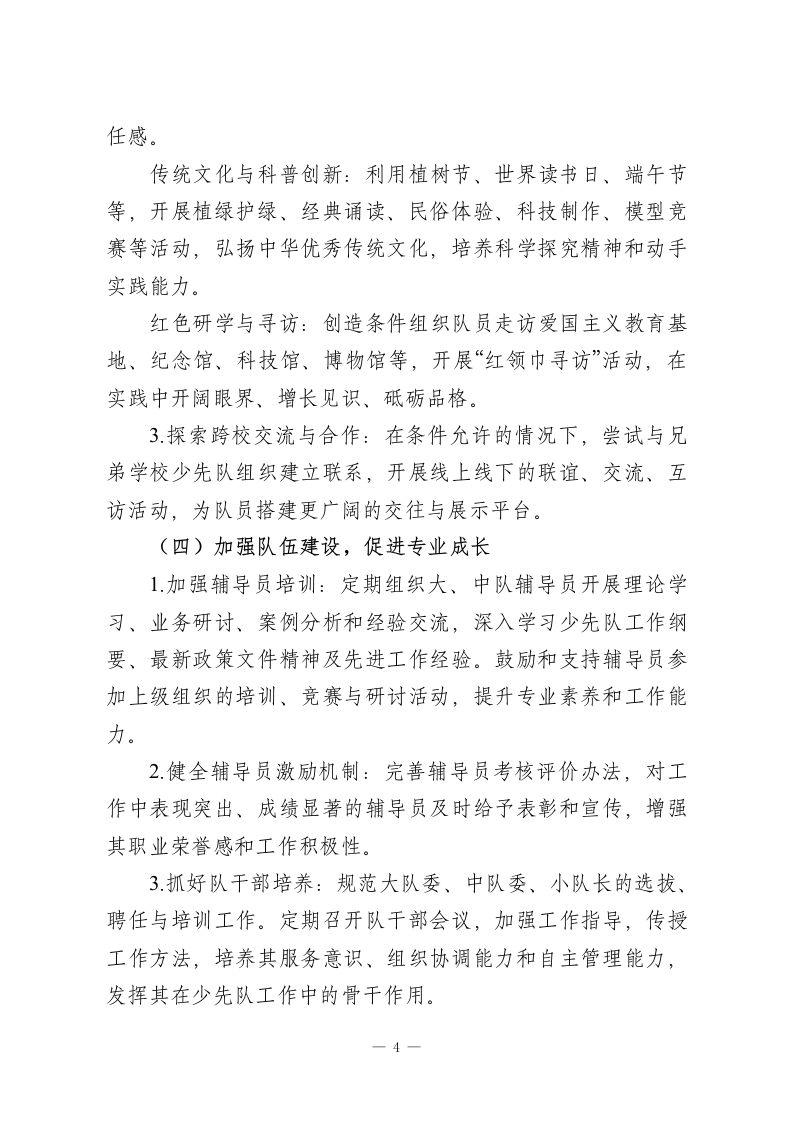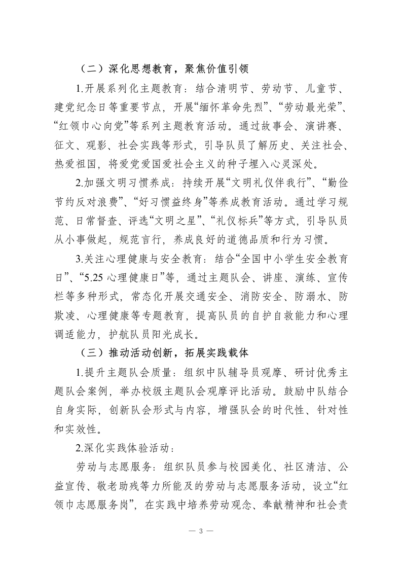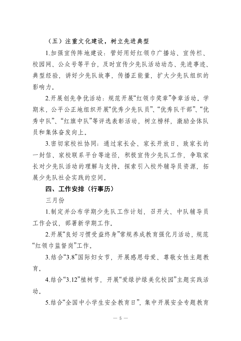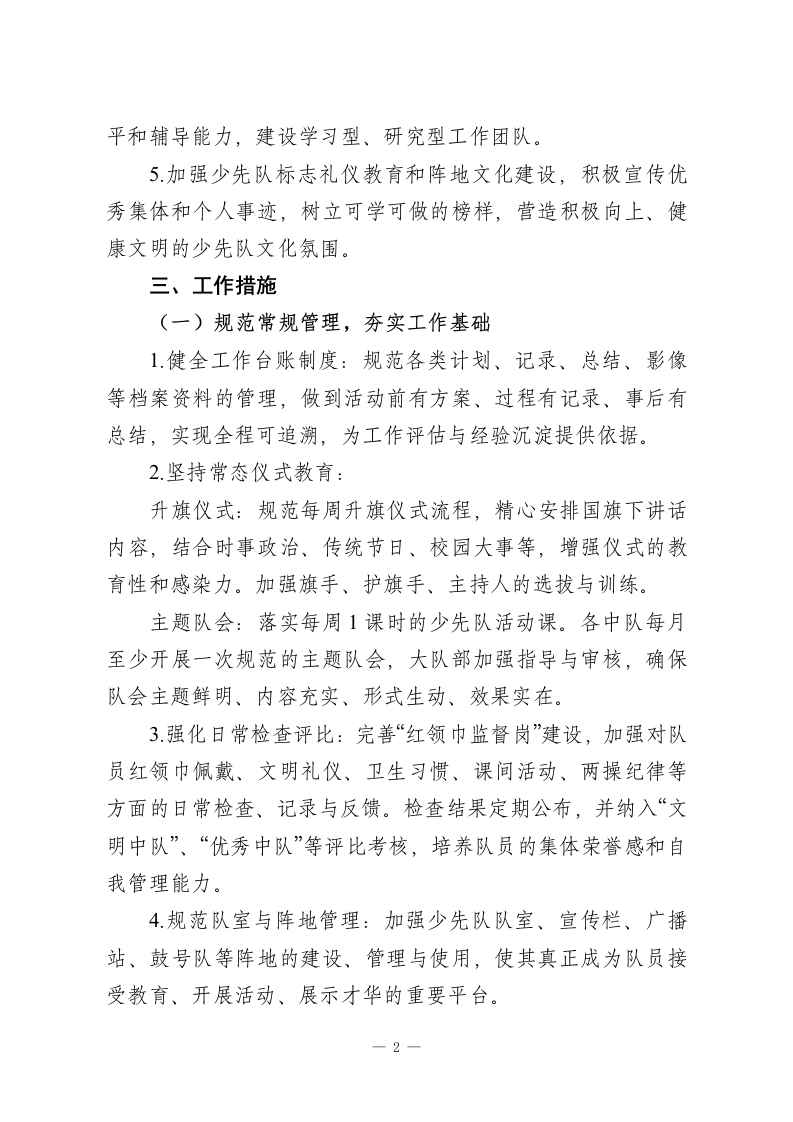 2025-2026学年第二学期少先队工作计划:骐骥追风启新程,骁勇逐梦向光行一、指导思想把每一件简单的事做好,就是不简单;把每一件平凡的事做好,就是不平凡。本学期,少先队工作将坚持组织教育、自主教育、实践教育相统一,以爱国主义教育为核心,以文明习惯养成教育为基础,以丰富多彩的主题活动为载体。聚焦少先队政治启蒙和价值观塑造主责主业,加强少先队基础建设,激发基层组织活力,创新活动形式与内容,服务引领广大少先队员勤奋学习、快乐生活、全面发展,努力成长为堪当民族复兴大任的时代新人。二、工作目标1.规范各项队务管理制度,抓实过程性检查与反馈,推动少先队工作制度化、规范化、常态化运行,增强组织的凝聚力与战斗力。2.充分利用重大节庆纪念日,深入开展爱国主义、集体主义、社会主义核心价值观和中华优秀传统文化教育,强化对少先队员的政治启蒙和思想引领。3.精心设计和开展内容鲜活、形式新颖、吸引力强的主题实践教育活动。拓展校内外实践阵地,深化劳动教育、志愿服务、科技创新、文体艺术等活动,全面提升队员综合素质。4健全大、中、小队干部选拔培训机制,发挥队员自主性。加强辅导员队伍的专业学习与培训,提升其政治素养、理论水1