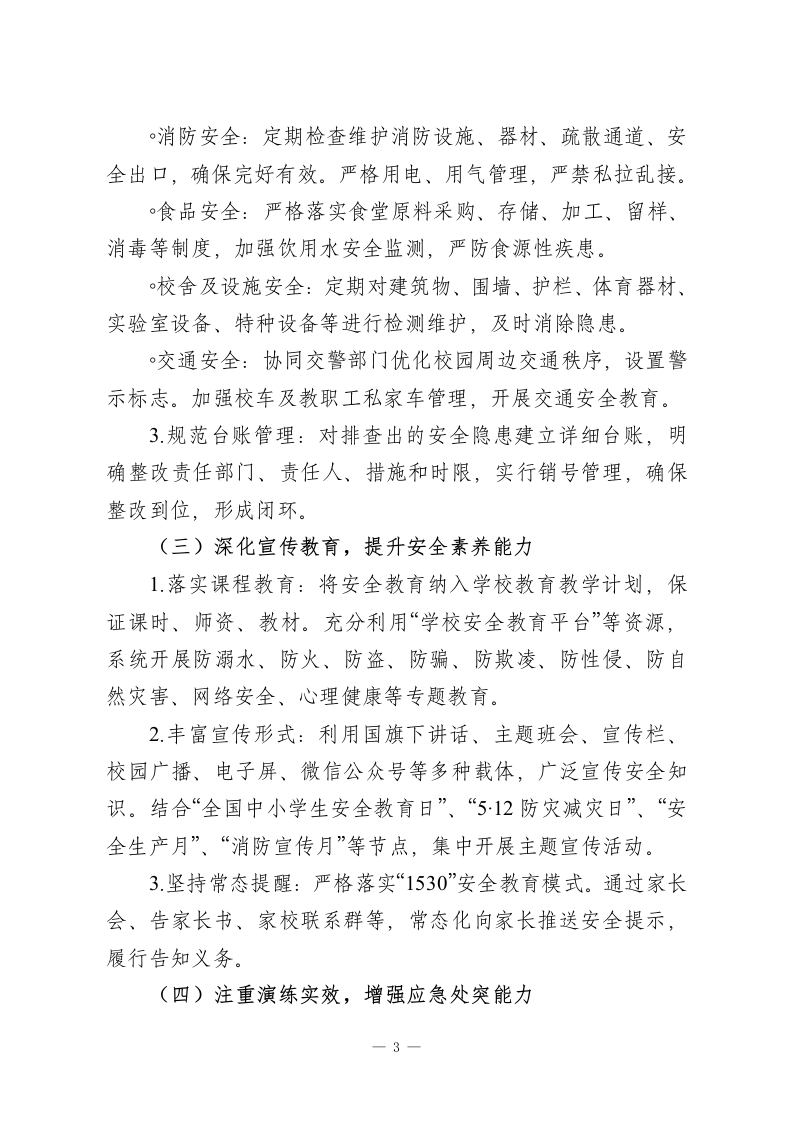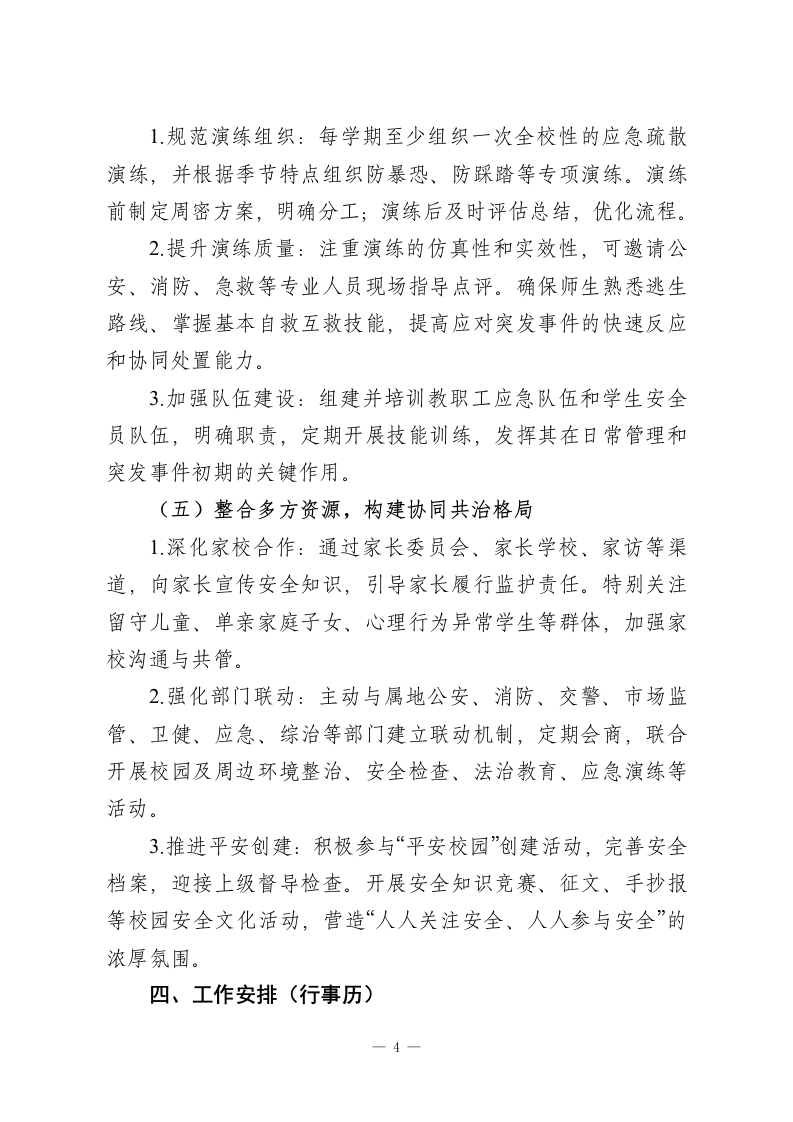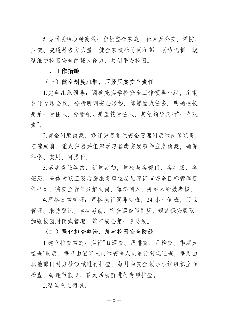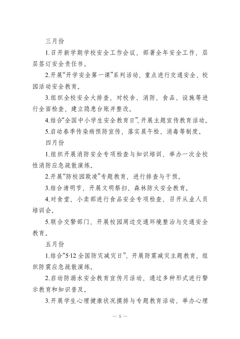 2025-2026学年第二学期学校安全工作计划:春启新程逐梦远,骐骥踏歌向未来一、指导思想征途漫漫从头越,奋楫逐浪向未来。本学期,学校安全工作将继续坚持“安全第一,预防为主,综合治理”的方针,牢固树立“生命至上,安全发展”的理念。通过健全制度、压实责任、强化教育、排查隐患、提升应急能力,构建“人防、物防、技防”紧密结合的立体化安防体系,推动形成“党政同责、一岗双责、齐抓共管、失职追责”的安全工作格局,努力营造一个让师生安心、家长放心、社会满意的平安和谐校园环境。二、工作目标1.进一步完善学校安全工作领导机制,层层签订安全责任书,明确并压实各部门、各岗位的安全管理职责,确保安全责任全覆盖、无死角。2建立常态化安全隐患排查整治机制,聚焦消防、食品、交通、设施设备、防溺水、防欺凌、心理健康等重点领域,做到隐患早发现、早报告、早控制、早消除。3持续加强校园“三防”建设,配齐配足安保人员和防护器械,确保视频监控、一键报警等技防设施运行良好、覆盖全面,提升校园整体防控水平。4通过形式多样、内容扎实的安全教育和应急演练,增强全体师生的安全防范意识、法治观念和自护自救、应急避险能力,使“时时讲安全、事事为安全”成为自觉。1