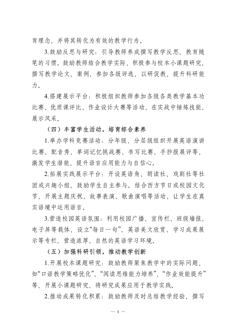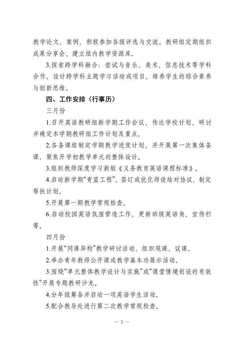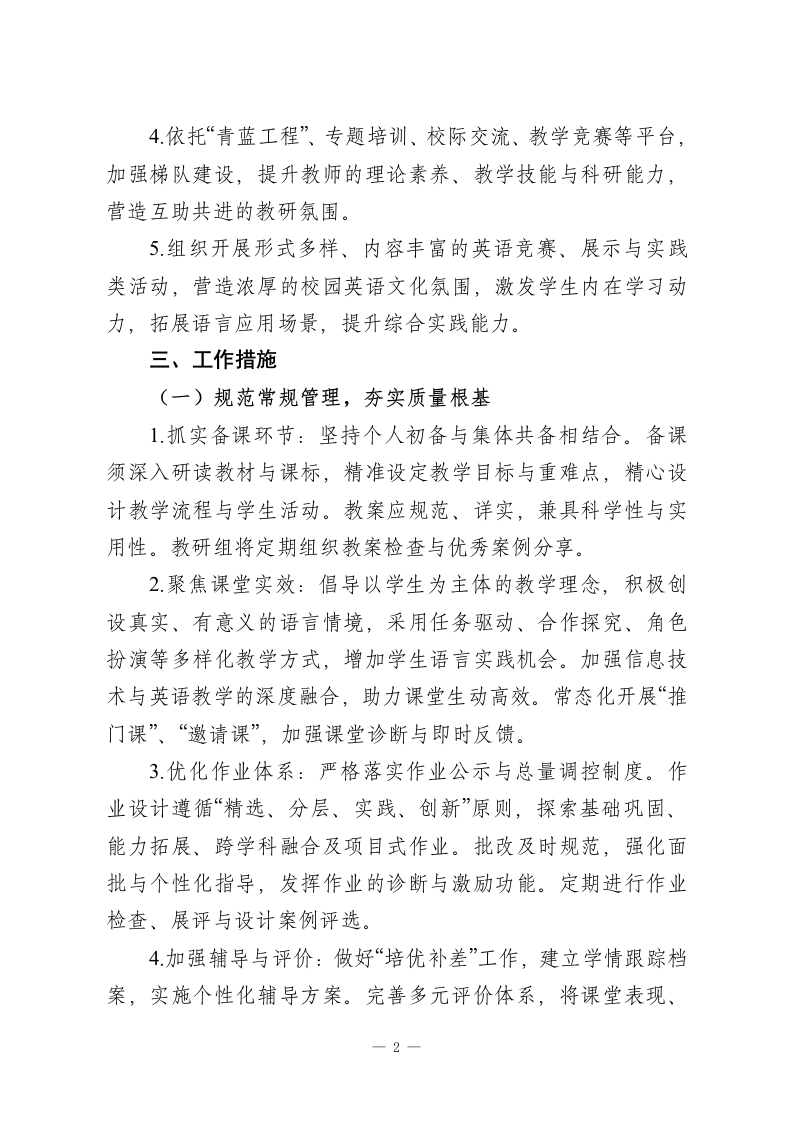 2025-2026学年第二学期英语教研组工作计划:骐骥驰骋风华起,星光璀璨赴新程一、指导思想每一粒萤火都是炬火,每一条来路总有出路。本学期,英语教研组将以学校整体教学工作部署为指导,深入贯彻新版《义务教育英语课程标准》理念。以提升学生英语核心素养和教育教学质量为核心目标,以规范教学常规管理为基础,以深化课堂教学改革为动力,以促进教师专业发展为支撑。通过抓实常规教学、深化校本教研、创新学生活动、加强团队协作,积极探索情境化、任务型的高效课堂模式,激发学生学习兴趣,培养学生综合语言运用能力与文化意识,推动教研组工作持续、优质发展。二、工作目标1严格执行教学各环节规范,优化备课、上课、作业、辅导与评价流程,通过精细化管理与常态化检查,保障基础教学质量稳固提升。2.以新课标理念引领课堂变革,深入开展单元整体教学、教学评一致性实践。通过多样化的听、评、研课活动,切实提高课堂教学的针对性、互动性与实效性,促进学生语言能力、思维品质等核心素养发展。3.系统研究并实施分层、弹性、实践性作业,严格控制总量,提高设计质量。加强作业批改的规范性与反馈的指导性,切实减轻学生过重课业负担,实现“轻负高质”。1